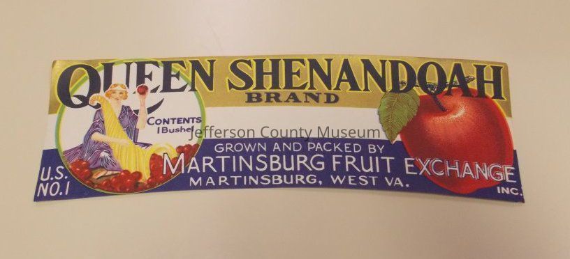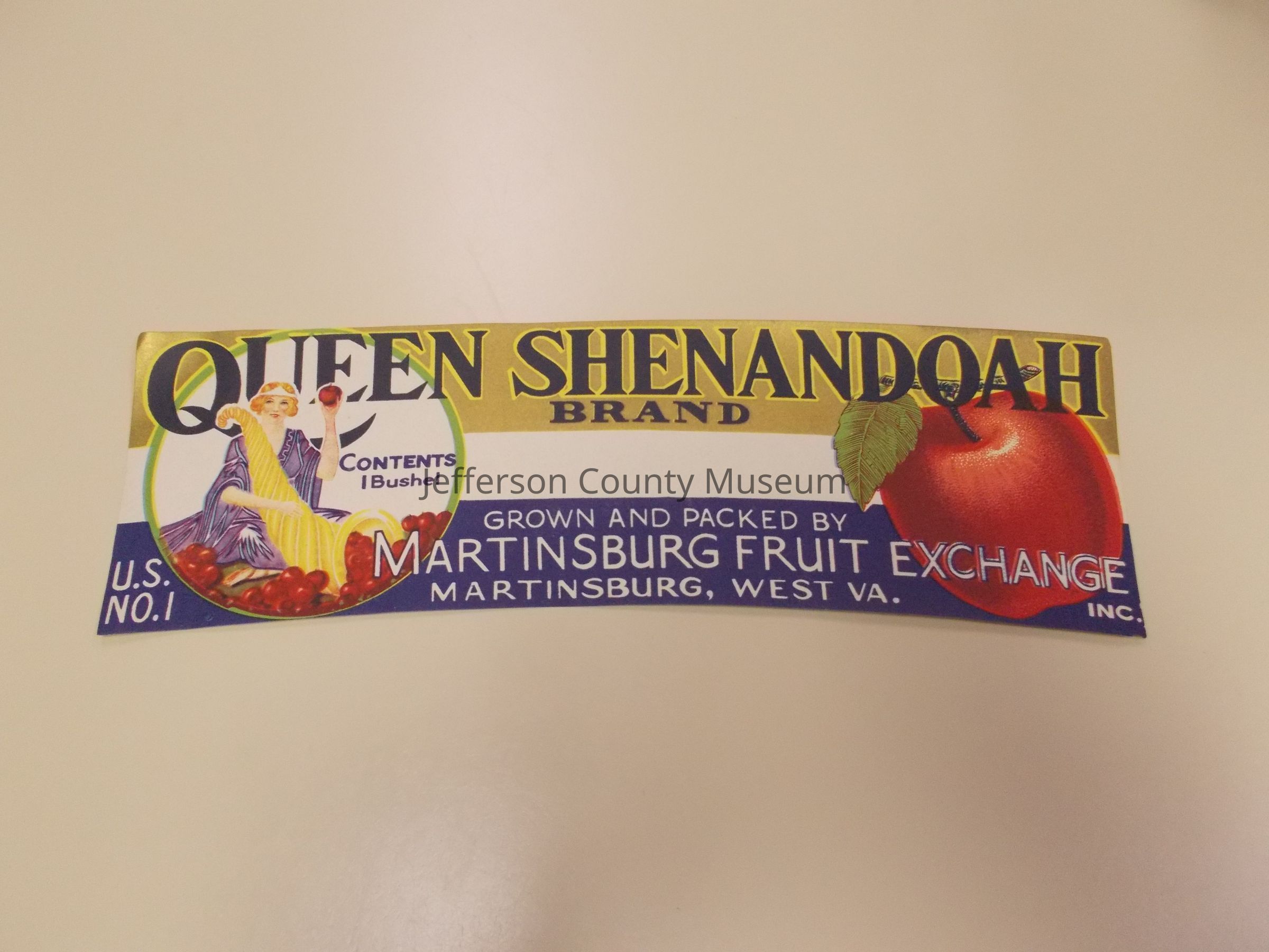 Paper label, likely once attached to a produce box or barrel. Label advertises Queen Shenandoah apples. One side of the label includes a drawing of a woman wearing a blue gown and a golden crown; she is holding an apple up in one hand, and a cornucopia of many apples in the other. The other end of the label includes a closeup picture of an apple. Both images are connected by a blue, gold, and white striped background, and are surrounded by text that reads: QUEEN SHENANDOAH BRAND; CONTENTS 1 BUSHEL; U.S. NO. 1; GROWN AND PACKED BY MARTINSBURG FRUIT EXCHANGE INC. MARTINSBURG, WEST VA.Acquisition