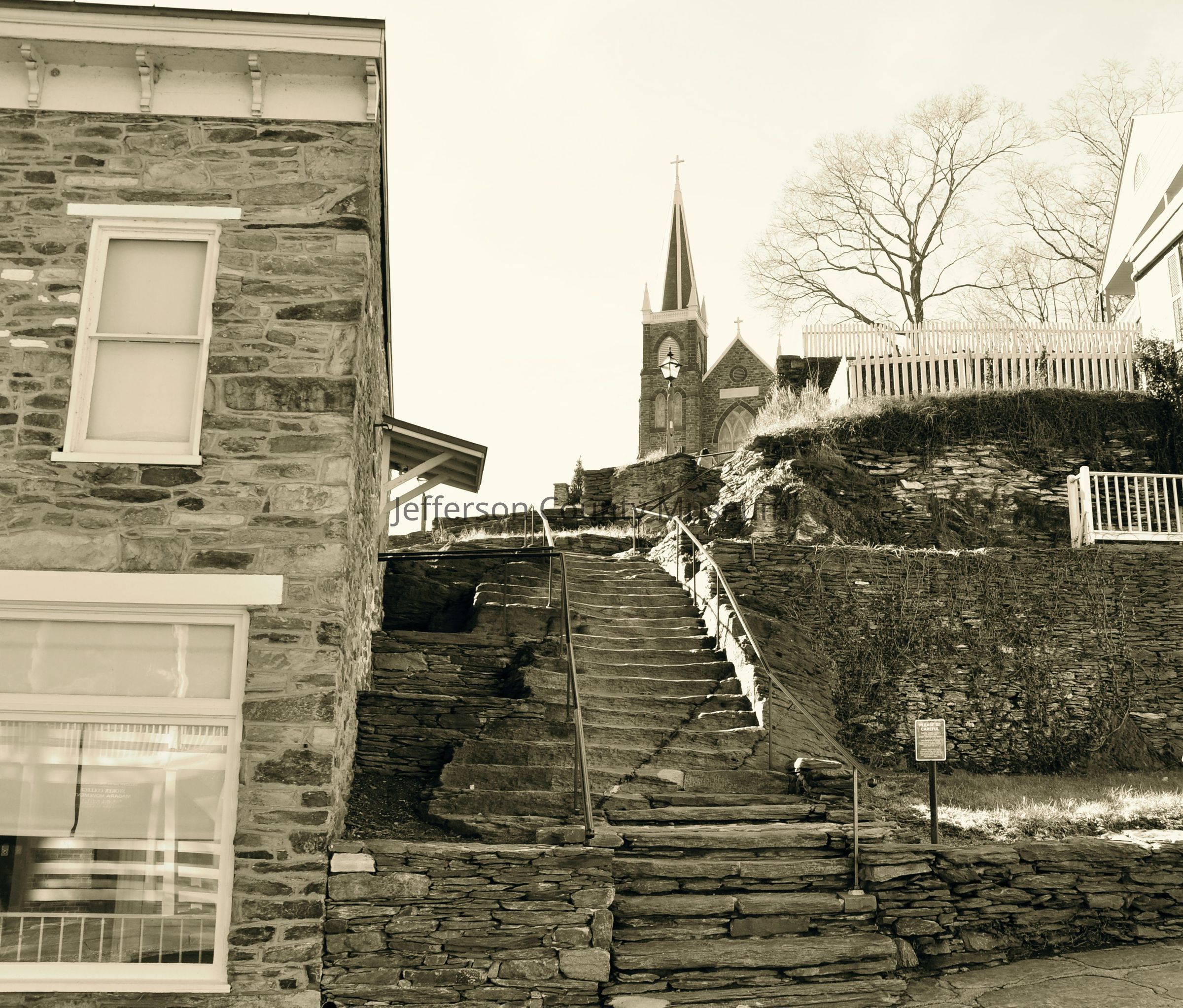 Upper photo: Scene in Harpers Ferry circa 1900 before the Park Service took over in 1951. Stone steps leading to St. Peter's Catholic Church. (IMG255)