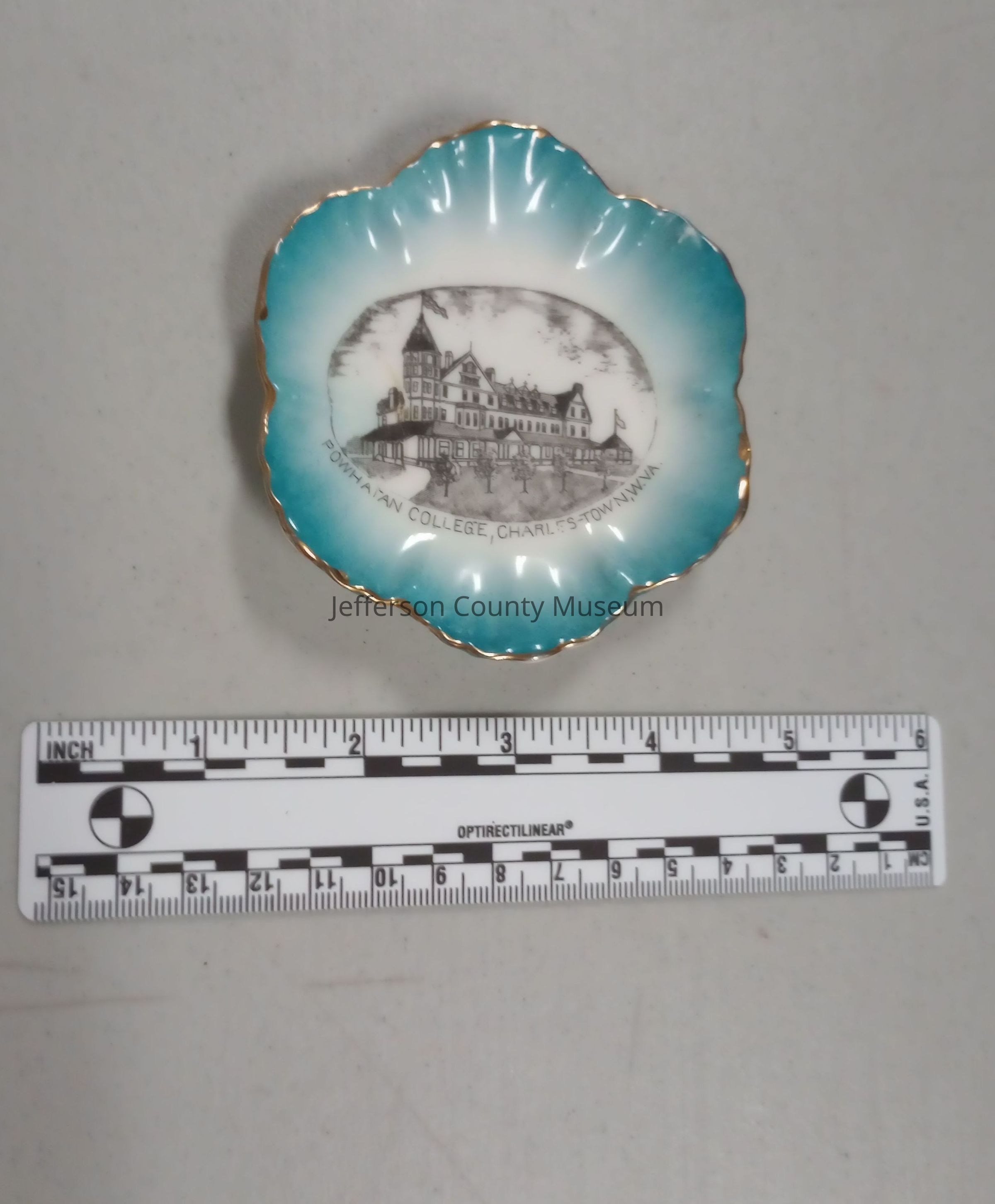 Small porcelain candy dish with an image of Powhatan College and the caption "Powhatan College, Charles Town, W. Va." Made for Charles W. BrownAcquisition
