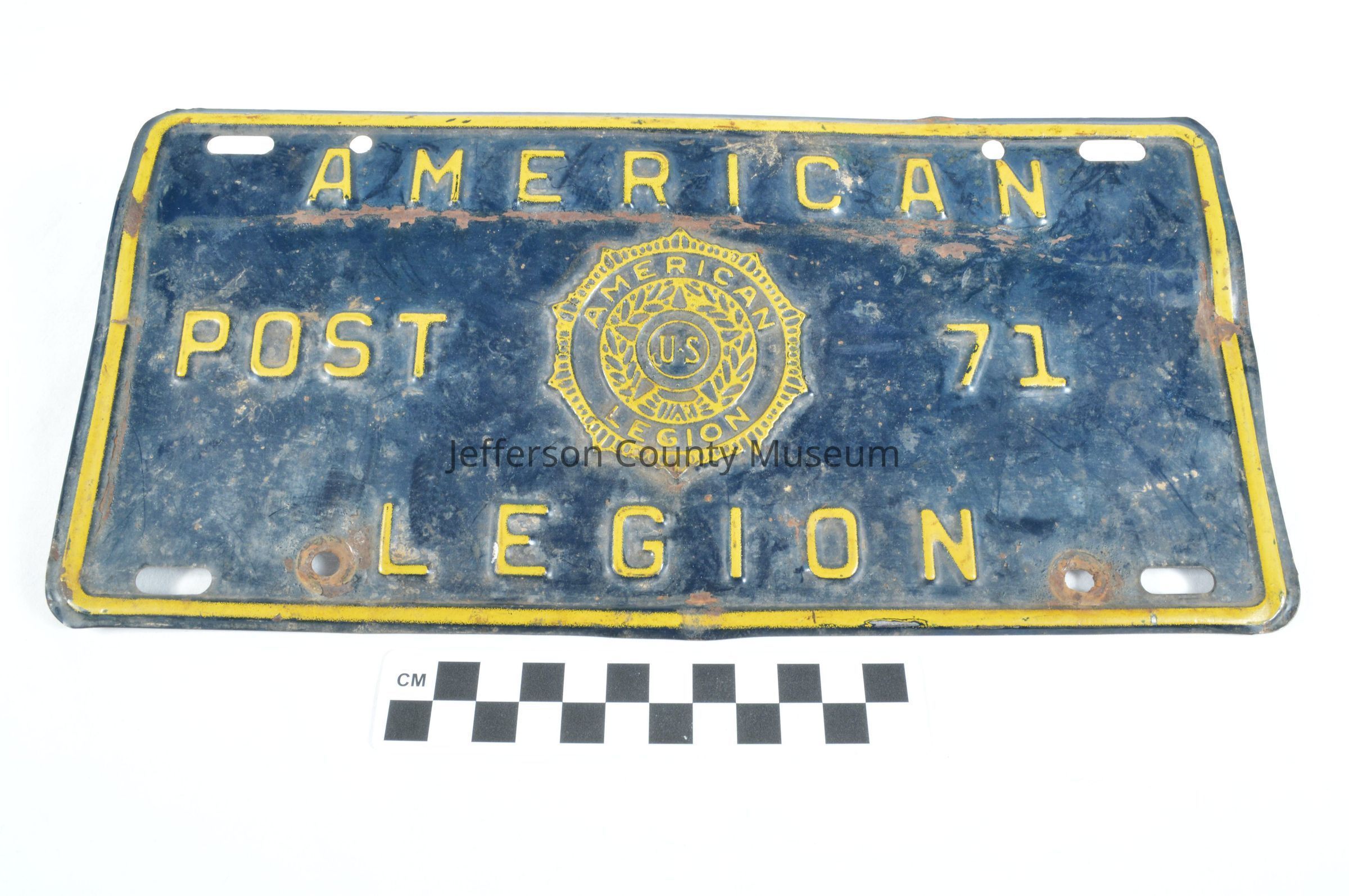 Dark blue American Legion license plate with yellow numbers and letters. On plate is "AMERICAN LEGION POST 71" with round American Legion symbol in center. Plate is surrounded by a yellow border.Acquisition