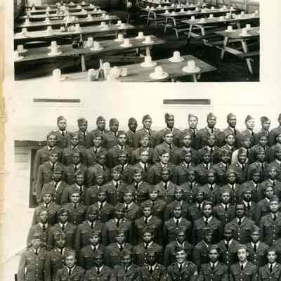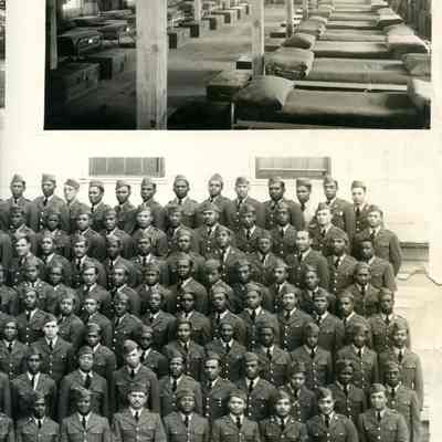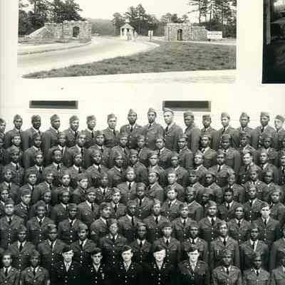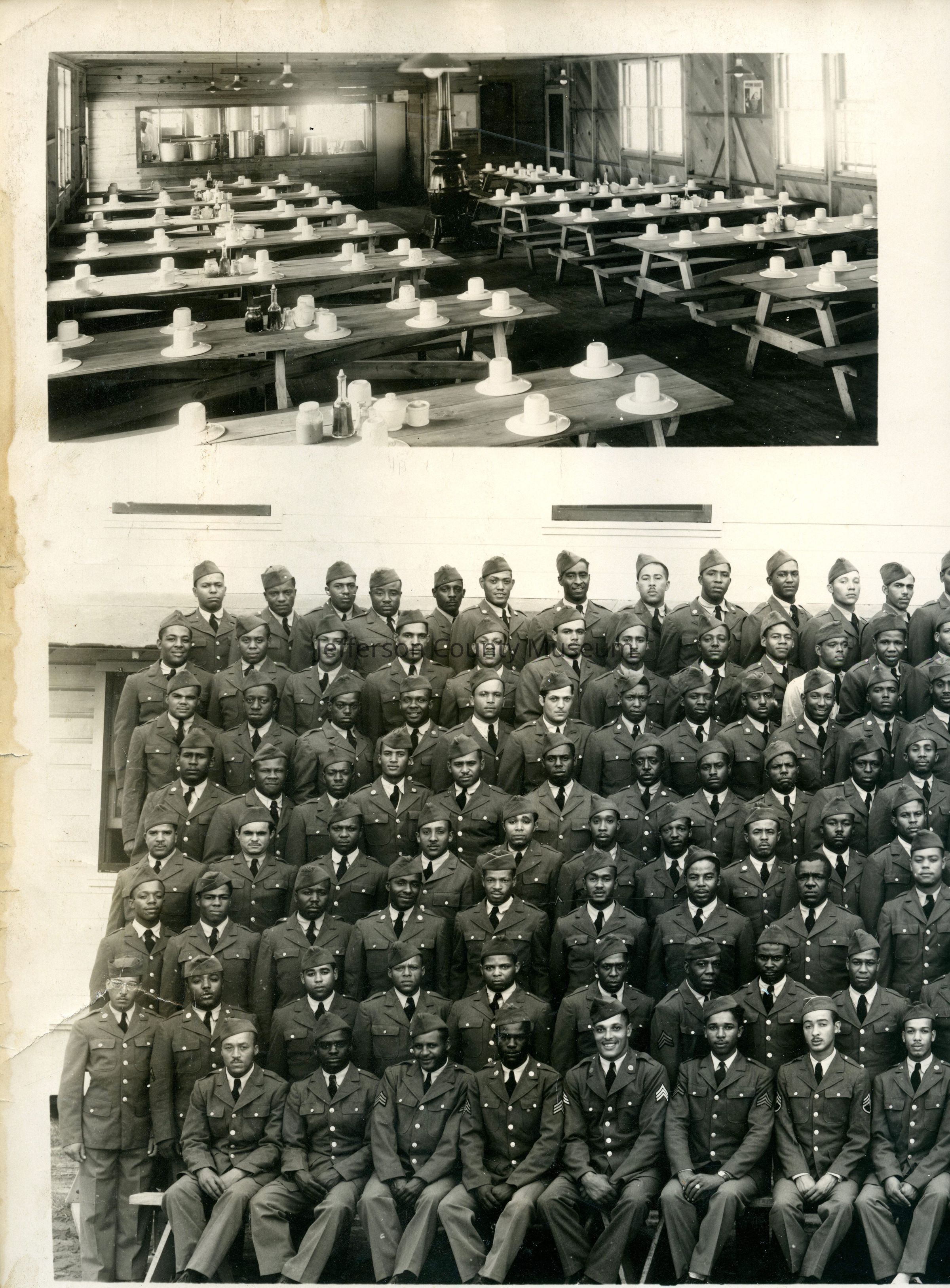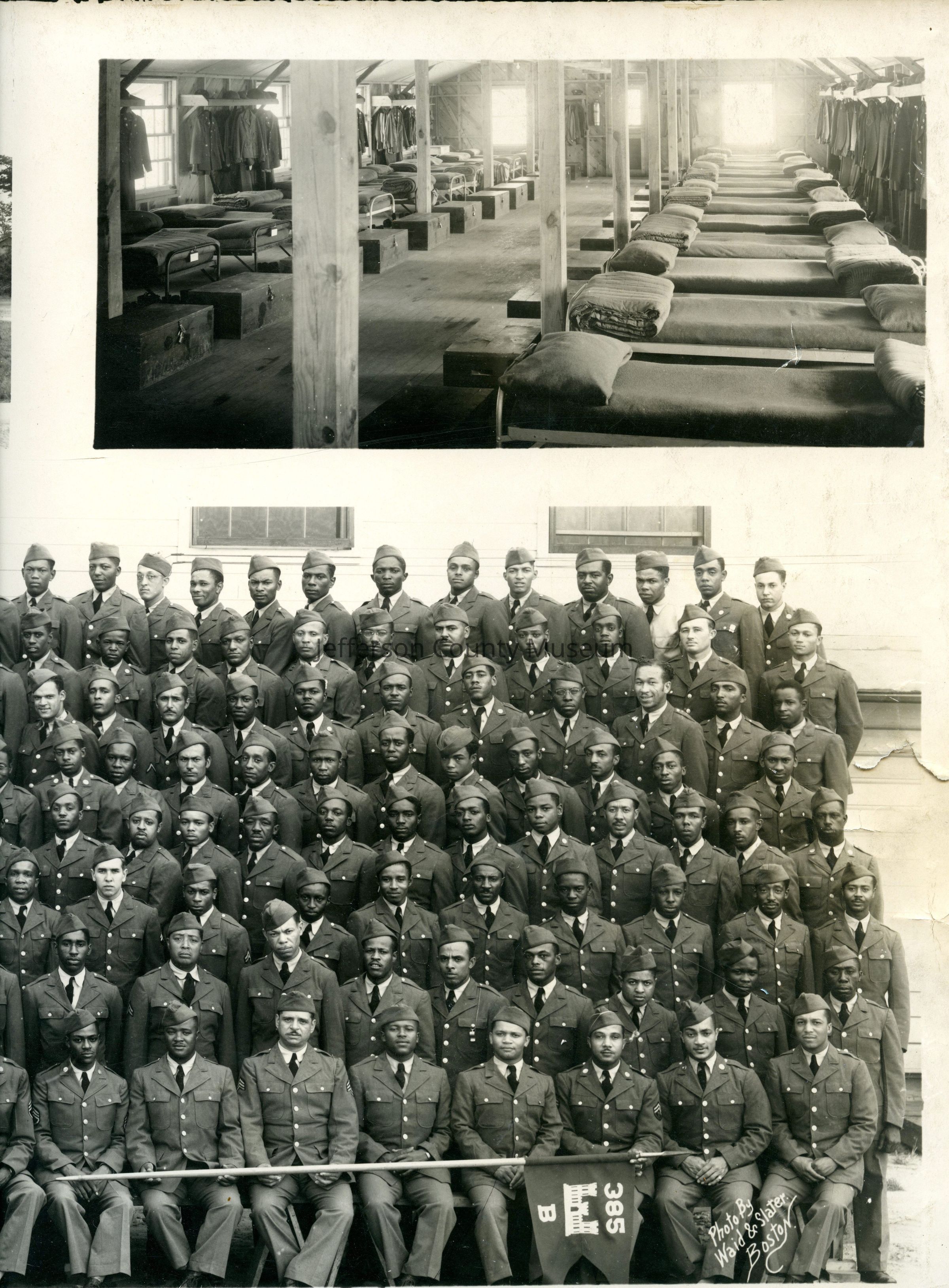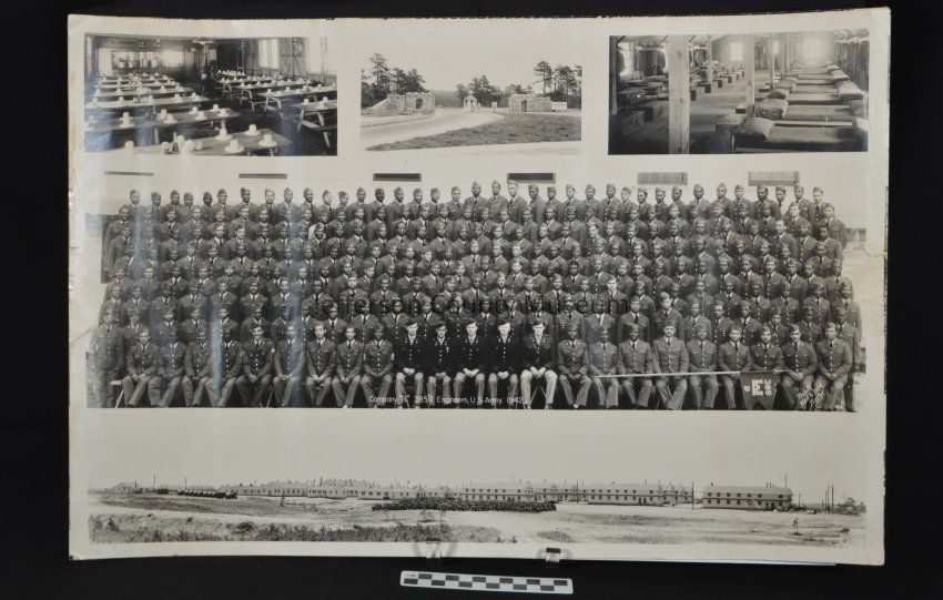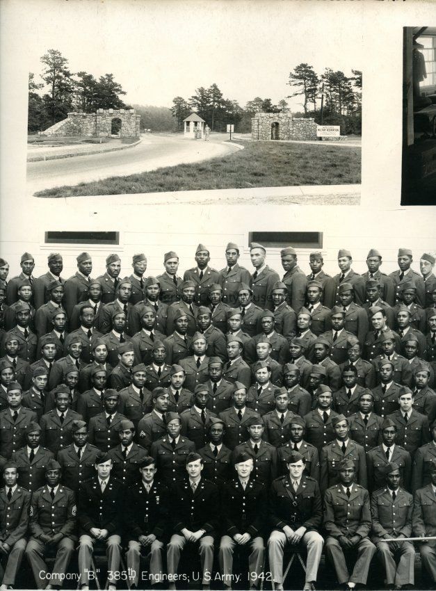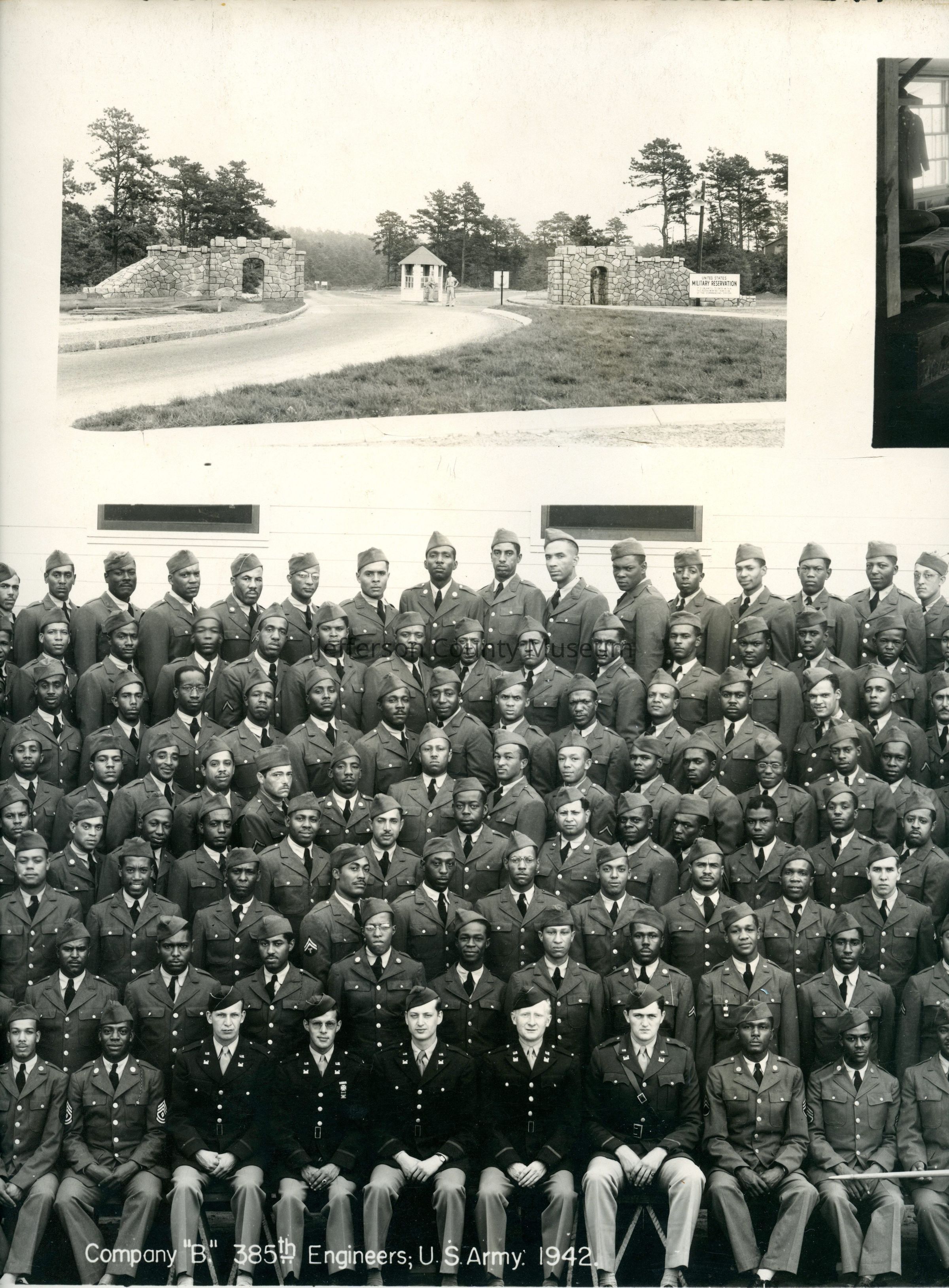 World War II soldiers of Company "B" 385th Engineers, U. S. Army, 1942. Large center photograph is surrounded by four smaller insets: dining hall, entrance to base, room in barracks, buildings and vehicles. Sign in the base entrance photo reads: "United States / Military Reservation / ... ." Donor's father, Jesse "Bus" Bradford, is shown in the third row from the back, thirteenth from left.Acquisition