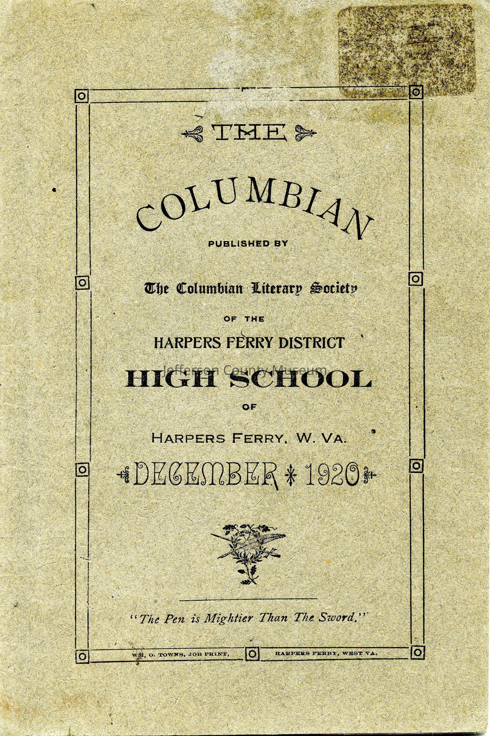 Yearbook "THE COLUMBIAN PUBLISHED BY The Columbian Literary Society OF THE HARPERS FERRY DISTRICT HIGH SCHOOL OF HARPERS FERRY, W. VA. DECEMBER 1920 'The Pen is Mightier Than The Sword' ". 24 pages.Acquisition