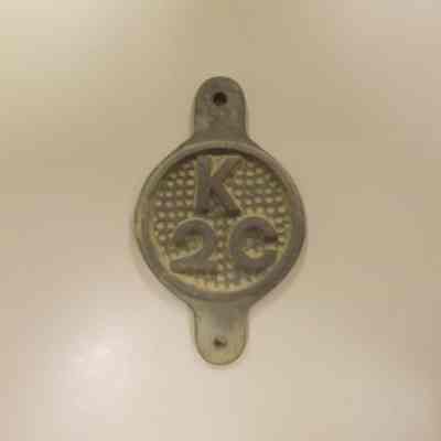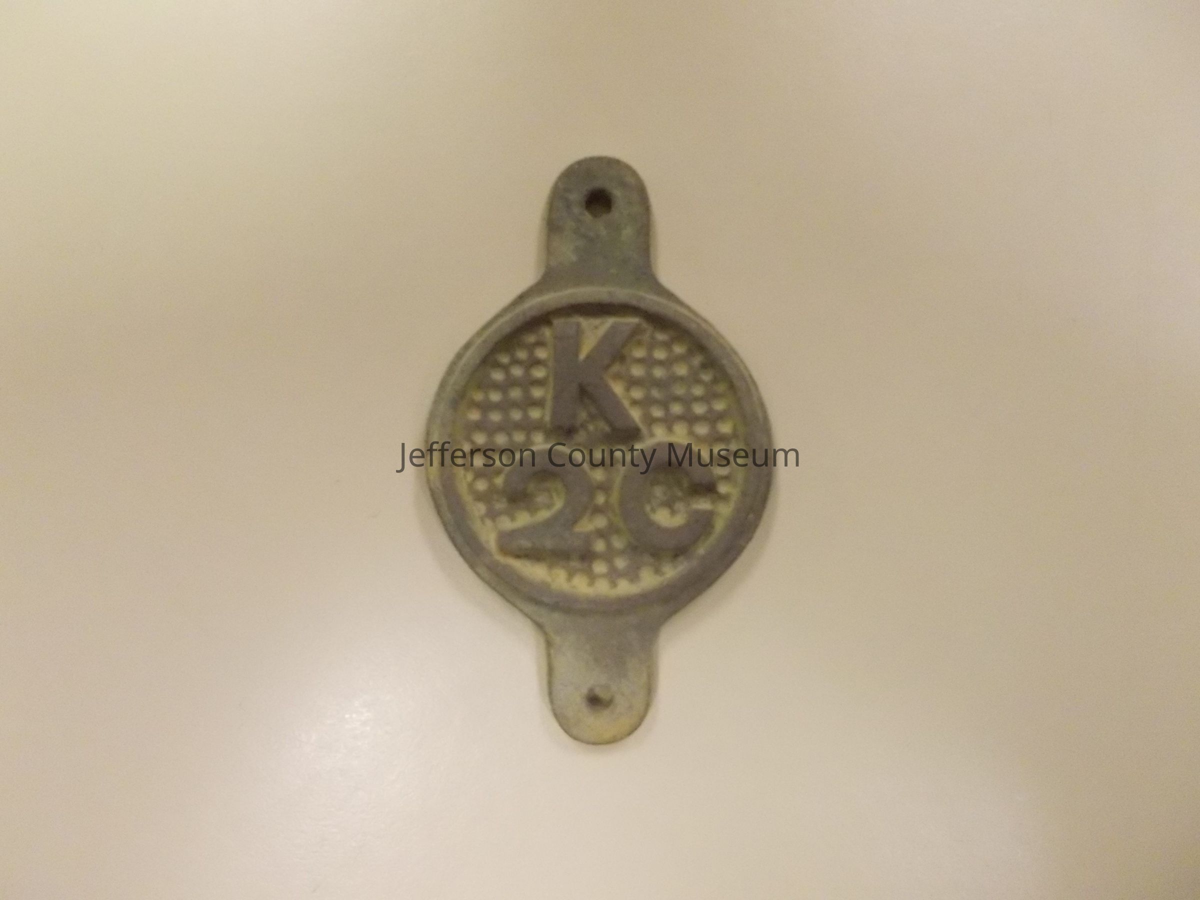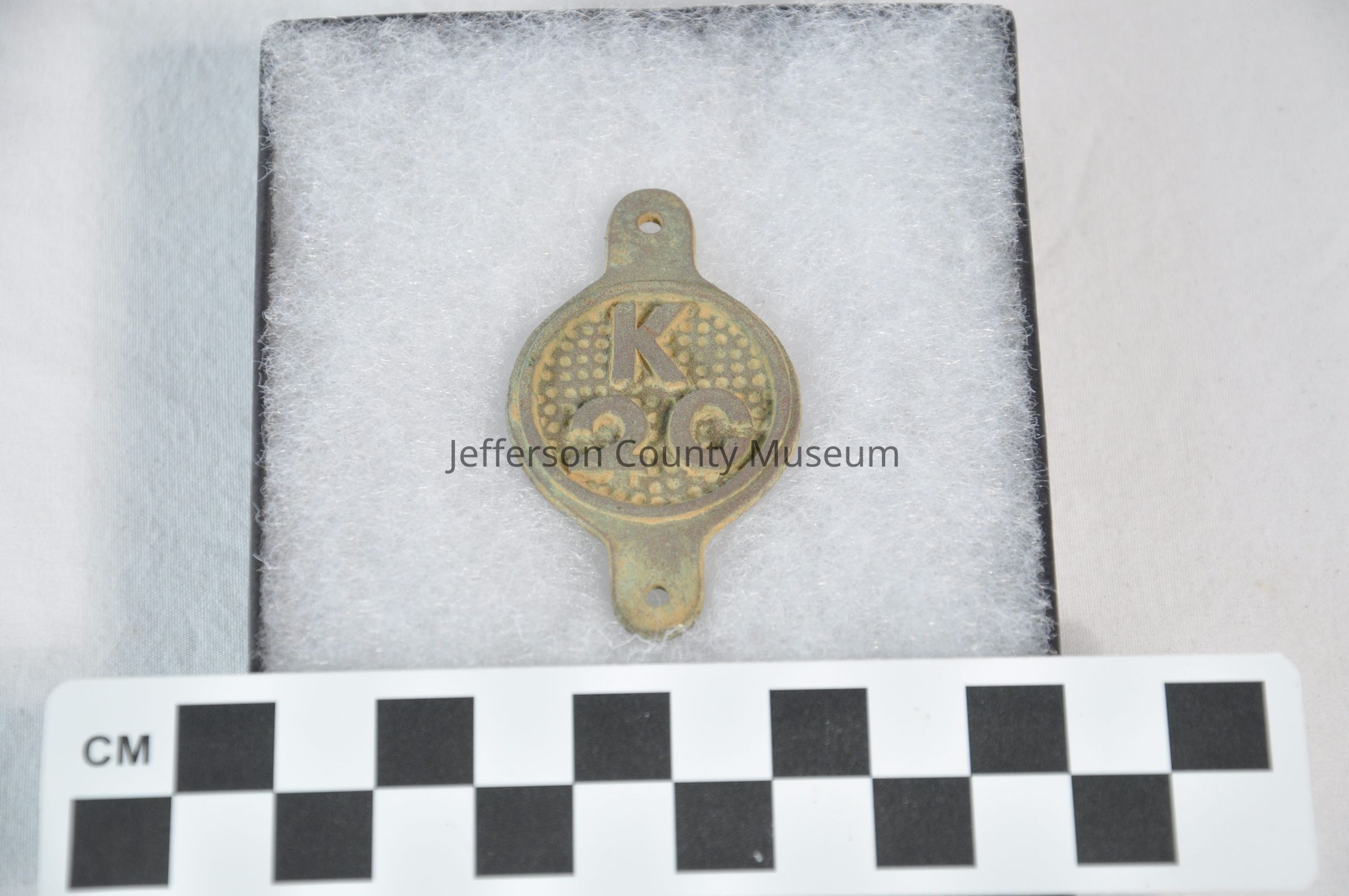 Piece of a horse's bridle, pre-Civil War era; Bit boss (originally riveted to the side of a bridle bit) for Company K, Second U.S. Cavalry. Circular, flat piece of metal, with rounded protrusions at the top and the bottom, each with a small hole. Center of the piece reads: K 2C.Acquisition