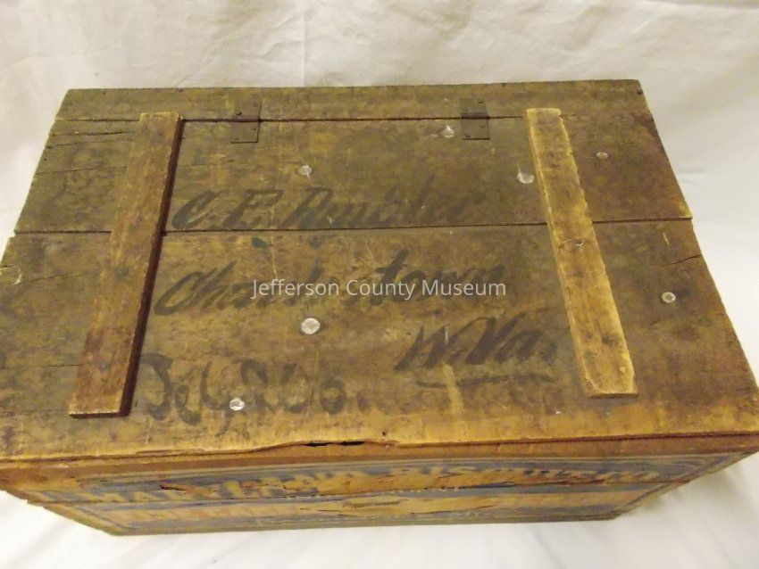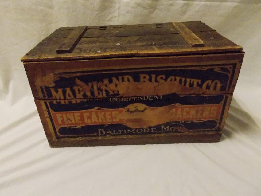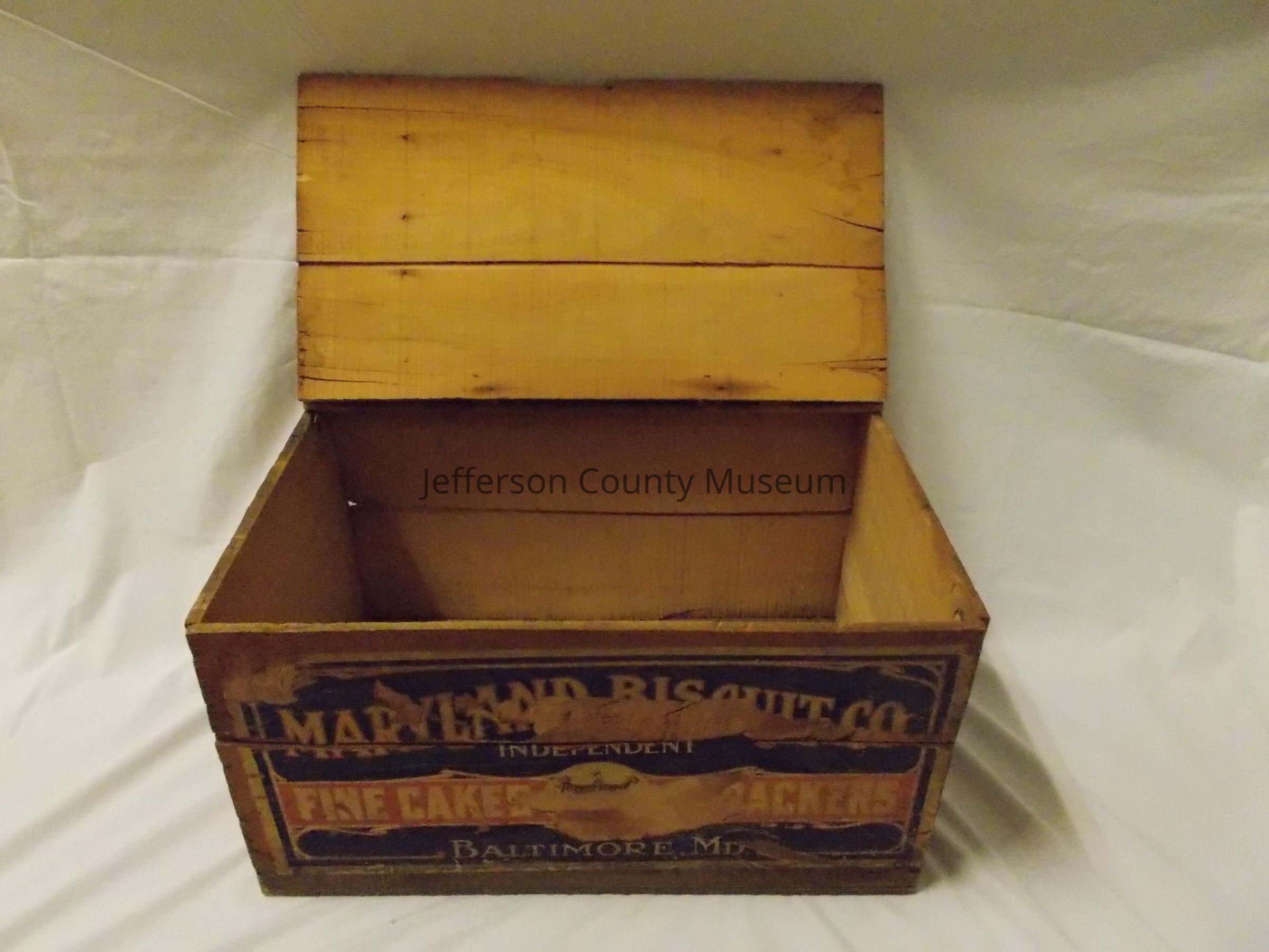 Wooden crate or box with hinged lid. Badly peeling label on front of the crate advertises Maryland Biscuit Co. Except for label, crate is unpainted and unfinished. Label reads: MARYLAND BISCUIT CO. INDEPENDENT FINE CAKES CRACKERS BALTIMORE, M.D. On one side of the box, stamped text reads: EXTRA-SODA. A handwritten inscription on the box's lid reads: C.E. Ambler Charlestown W.Va. Jeff Co.Acquisition