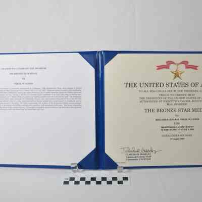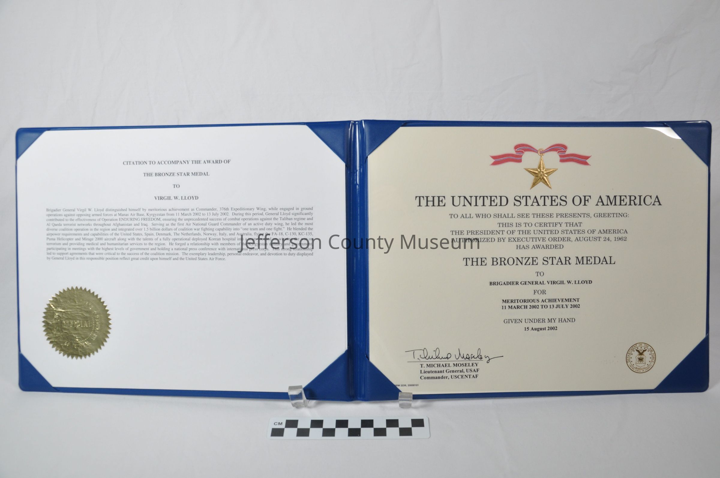 1002b is the citation and certificate for the Bronze Star. Citation reads in part "------General Virgil W. Lloyd distinguished himself by meritorious achievement as Commander, 376th Expeditionary Wing,--------at Manas Air Base, Kyrgyzstan from 11 March 2002 to 13 July 2002.--------------". Certificate on right hand side of folder reads in part "THE UNITED STATES OF AMERICA-------------THE BRONZE STAR MEDAL---------15 August 2002". Signed by T. Michael Moseley, Lieutenant General USAF.