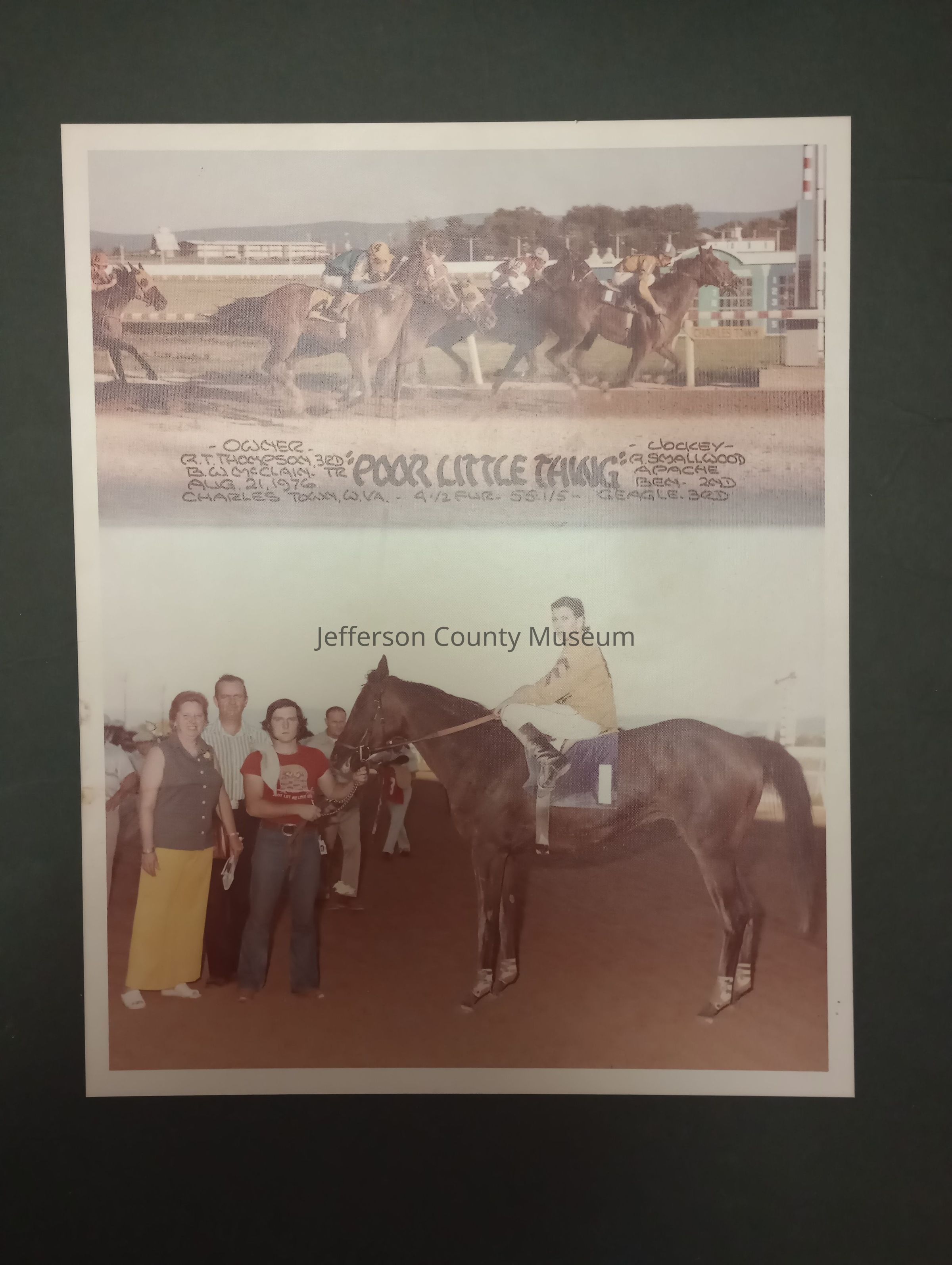 Mounted color winners circle photo for "Poor Little Thing."Context