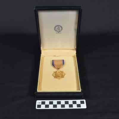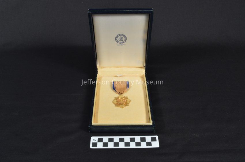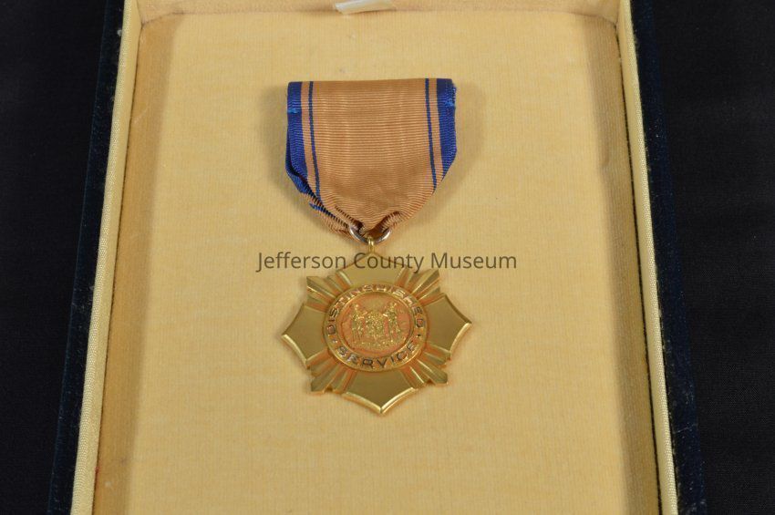 Cat. #1077b is for box holding medal. Box is covered in black leatherette. On top of box in gold is "WEST VIRGINIA Distinguished Service Medal".