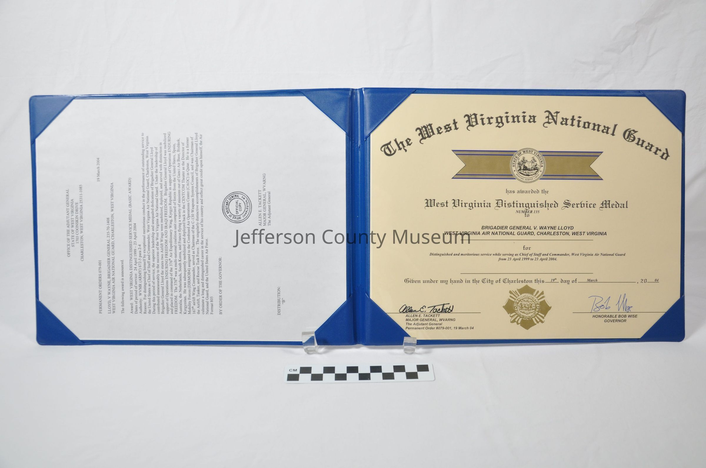 distinguishing himself------as Chief of Staff and Commander, West Virginia Air National Guard, Charleston, West Virginia-----------Operations ENDURING FREEDOM AND IRAQI FREEDOM----BY ORDER OF THE GOVERNOR----ALLEN E. TACKETT MAJOR GENERAL, WVARNG, The Adjutant General. Certificate reads in part "The West Virginia National Guard has awarded the West Virginia Distinguished Service Medal to BRIGADIER GENERAL V. WAYNE LLOYD--------------------19th day of March 2004". Signed by Allen E, Tackett and Governor Bob Wise.