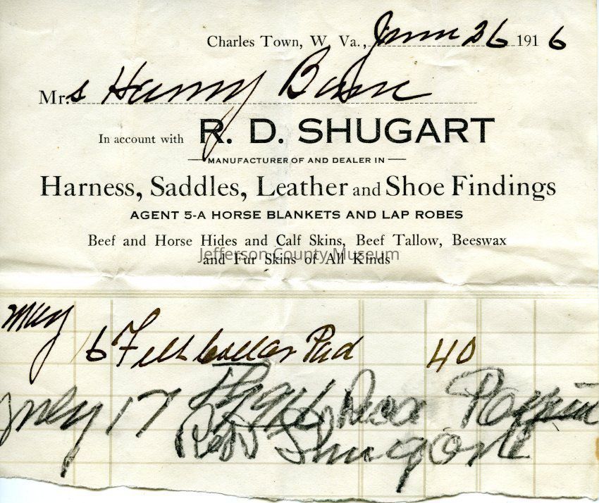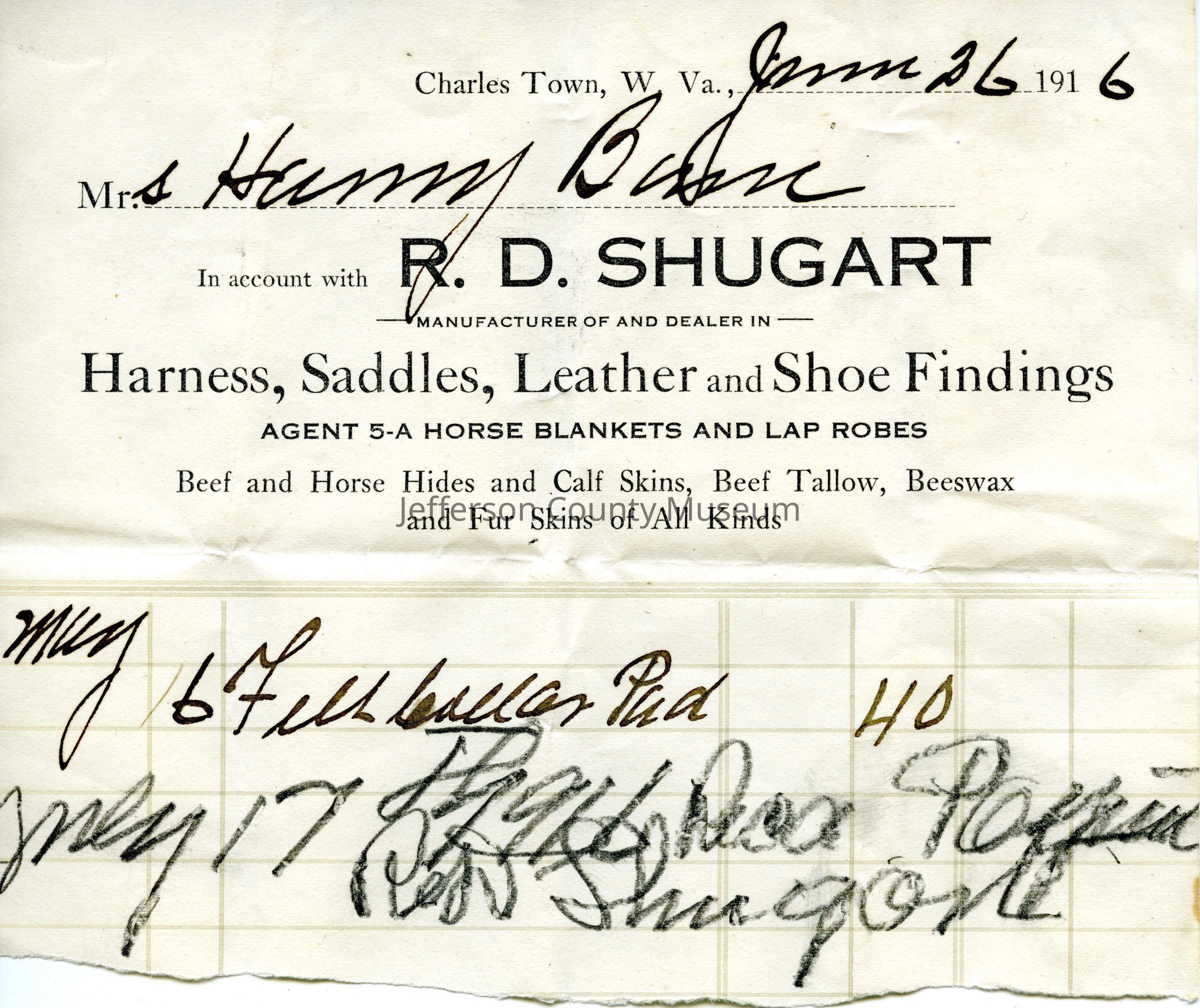 R. D. Shugart, Charles Town, W. Va., manufacturer of and dealer in Harness, Saddles, Leather and Shoe findings, agent 5-A horse blankets and lap robes, beef and horse hides and calf skins, beef tallow, beeswax and fur skins of all kindsAcquisition