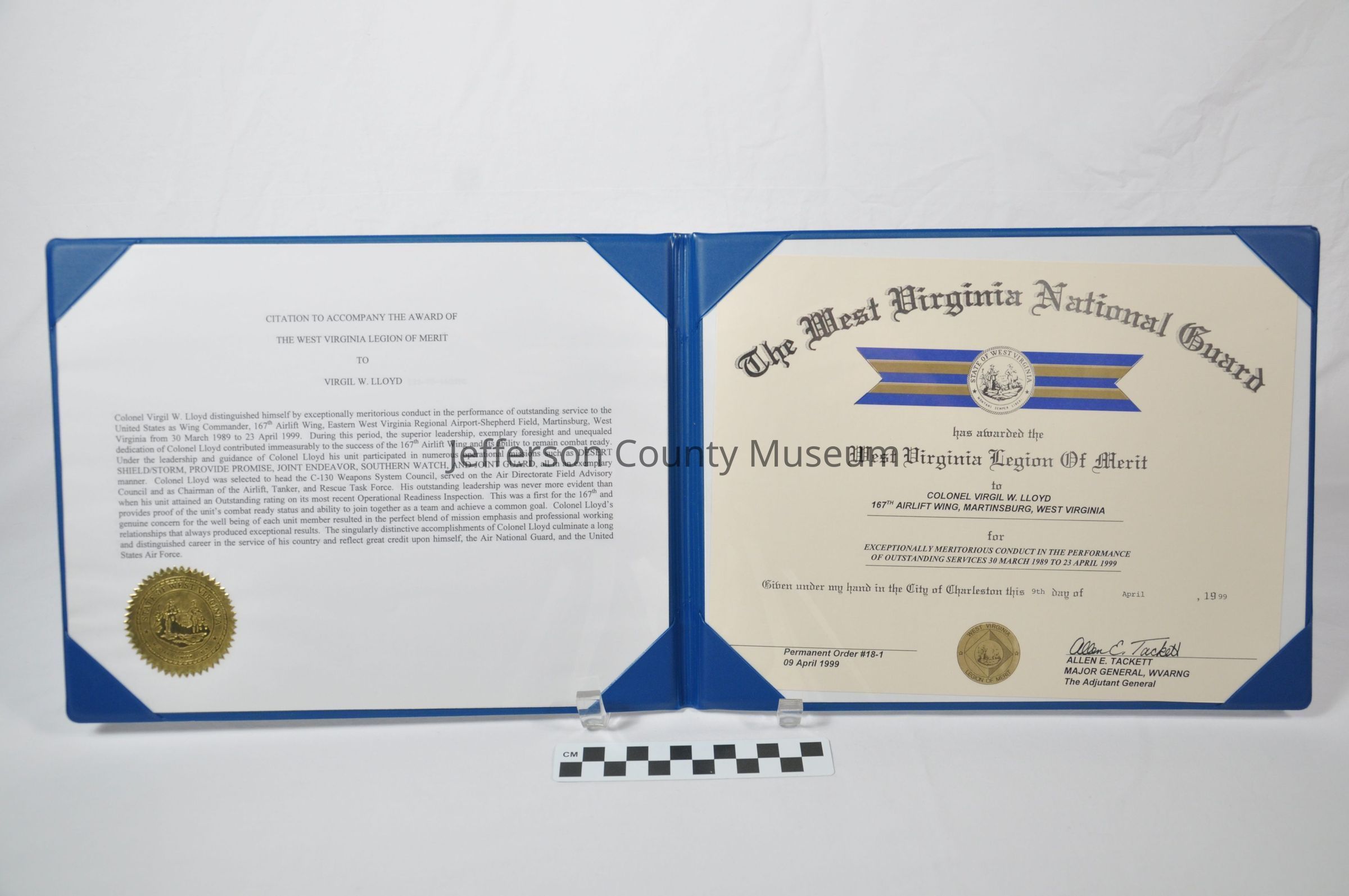 Cat. #1129A is Certificate and citation for West Virginia Legion of Merit awarded to Colonel Virgil W. Lloyd. Citation reads in part "CITATION TO ACCOMPANY THE AWARD OF THE WEST VIRGINIA LEGION OF MERIT TO VIRGIL W. LLOYD Colonel Virgil W. Lloyd distinguished himself by exceptionally meritorious conduct in performance of outstanding service to the United States as Wing Commander, 167th Airlift Wing, Eastern West Virginia Regional Airport-Shepherd Field-----------his unit participated in numerous operational missions such as DESERT SHIELD/STORM, PROVIDE PROMISE, JOINT ENDEAVOR, SOUTHERN WATCH, AND JOINT GUARD--------------". Certificate reads in part "The West Virginia National Guard has awarded the West Virginia Legion of Merit to COLONEL VIRGIL W. LLOYD 167TH AIRLIFT WING, MARTINSBURG, WEST VIRGINIA for EXCEPTIONALLY MERITORIOUS CONDUCT--------30 MARCH 1989 TO 23 APRIL 1999".
