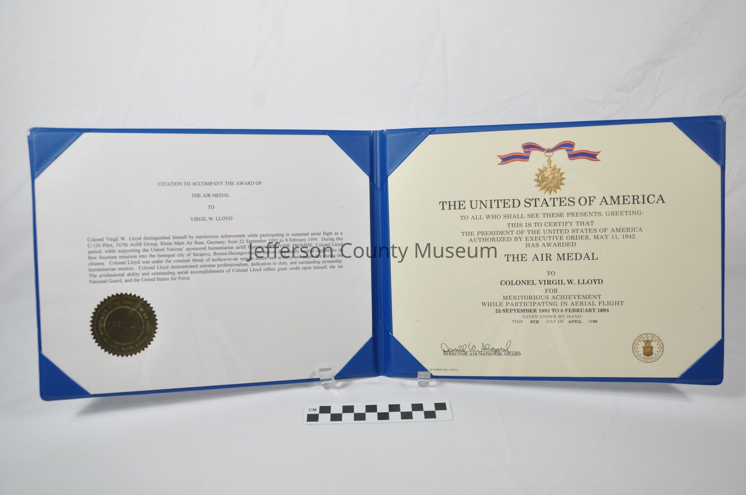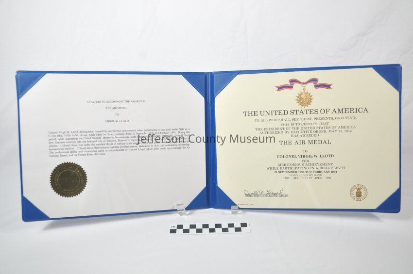 Cat. #1131b is certificate and citation for the Air Medal awarded to Colonel Virgil W. Lloyd. Citation reads in part "CITATION TO ACCOMPANY THE AWARD OF THE AIR MEDAL TO VIRGIL W. LLOYD Colonel Virgil W. Lloyd distinguished himself by meritorious achievement while participating in sustained aerial flight as a C-130 Pilot, 167 Airlift Group, Rhein Main Air Base, Germany, from 22 September 1992 to 8 February 1994. -------Operation PROVIDE PROMISE---------Sarajevo, Bosnia-Herzegovina---------------". Certificate reads in part "THE UNITED STATES OF AMERICA-------HAS AWARDED THE AIR MEDAL TO COLONEL VIRGIL W. LLOYD FOR MERITORIOUS ACHIEVEMENT-------". Signed by the Director, Air National Guard.
