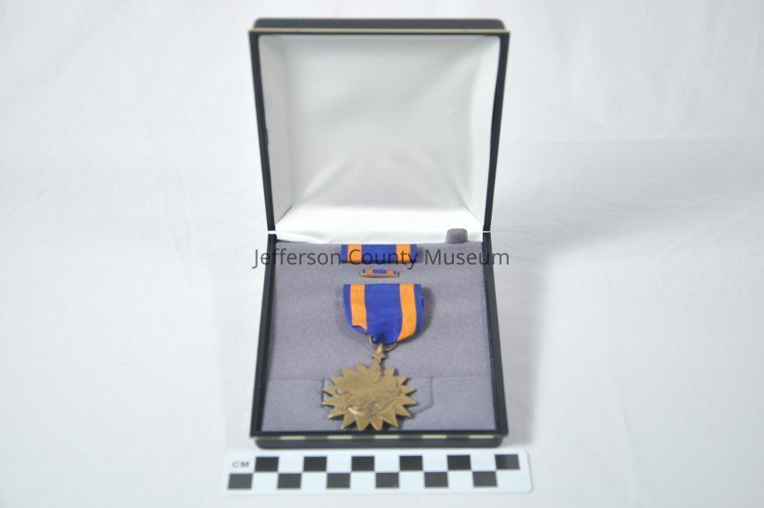 Cat. #1131a is bronze colored Air Medal with lapel pin and ribbon for uniform. Medal is a round star burst shape with an eagle in downward to the left flight, clutching lightning bolts in each claw. Ribbon above medal has ribbon above with blue and orange stripes. Lapel pin and uniform ribbon have same blue and orange stripes.