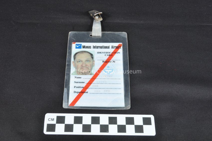 Laminated plastic card with clip for attaching to uniform. On front is photo of V. Wayne Lloyd. Above photo is "Manas International Airport IDENTIFICATION CARD 2701 Name V. WAYNE