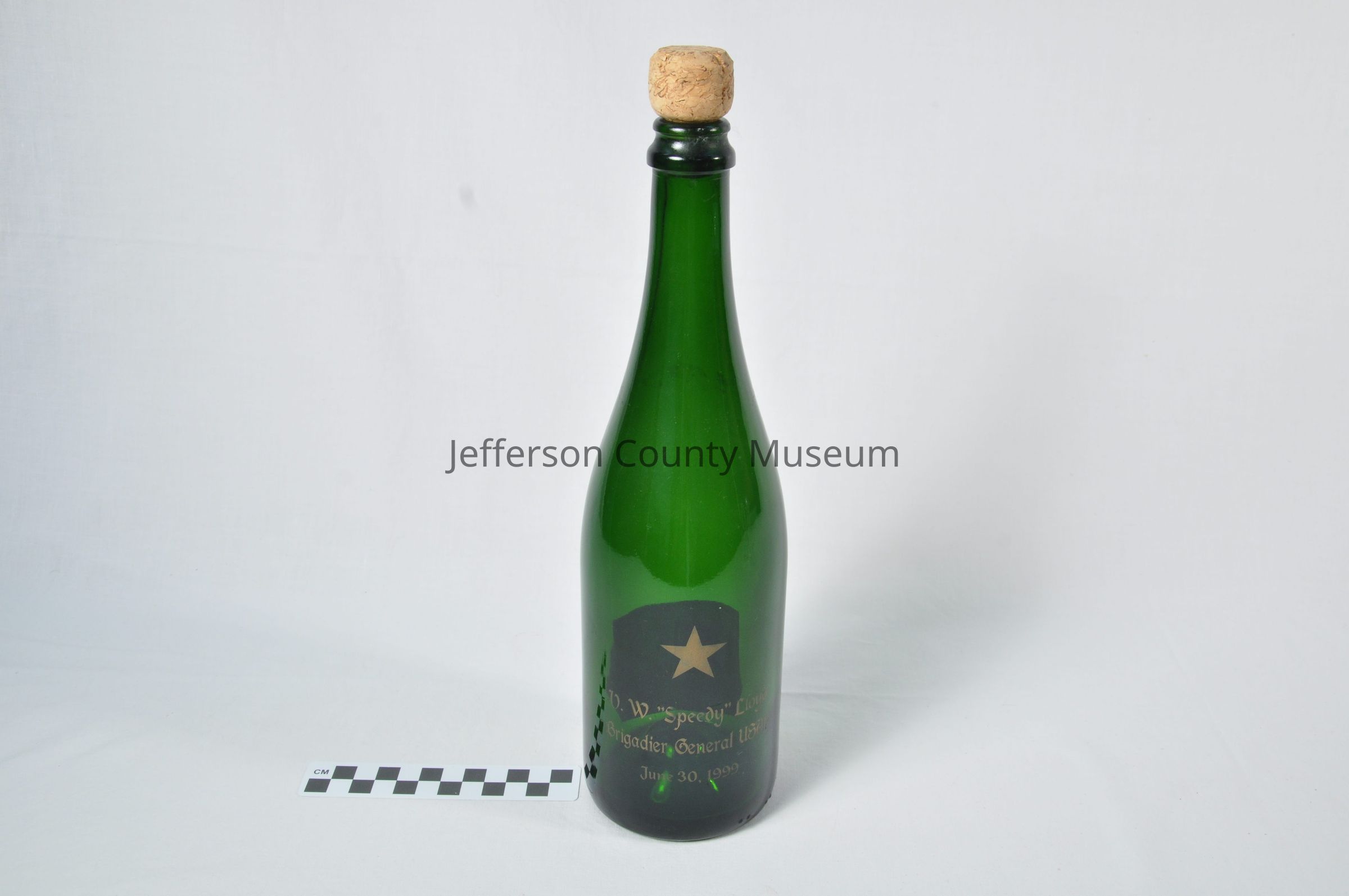 Green champagne bottle with cork. On front of bottle is gold star and "V. W. 'Speedy' Lloyd Brigadier General USAF". On back of bottle is paper label with "Imported By Schieffelin & Somerset Co." and other general label information.Acquisition