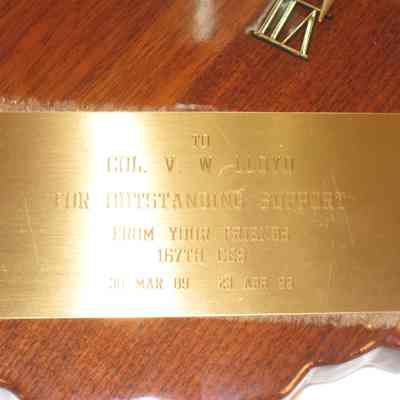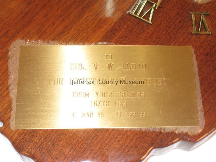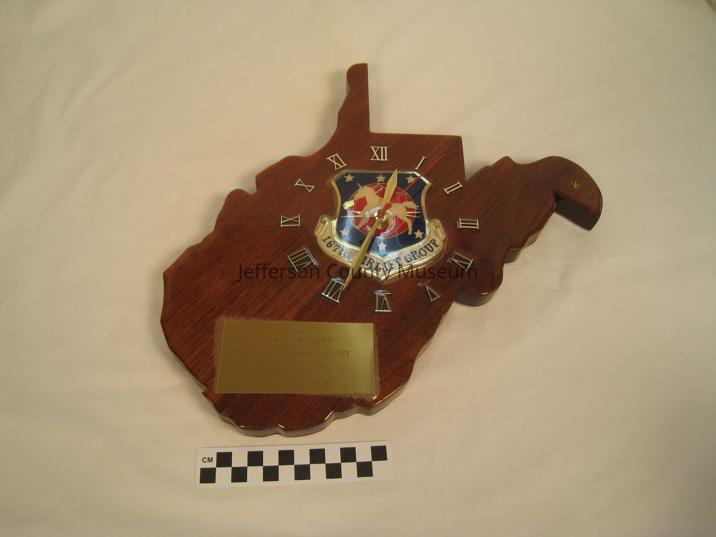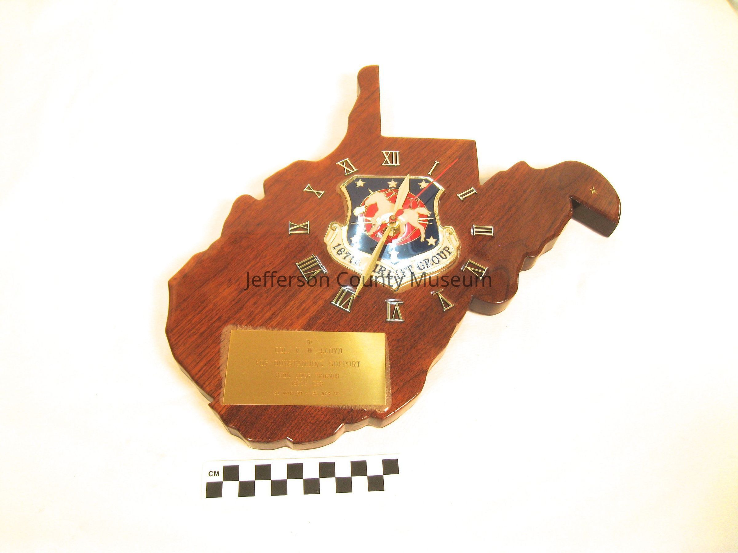 Wooden clock in shape of the state of West Virginia. Clock has Roman numerals. Hands of the clock are superimposed on the shield of the 167th Airlift Group. A brass plaque attached to the clock reads " TO COL. V. W. LLOYD FOR OUTSTANDING SUPPORT FROM YOUR FRIENDS 167TH CES 30 MAR 89---23 APR 99". Wood is probably walnut. On back of clock handwritten in ink is "Made By Oscar W. Gladden April 1999".Acquisition