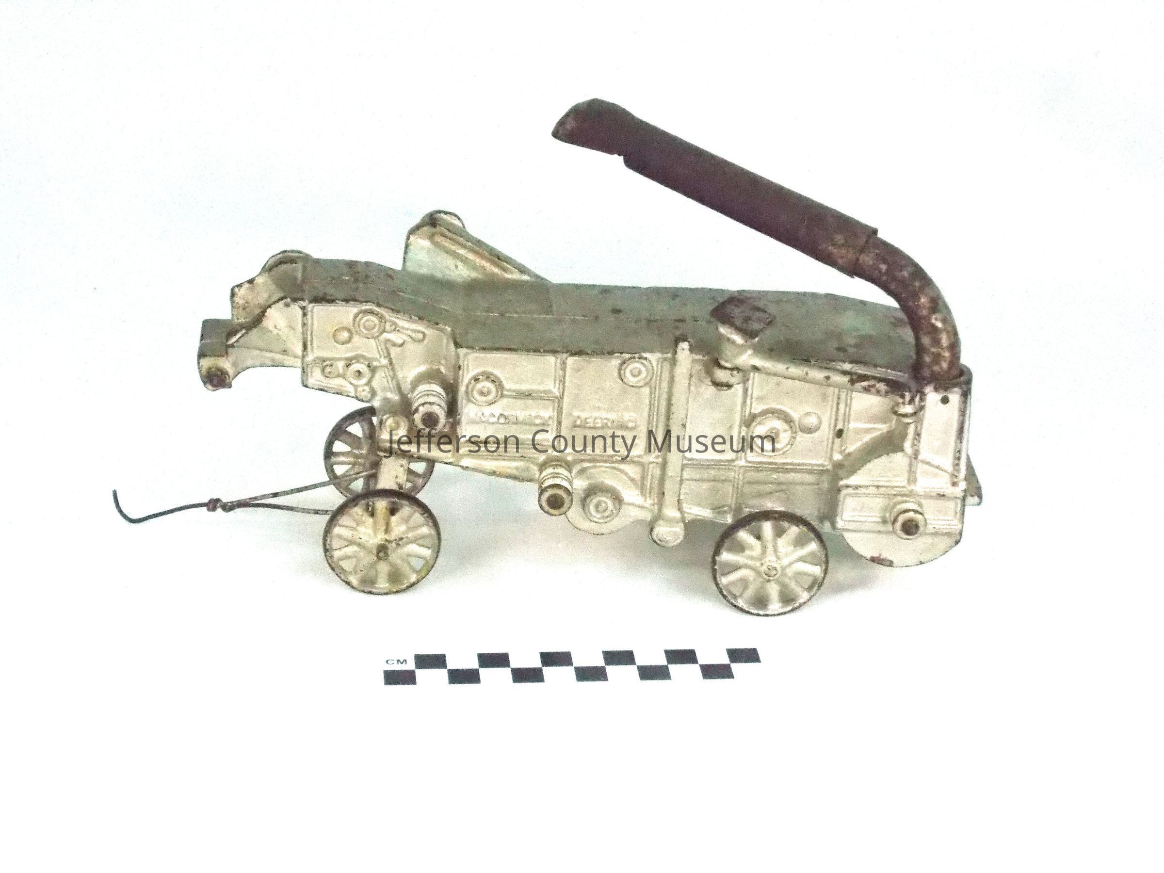 Cast iron threshing machine painted silver. Machine is on four wheels and has a tongue for pulling with a tractor or horses. There is a chute in the front for putting in the wheat and a boom pipe on back for disposing of the chaff. Embossed on an arm on the right side is "McCORMICK-DEERING". This is also embossed on left side. Embossed inside on left side is "MADE BY ARCADE MFG. Co.". Embossed inside on right side is "FREEPORT, ILL."Acquisition