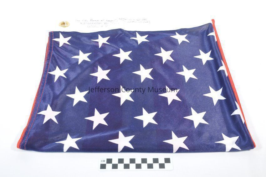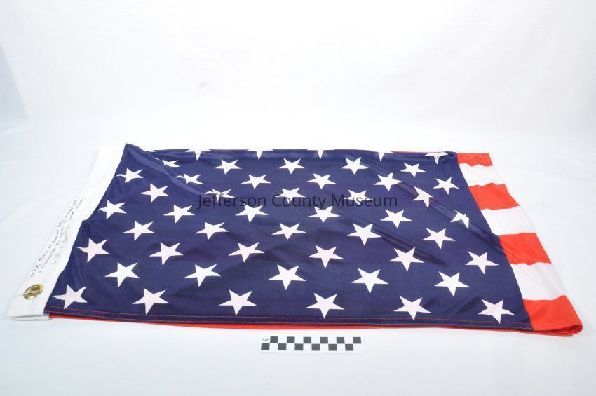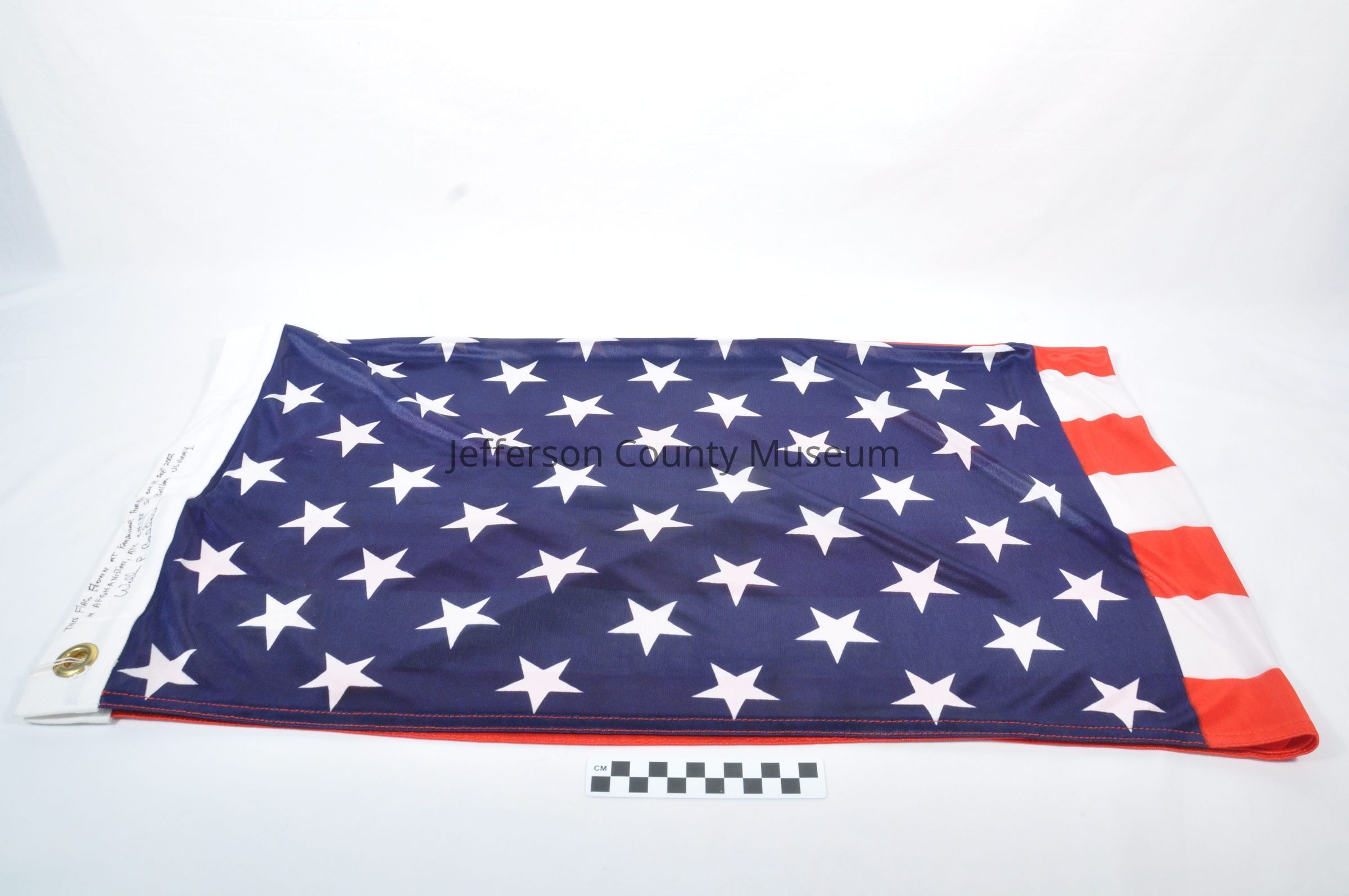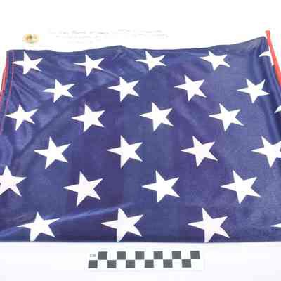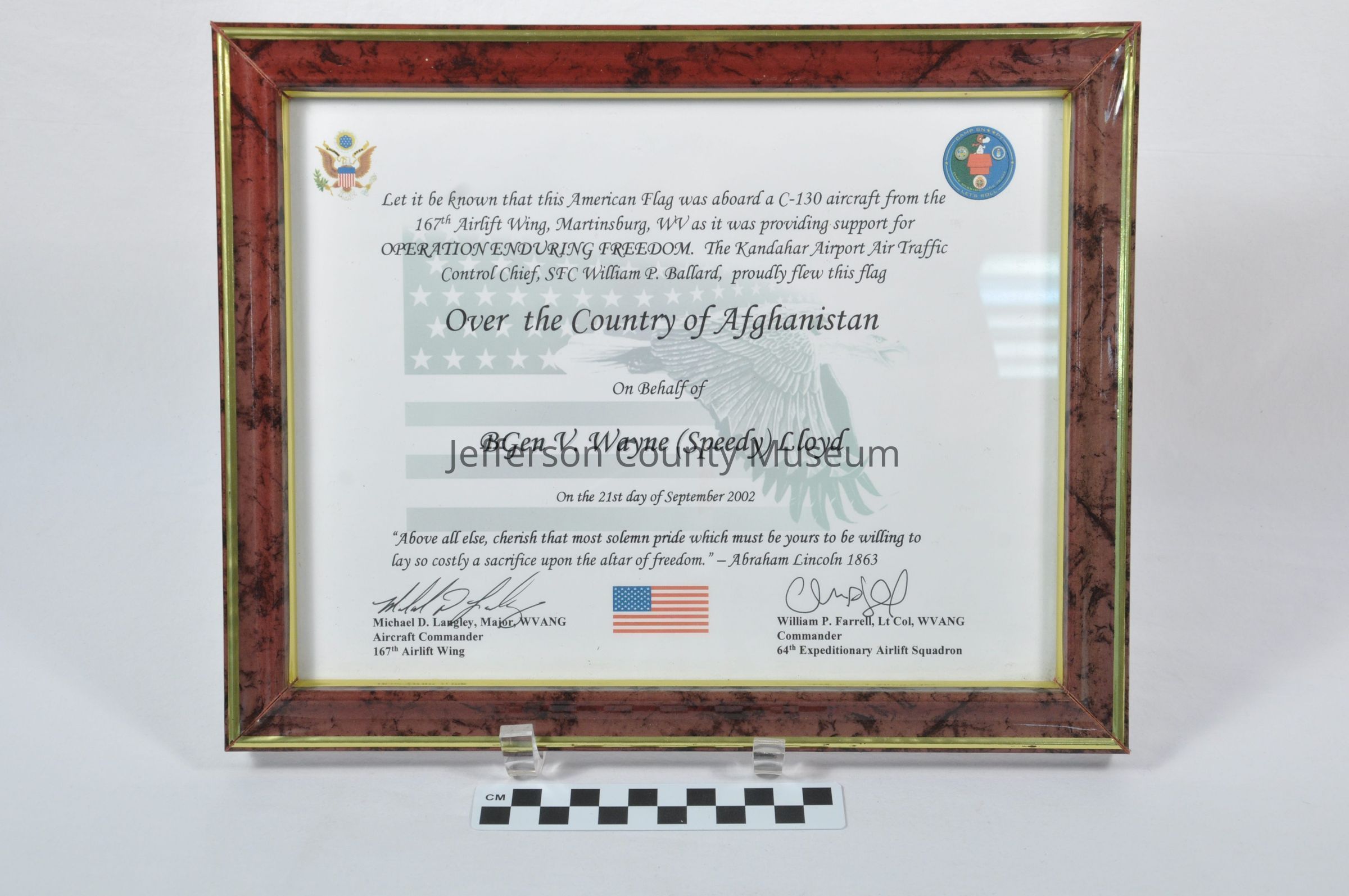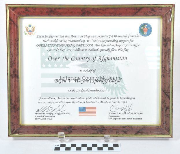 Satin United States of America flag. Brass grommets. Written on edge "THIS FLAG FLOWN AT KANDAHAR AIRPORT ON 21 SEPT 2002 IN AFGHANISTAN, ATC CHIEF SFC BALLARD U.S. ARMY" Signed "William P. Ballard". Included with the flag is a framed certificate stating that the flag was flown aboard a C-130 from the 167th Airlift Wing in Martinsburg to Afghanistan an flown over the country of Afghanistan on behalf of Brigadier Gen. V. Wayne (Speedy) Lloyd. Flag is Cat. #1158a. Certificate is Cat. #1158b.Acquisition