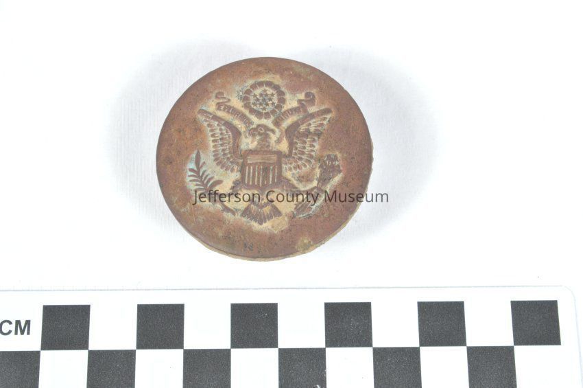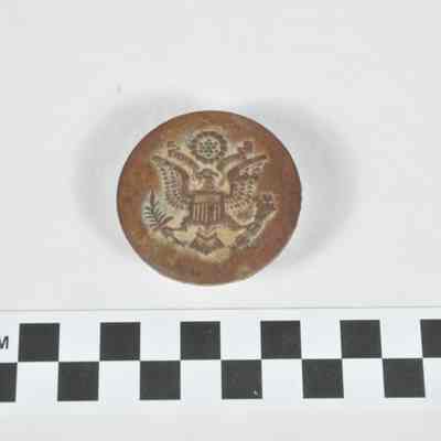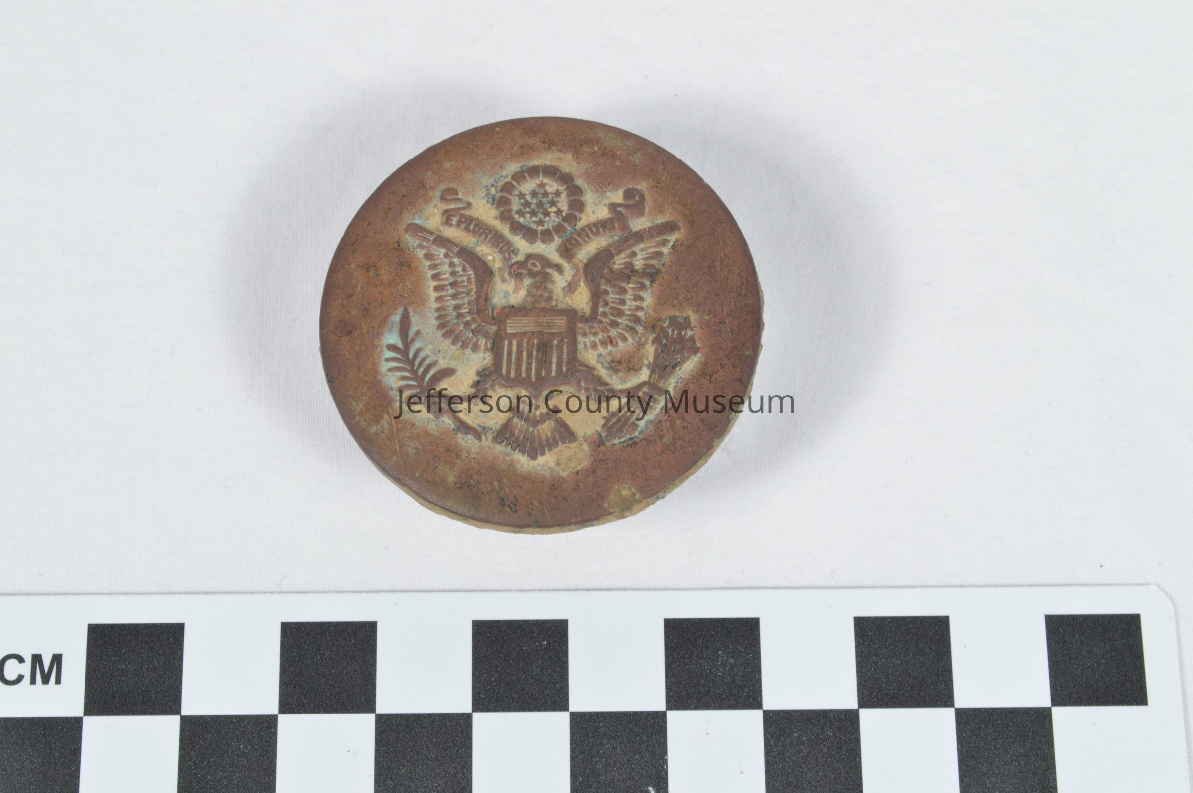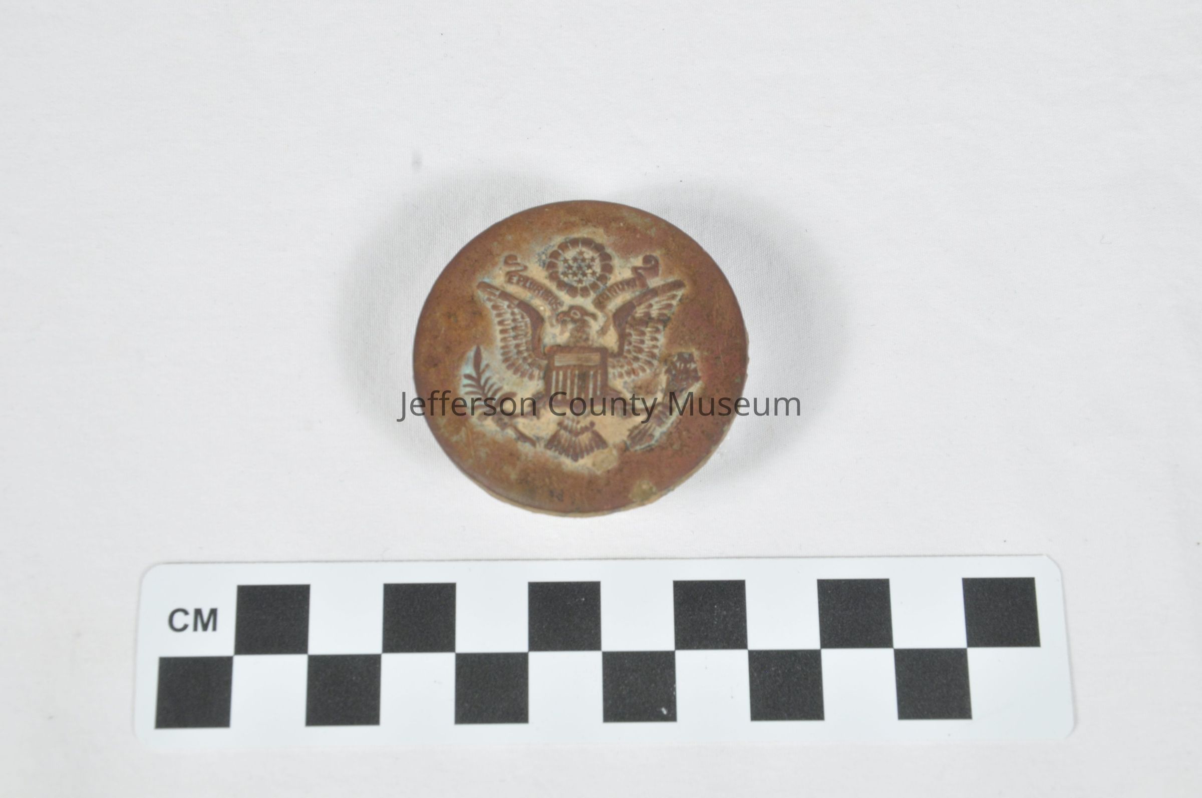 Bridle rosette, World War II-era. Round, brass disc with raised insignia for the U.S. Army (image of an eagle holding a branch in one foot and arrows in the other, with banner above reading "E PLURIBUS UNUM"). Small metal handle or protrusion is attached to the back of the disc, perhaps to attach to a strap.Acquisition