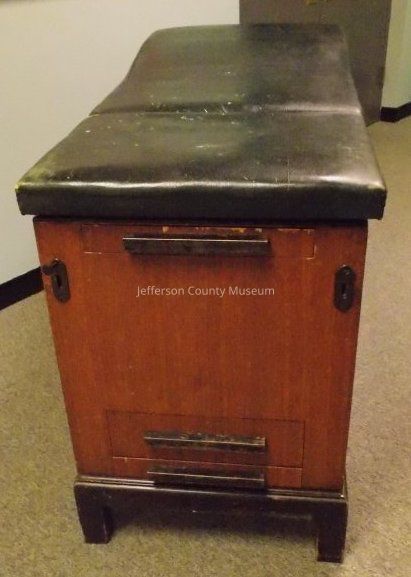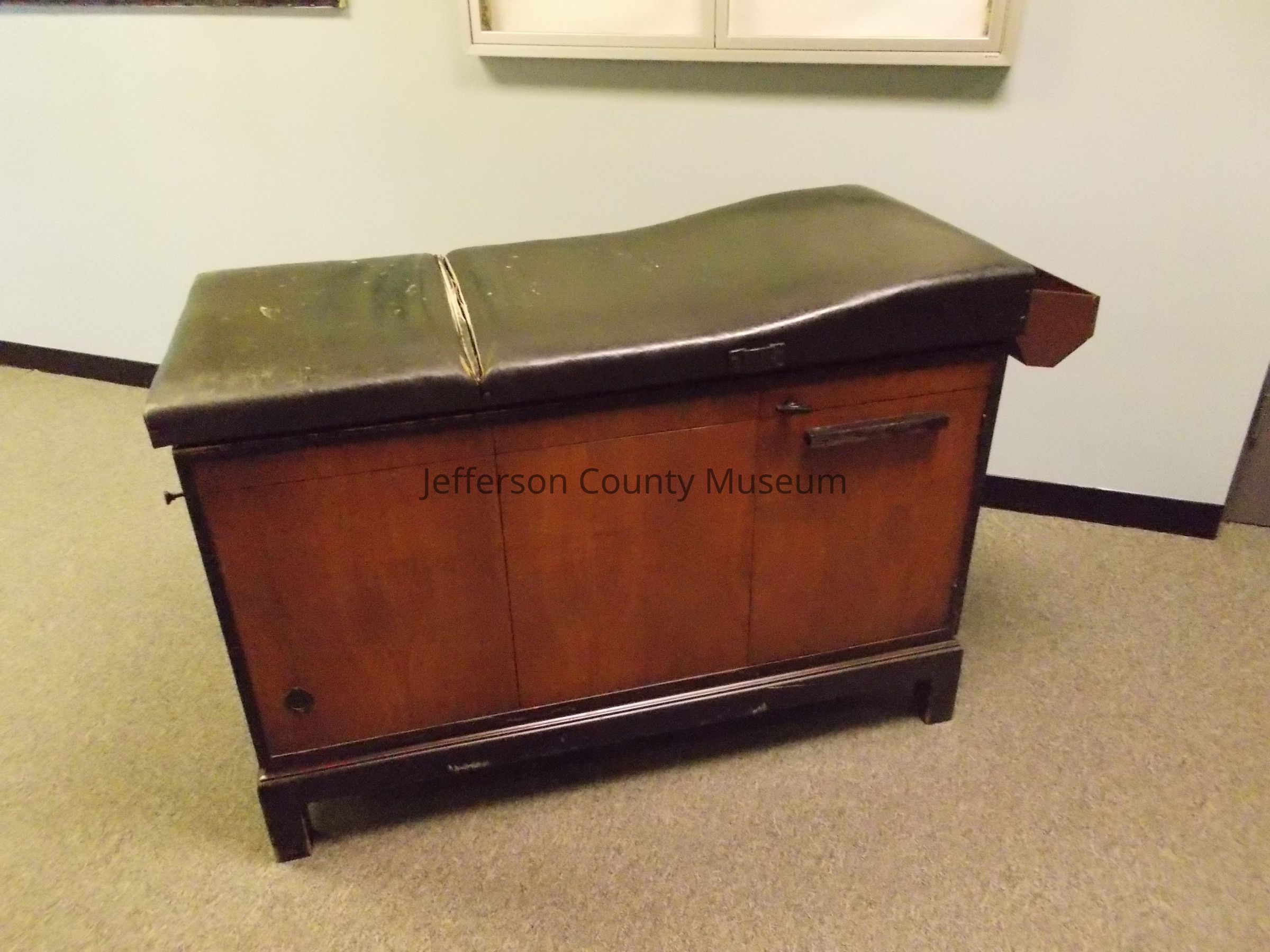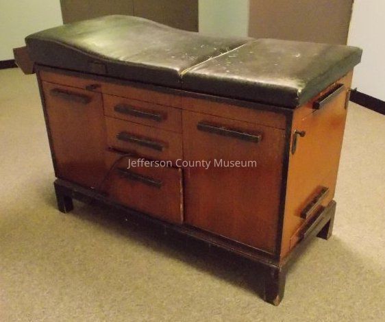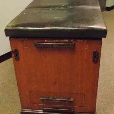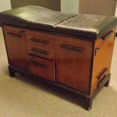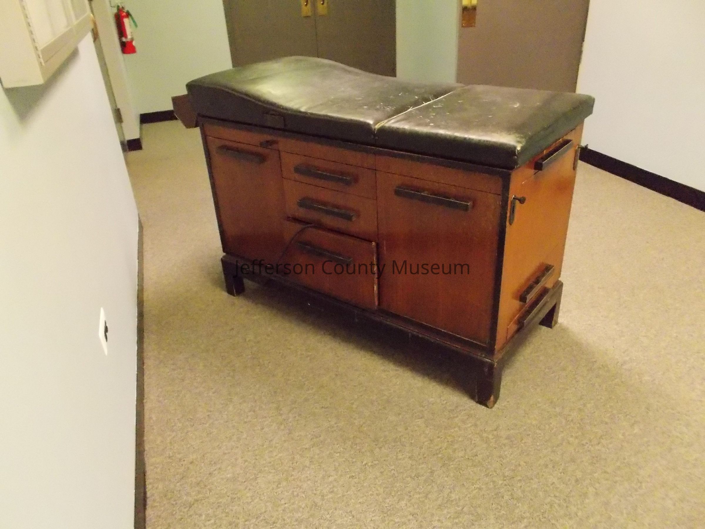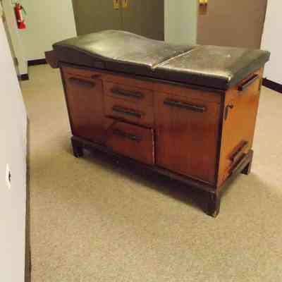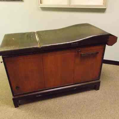 20th Century medical examination table with black leather top and wooden base. Base includes a storage compartment on one end with a cabinet door on either side, and three drawers along one side. A single drawer is on the front end of the table, near a pull-out step. Two metal stirrups are stored inside the cabinet, and can be attached on the front end of the table. A wooden paddle-shaped attachment is also in the compartment (possibly an armrest or shelf surface?). A metal bin with spool is attached to the back end of the table, which would hold a roll of sanitary paper. There is an electrical cord coming out of the bottom of the table. The table top's incline is adjustable.Acquisition