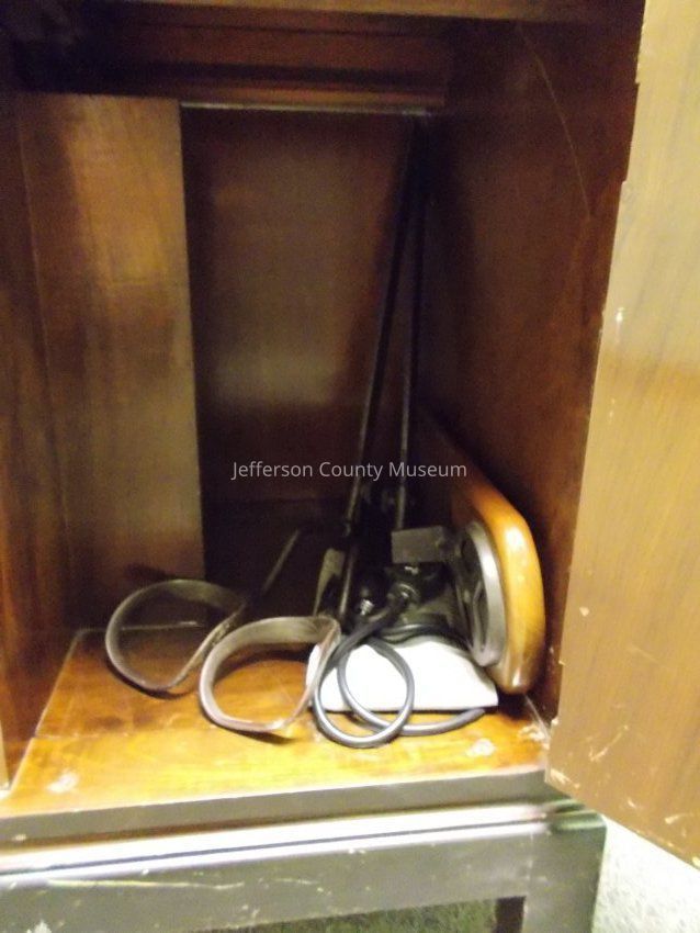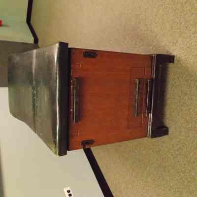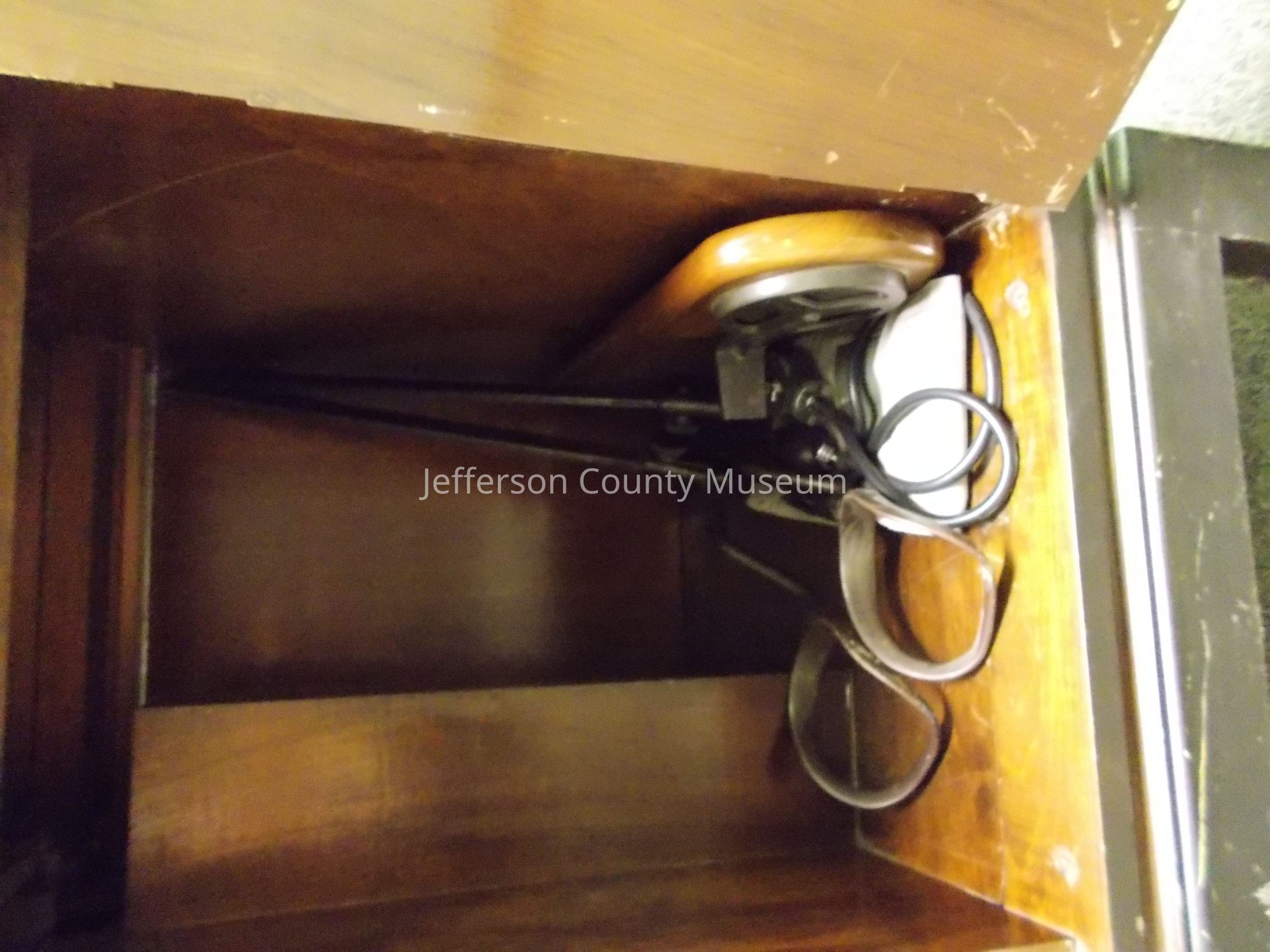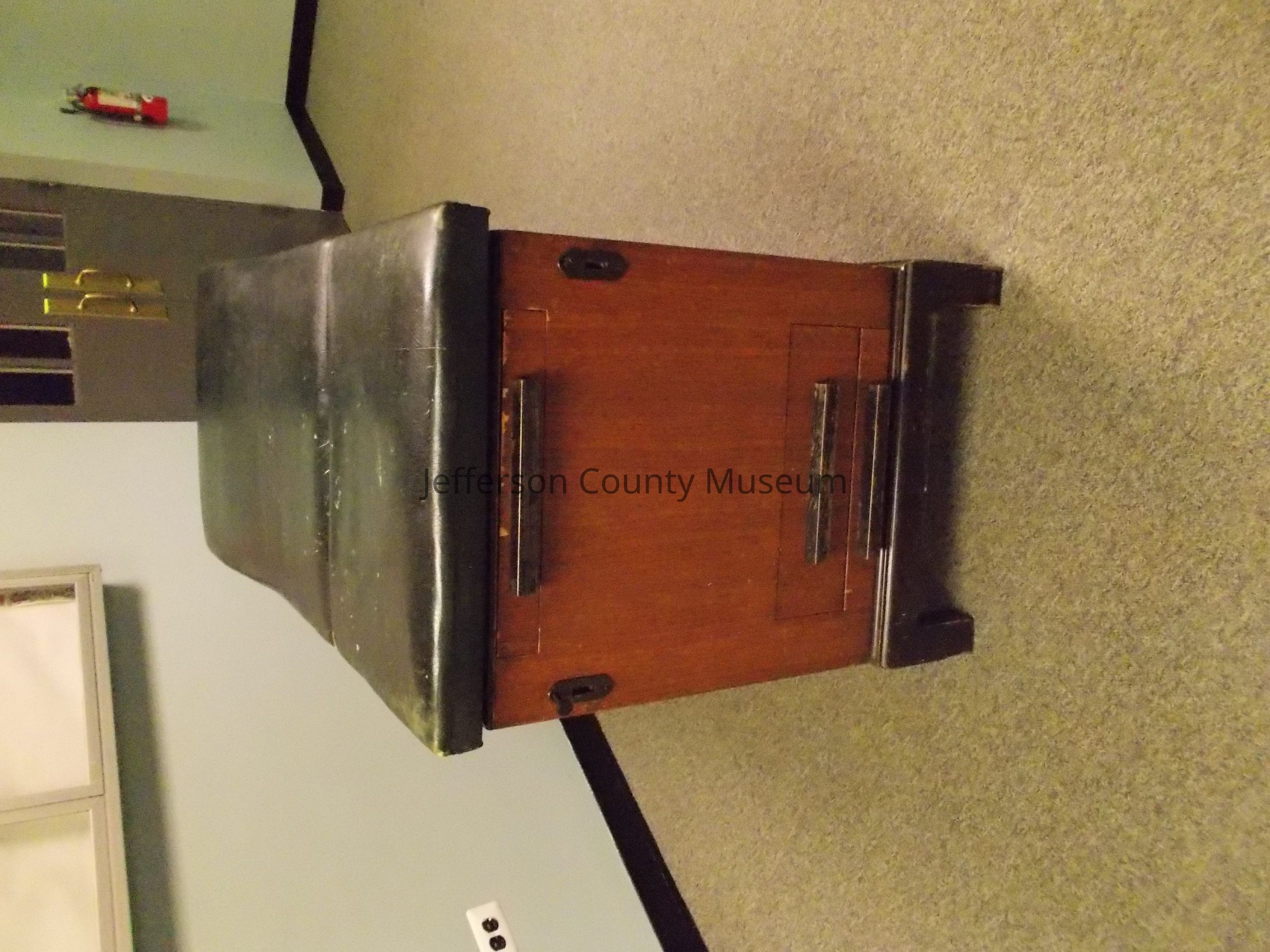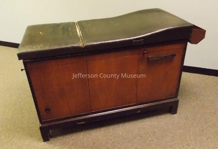 20th Century medical examination table with black leather top and wooden base. Base includes a storage compartment on one end with a cabinet door on either side, and three drawers along one side. A single drawer is on the front end of the table, near a pull-out step. Two metal stirrups are stored inside the cabinet, and can be attached on the front end of the table. A wooden paddle-shaped attachment is also in the compartment (possibly an armrest or shelf surface?). A metal bin with spool is attached to the back end of the table, which would hold a roll of sanitary paper. There is an electrical cord coming out of the bottom of the table. The table top's incline is adjustable.Acquisition