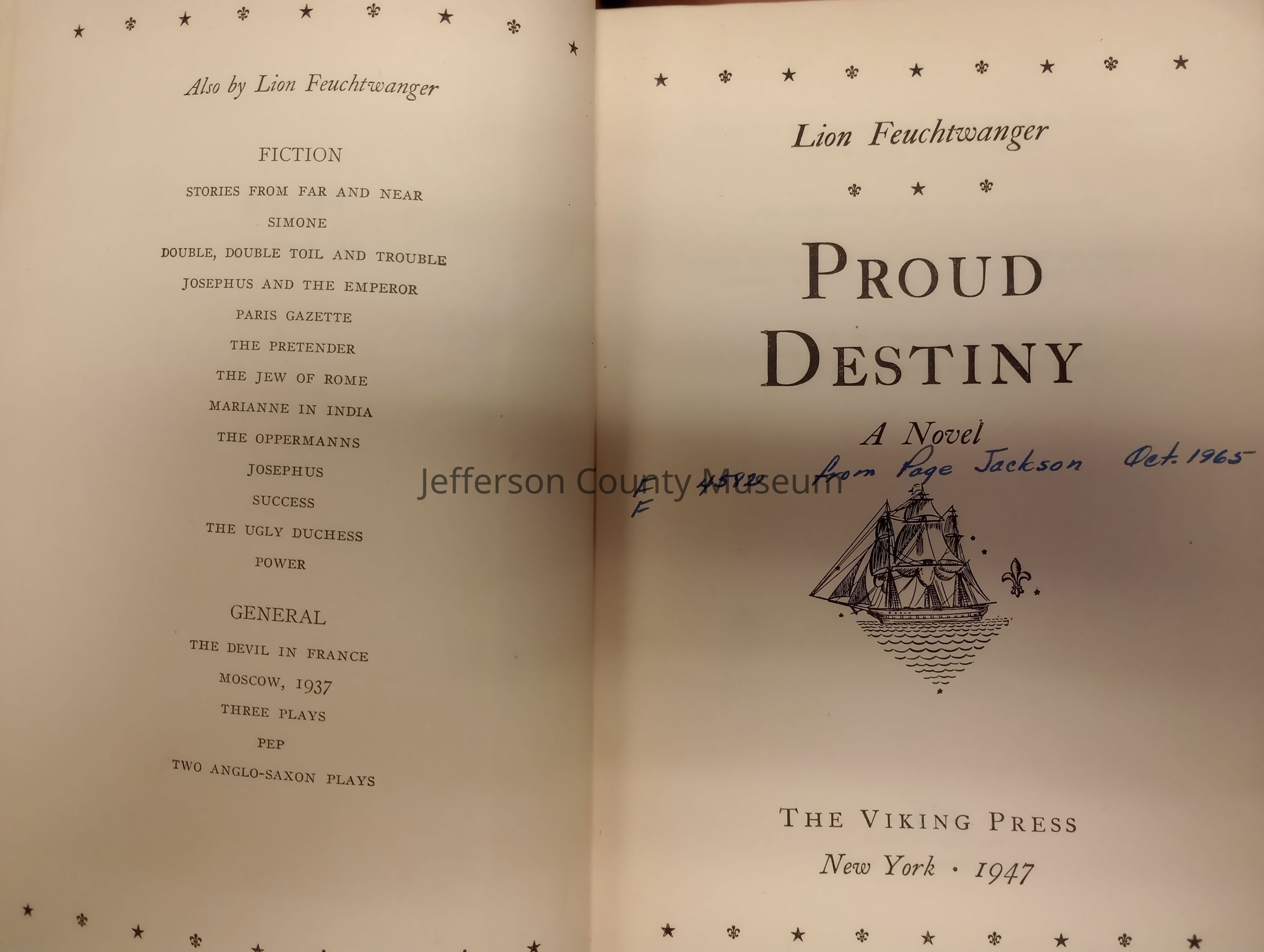 Light blue hardback book with fleur de lis and stars on front cover. Inside front cover is a stamp that says "Page-Jackson Library." Handwritten on the title page is "F F 4582 from Page Jackson Oct. 1965Acquisition
