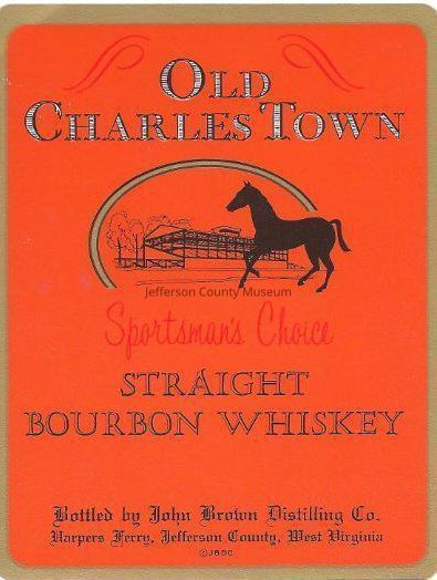 20th Century whiskey bottle label. Orange rectangular label for Old Charles Town Sportsman's Choice Straight Bourbon Whiskey. Image of a horse with stadium seating in the background. Text below reads: Bottled by John Brown Distilling Co. Harpers Ferry, Jefferson County, West Virginia. (Copyright) JBDC.Acquisition