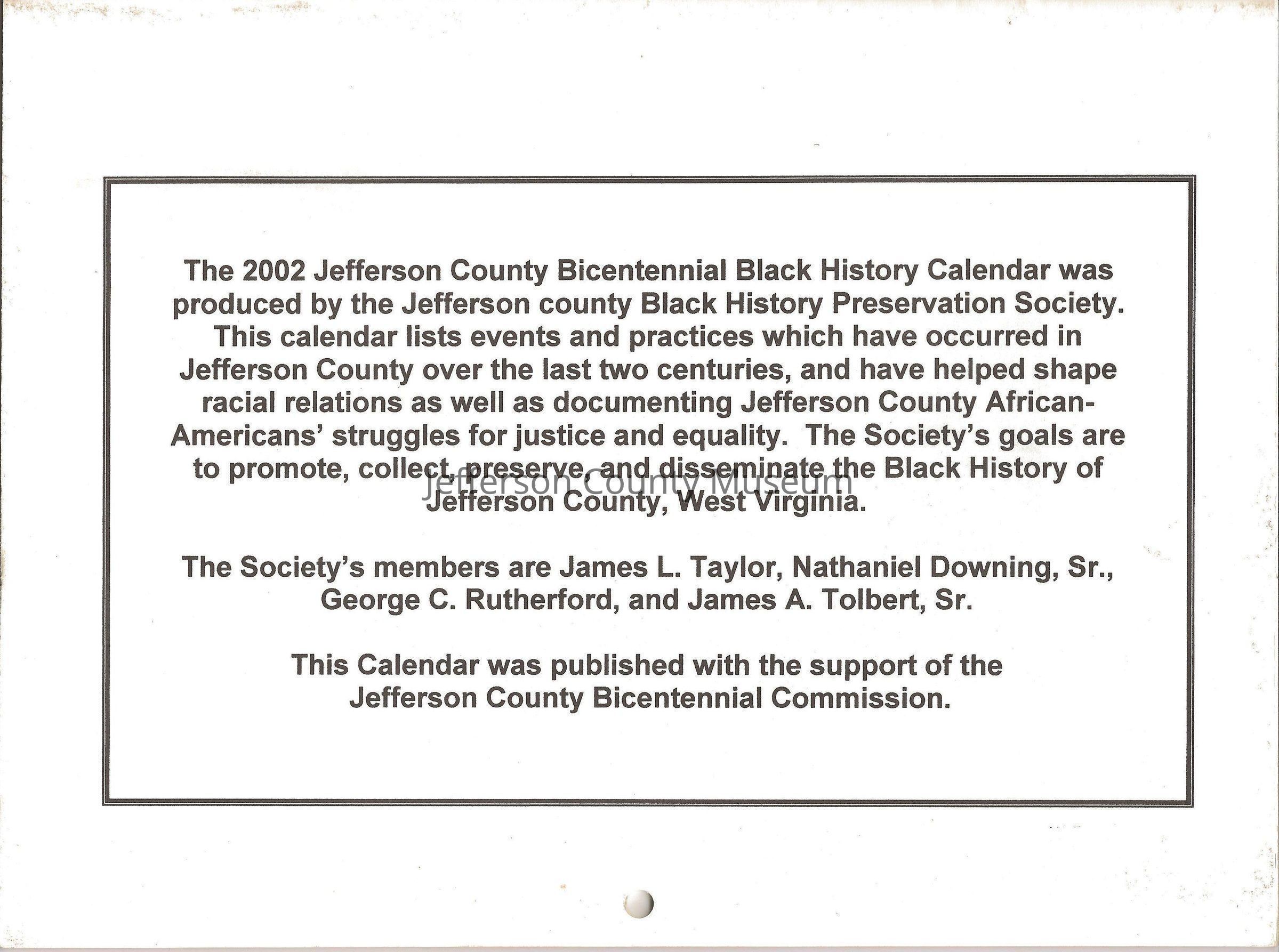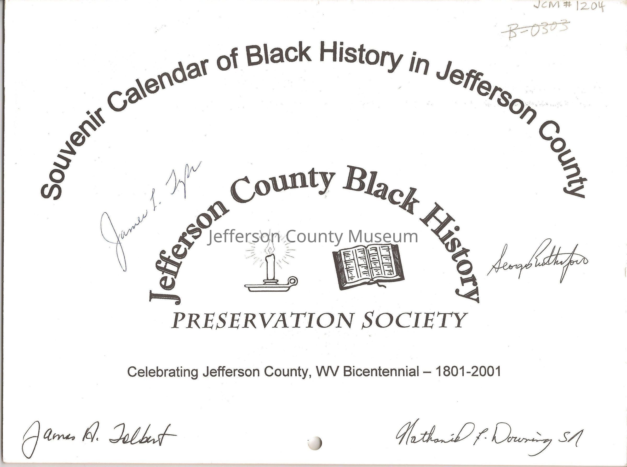 2002, twelve-month calendar; off-white paper with black print and text. Cover reads: Souvenir Calendar of Black History in Jefferson County, Jefferson County Black History Preservation Society, Celebrating Jefferson County, WV Bicentennial--1801-2001. Images of a burning candle and open book are at the center of the text.
