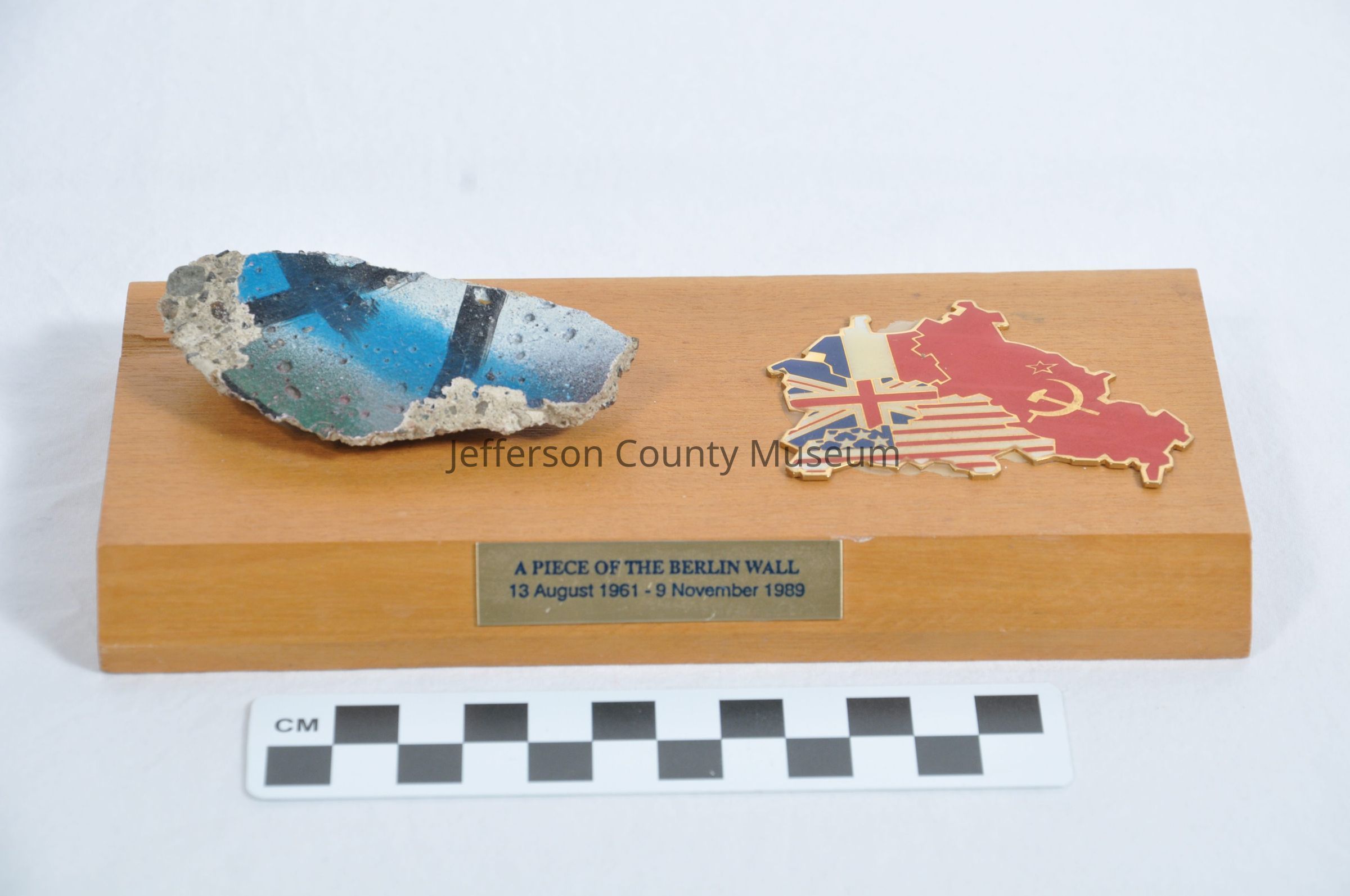 Light colored wood board with a piece of concrete with blue, black and white paint on one side. Beside it on the board is an outline of the city of Berlin, Germany showing the division of the city into French, British, American and Soviet sectors. The sectors are in the colors of those countries' flags. A small label attached to the angled front of the board says "A PIECE OF THE BERLIN WALL 13 August 1961 - 9 November 1999".Acquisition