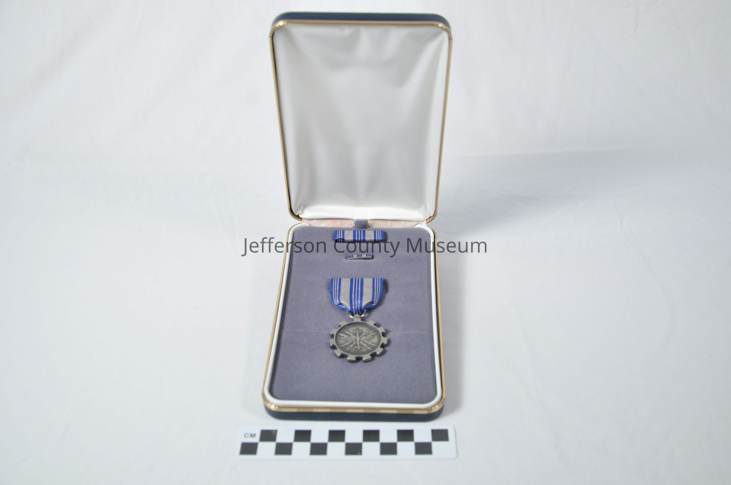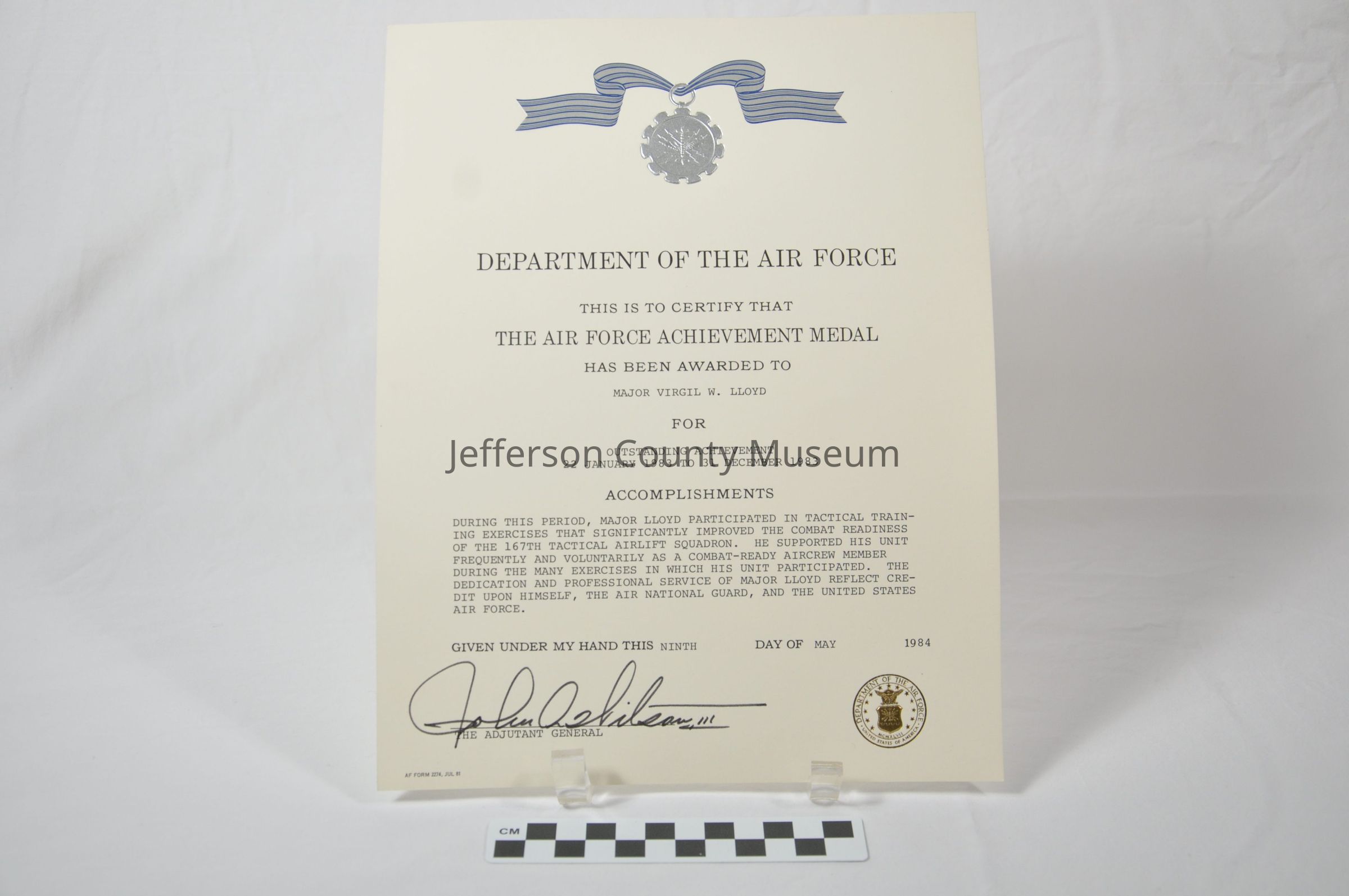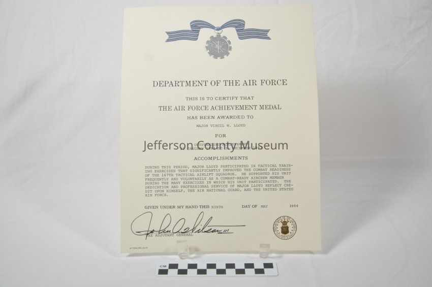 Air Force Achievement Medal in blue and silver padded box awarded to the then Major Lloyd. Medal is dark silver in color, is round and has teeth of a gear. In center is twisted rope shape surrounded by arrows and outspread wings. On back is "AIR FORCE MERITORIOUS ACHIEVEMENT". Ribbon above medal has silver and blue stripes. With medal is small lapel pin and small silver and blue ribbon for uniform. Citation has image of the medal and outlines his outstanding achievements during the period 22 January 1983 to 31 December 1983.