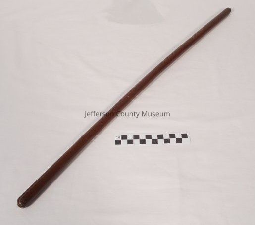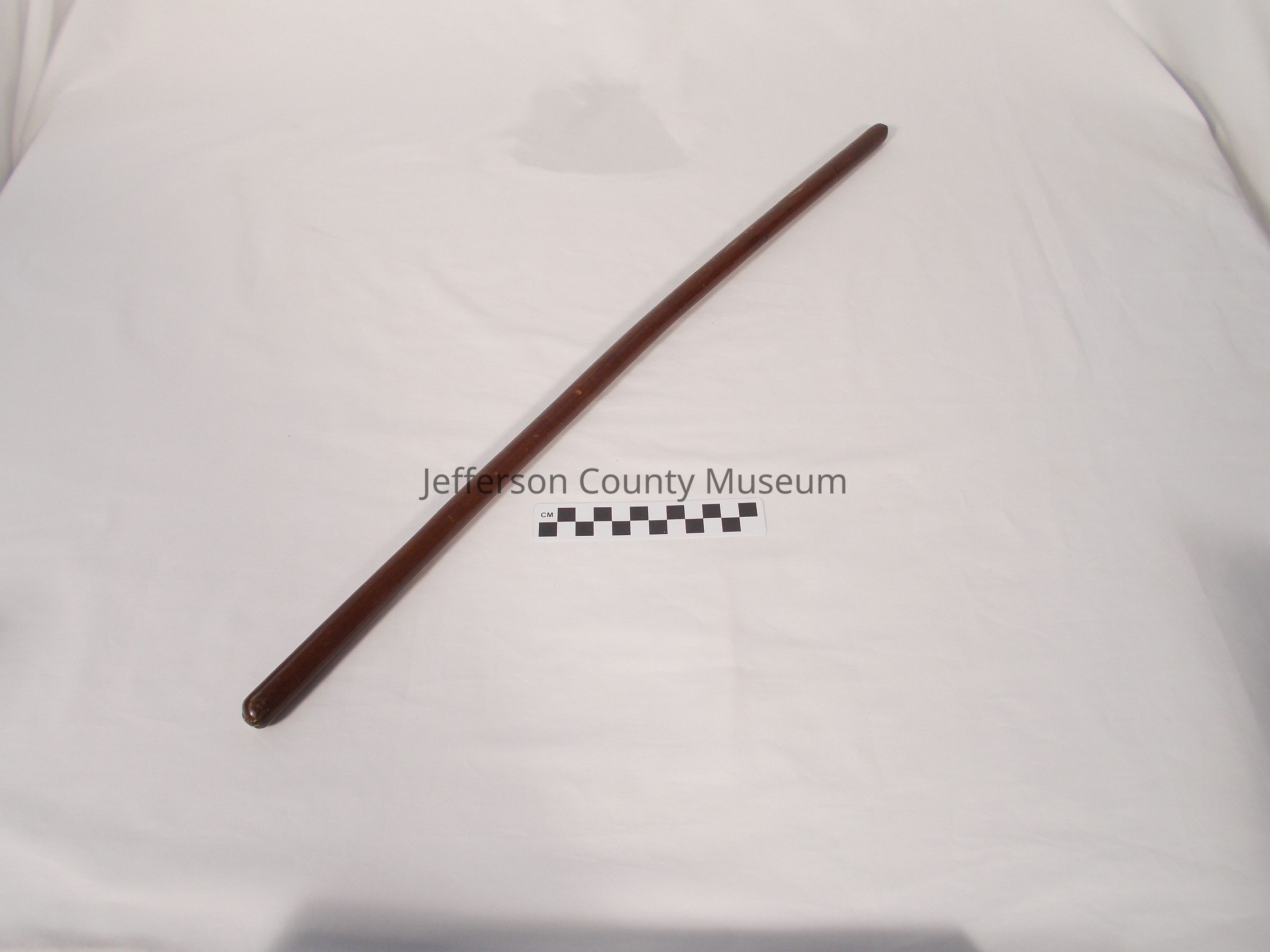 Leather bound stick. Stitching down entire length. Rounded on both ends. Slightly curved.