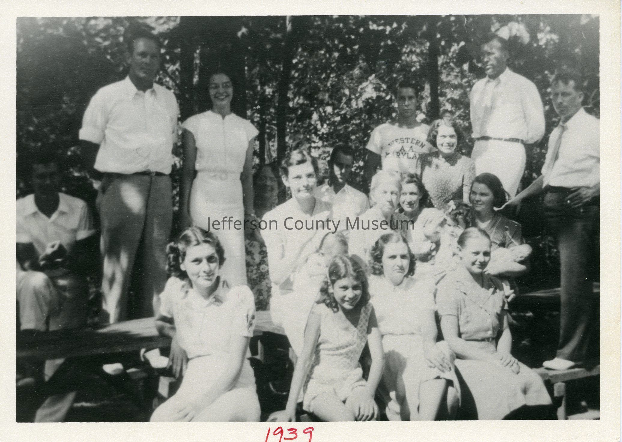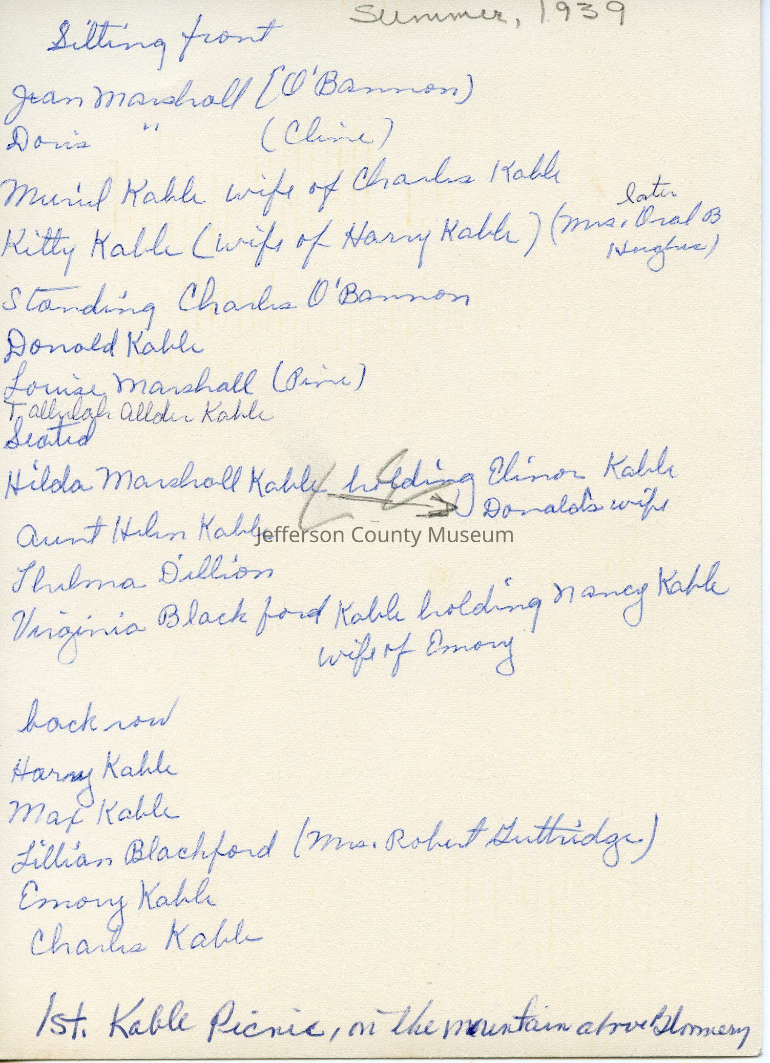 Sitting front: Jean Marshall (O'Bannon), Doris Marshall (Cline), Muriel Kable (wife of Charles Kable), Kitty Kable (wife of Harry Kable, later Mrs. Oral B. Hughes), standing Charles O'Bannon, Donald Kable, Louise Marshall (Pine), Tallulah Allder Kable.