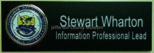 Black plastic name tag. Circular seal for the U.S. Navy's Information Dominance Corps Reserve Command is on the left side. "Stewart Wharton Information Professional Lead" is printed in white text to the right of the seal. Two pin tacks with backings protrude from the back of the plastic tag. See Notes for more information about the Information Dominance Corps.