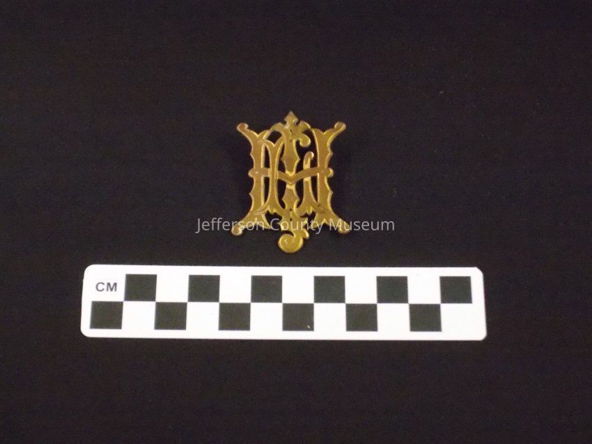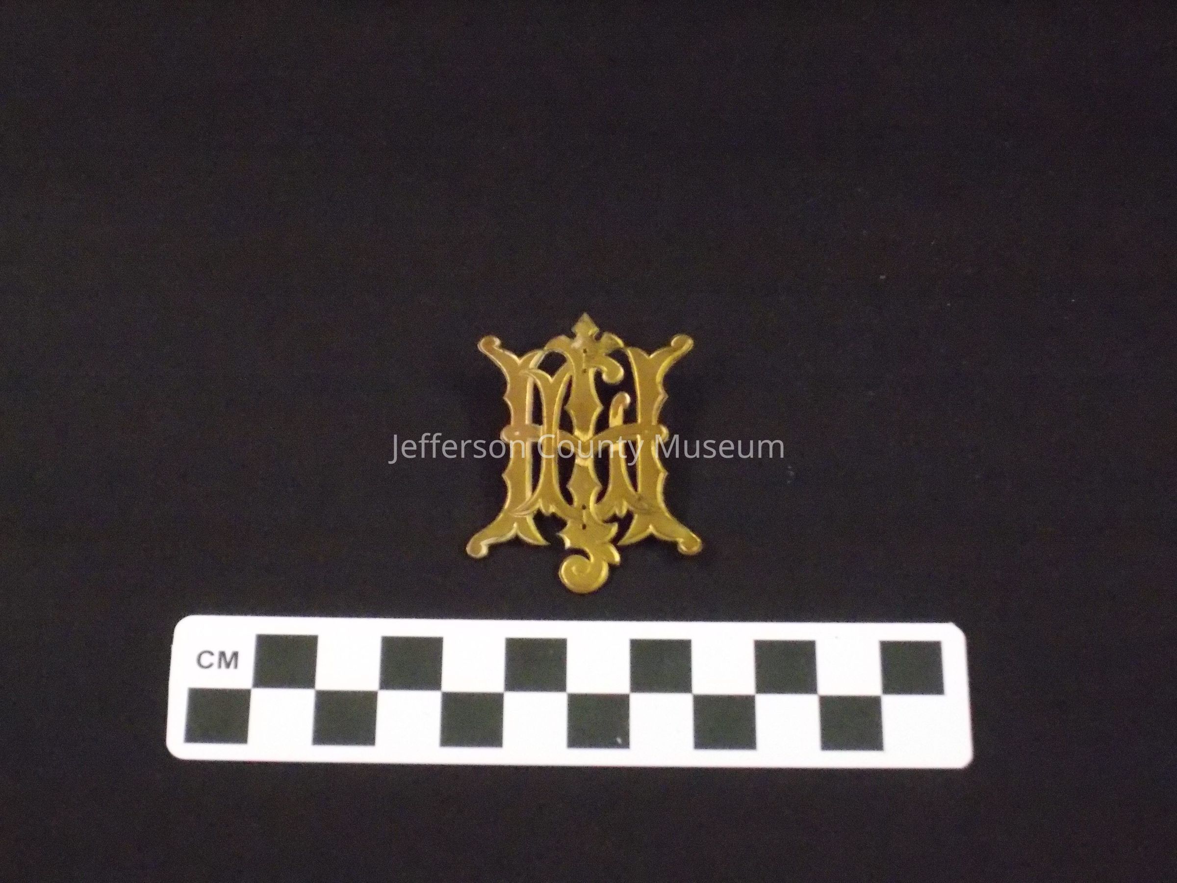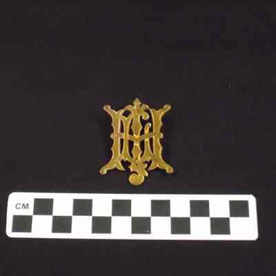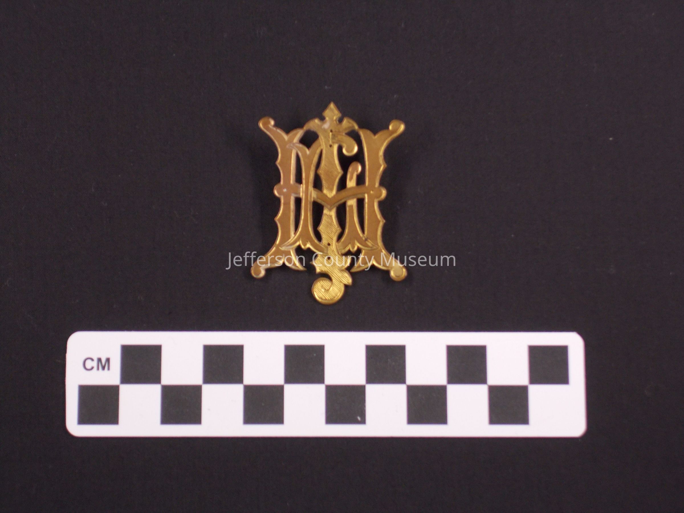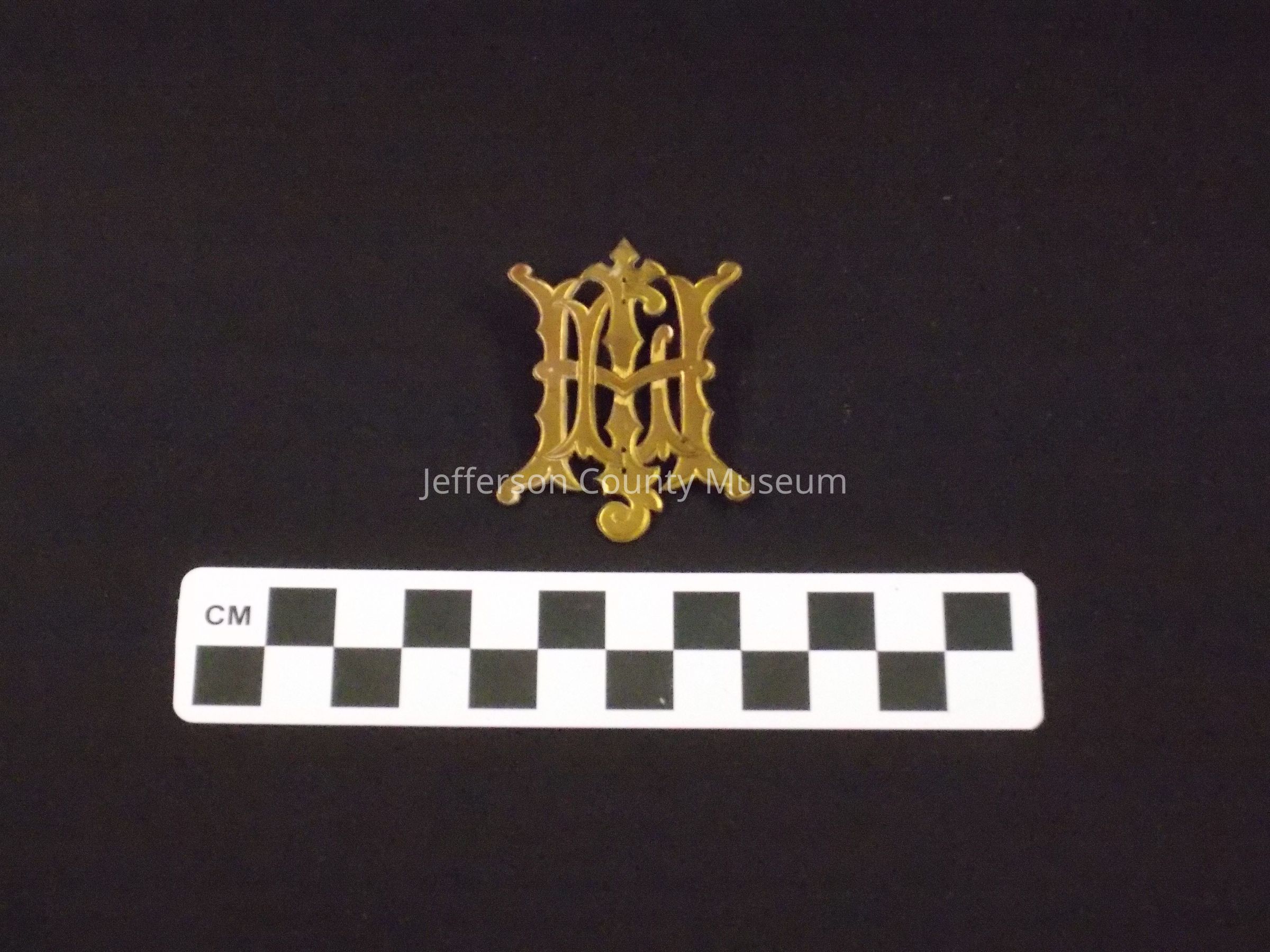 Thin, flat, gold-colored metal brooch in the shape of Harriet Lane Johnston's monogram. The most prominent letter in the monogram is H, while the other letters appear to include some or all of the initials R, L, and/or J. Straight pin with clasp across the backing. There is a name inscribed in the back of the brooch, possibly "Lougo"? Item is likely associated with Harriet Lane Johnston, due to the initials and its presence in her jewelry box.Acquisition