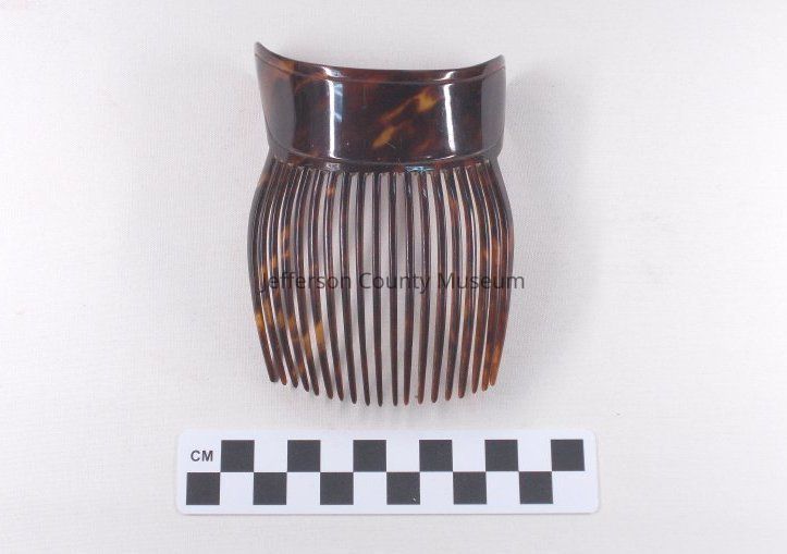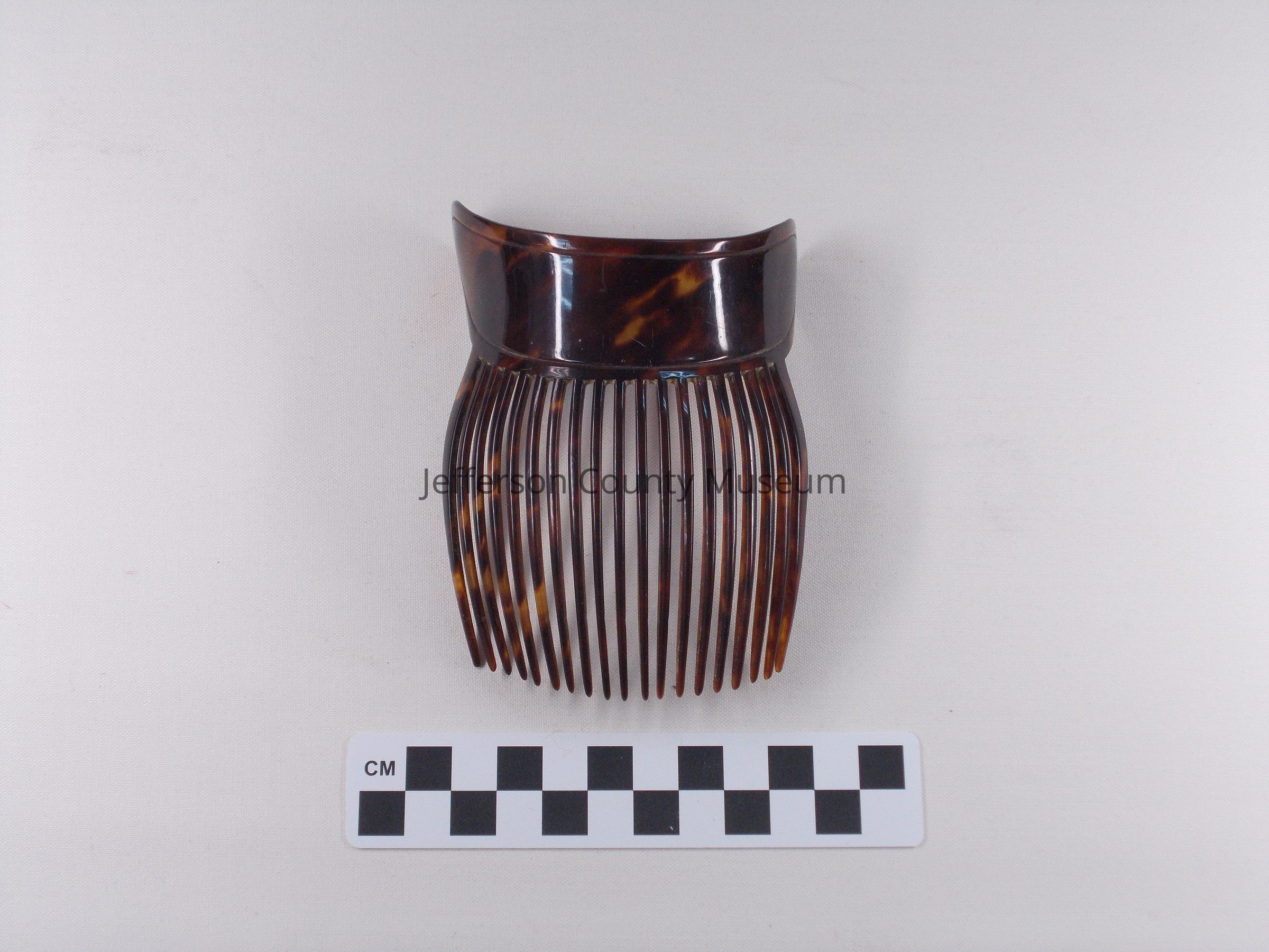 Ornamental, moulded French tortoise shell hair comb. Curved handle, or top piece without decoration except for one line border engraved around its edge. 19 curved tines protrude from the bottom.Acquisition