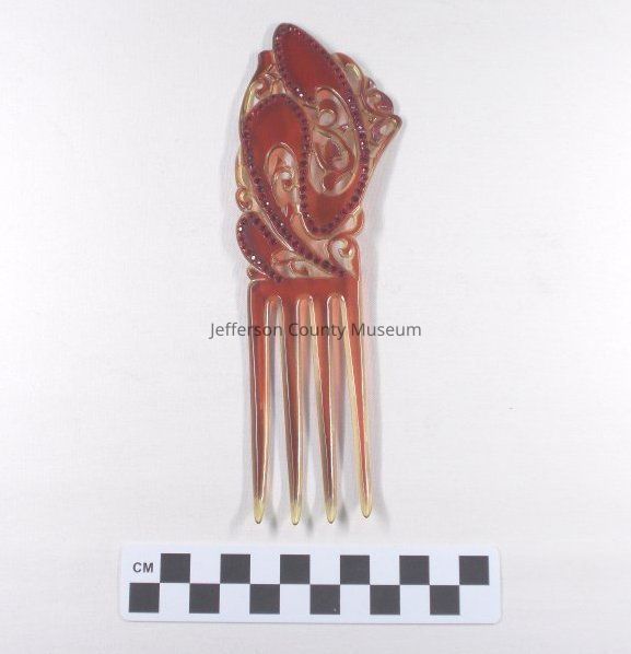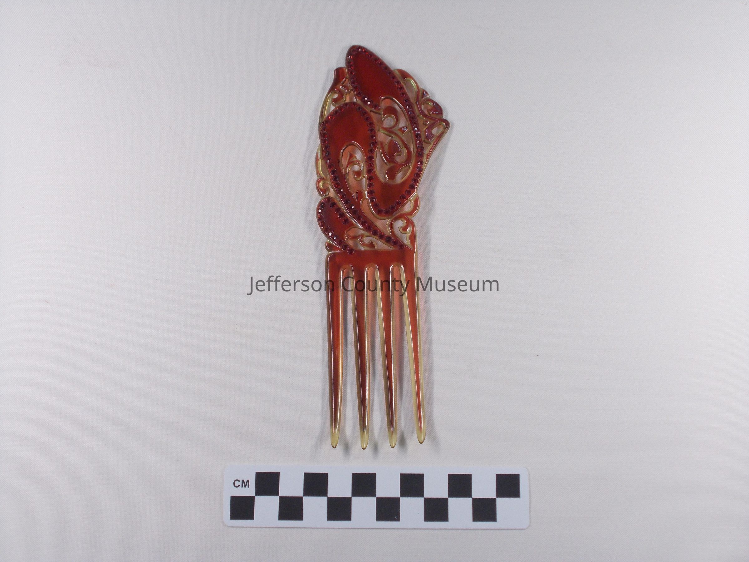 Ornamental, moulded hair comb made of tortoise shell. Stylized handle or top piece in light yellow and darker amber shell, with red-pink inlaid jewels. Slightly curved. Four tines are protruding from the bottom.Acquisition