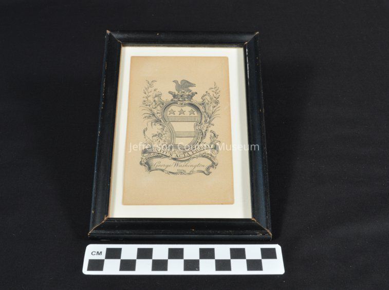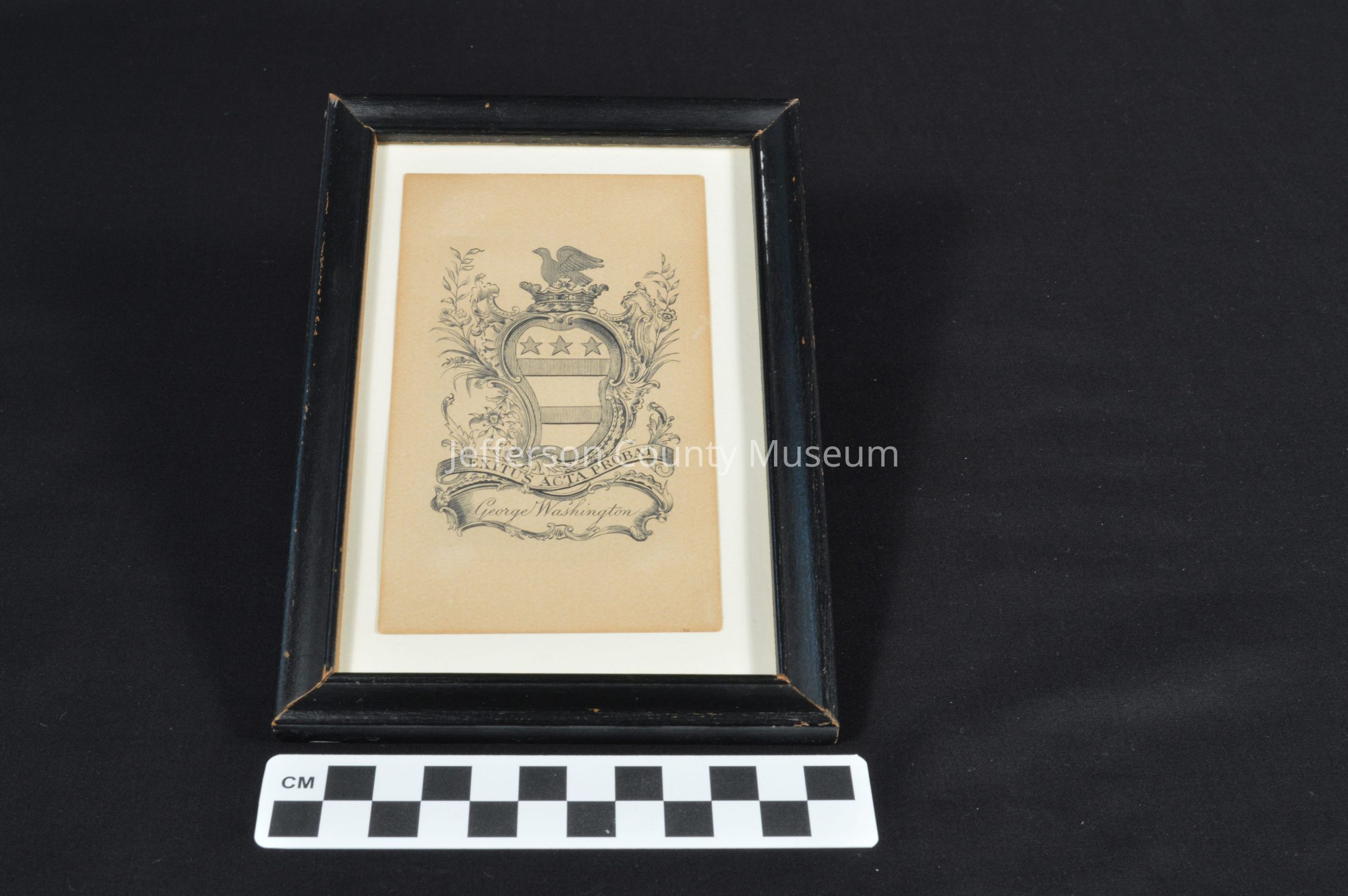 Bookplate or book label of George Washington's displayed in a painted black wooden frame. Bookplate is black ink printed on discolored paper. Bookplate shows Washington's family seal, with a bird perched on top; a banner below the seal includes the motto “Exitus acta probat” (meaning: the end shows the deed). Below the banner is George Washington's name.