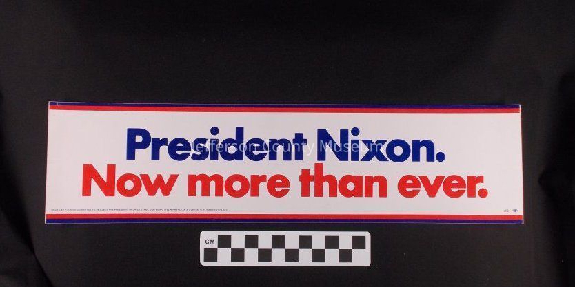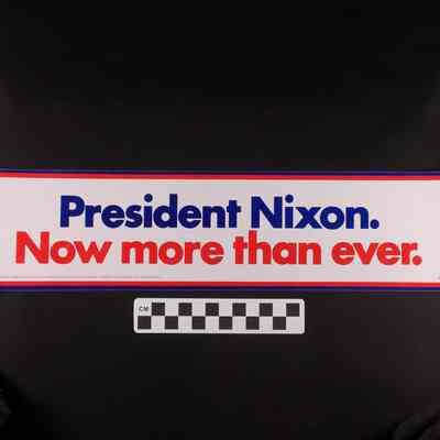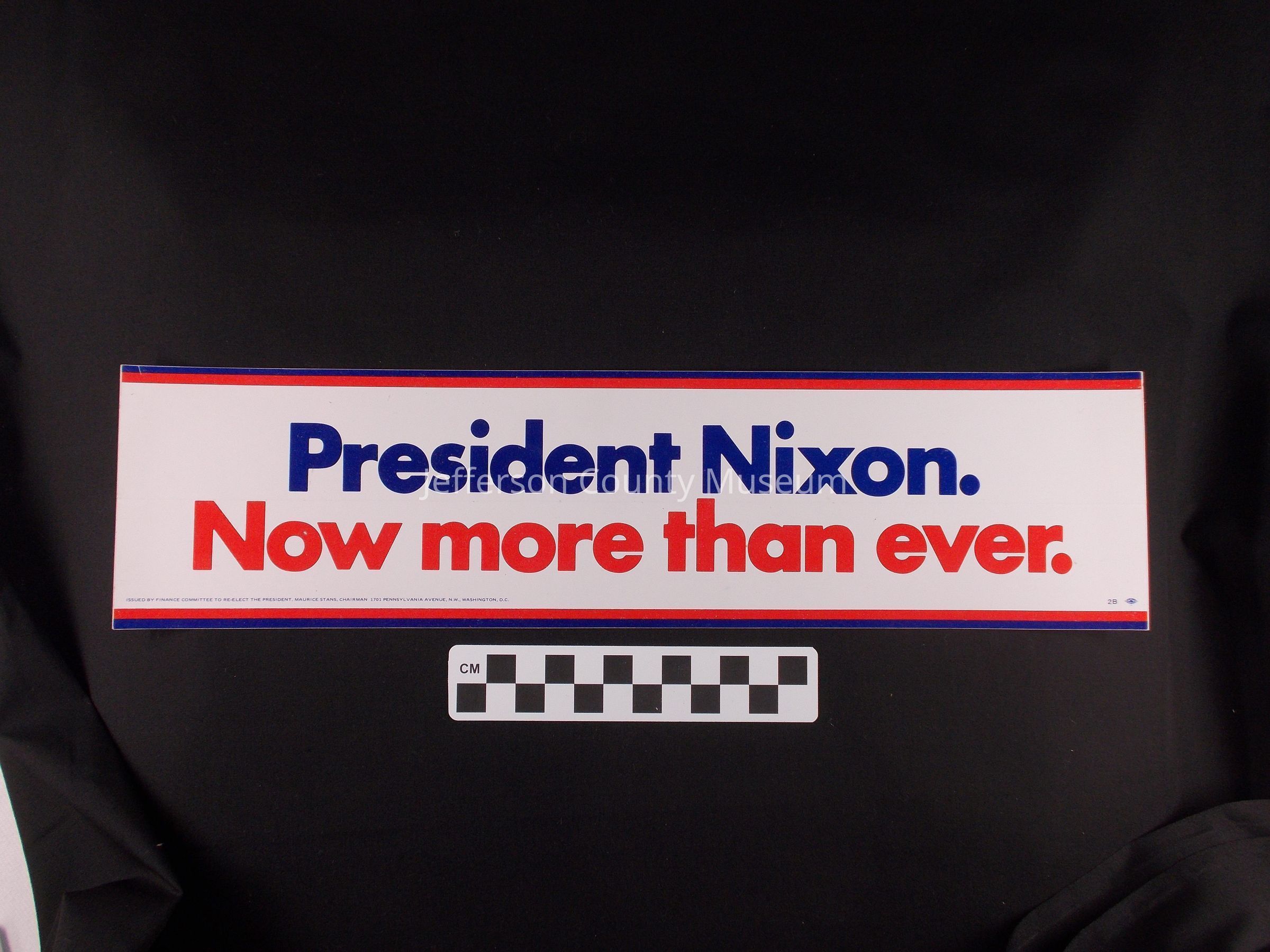 a - Red, white and blue bumper sticker that reads: "President Nixon. Now more than ever." 13.75" long
