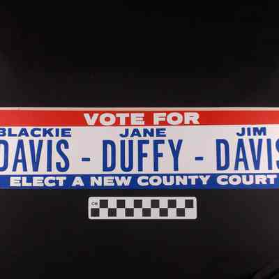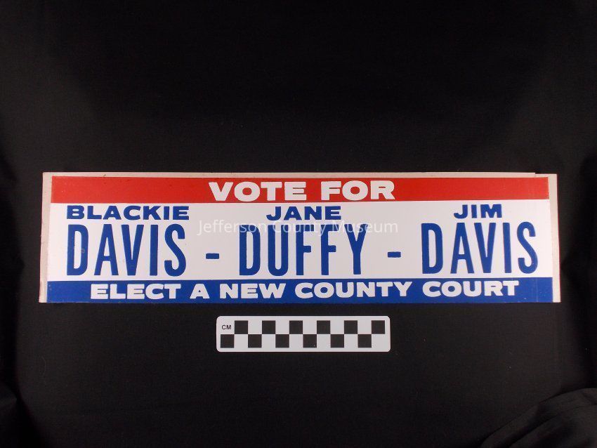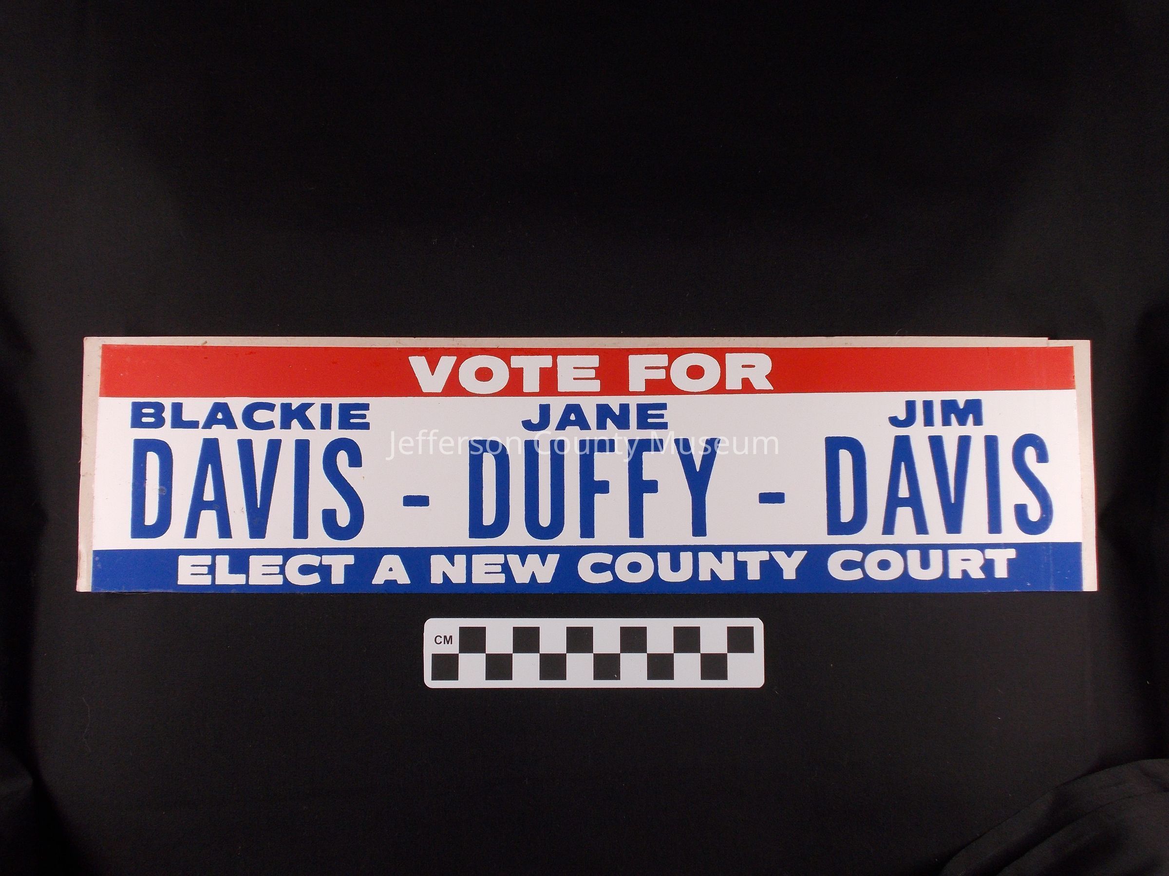c - Red, white and blue bumper sticker that reads: " Vote for Blackie Davis - Jane Duffy - Jim Davis Elect a New County Court." 14.75" long