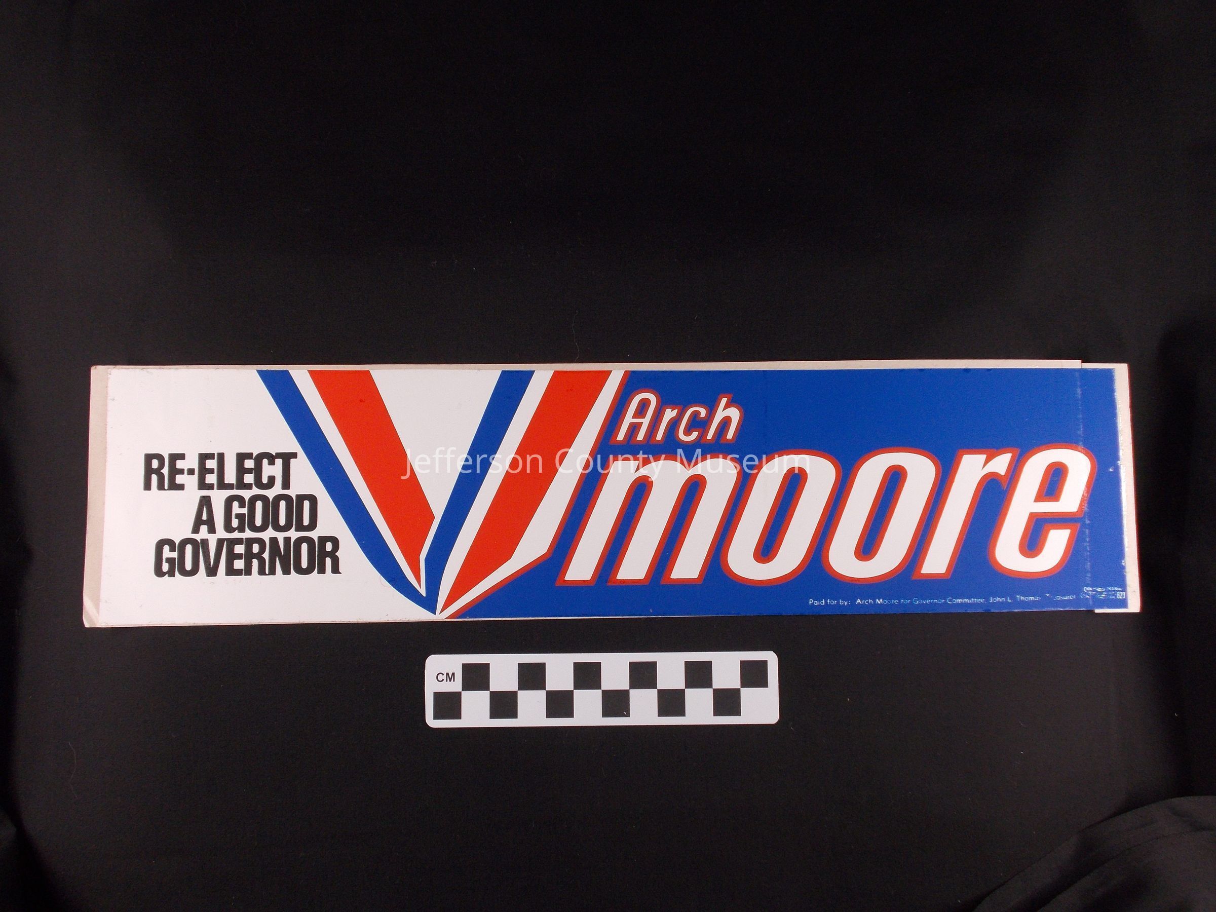 b - Red, white and blue bumper sticker that reads: "Re-elect a good Governor; Arch Moore." 14.75" long