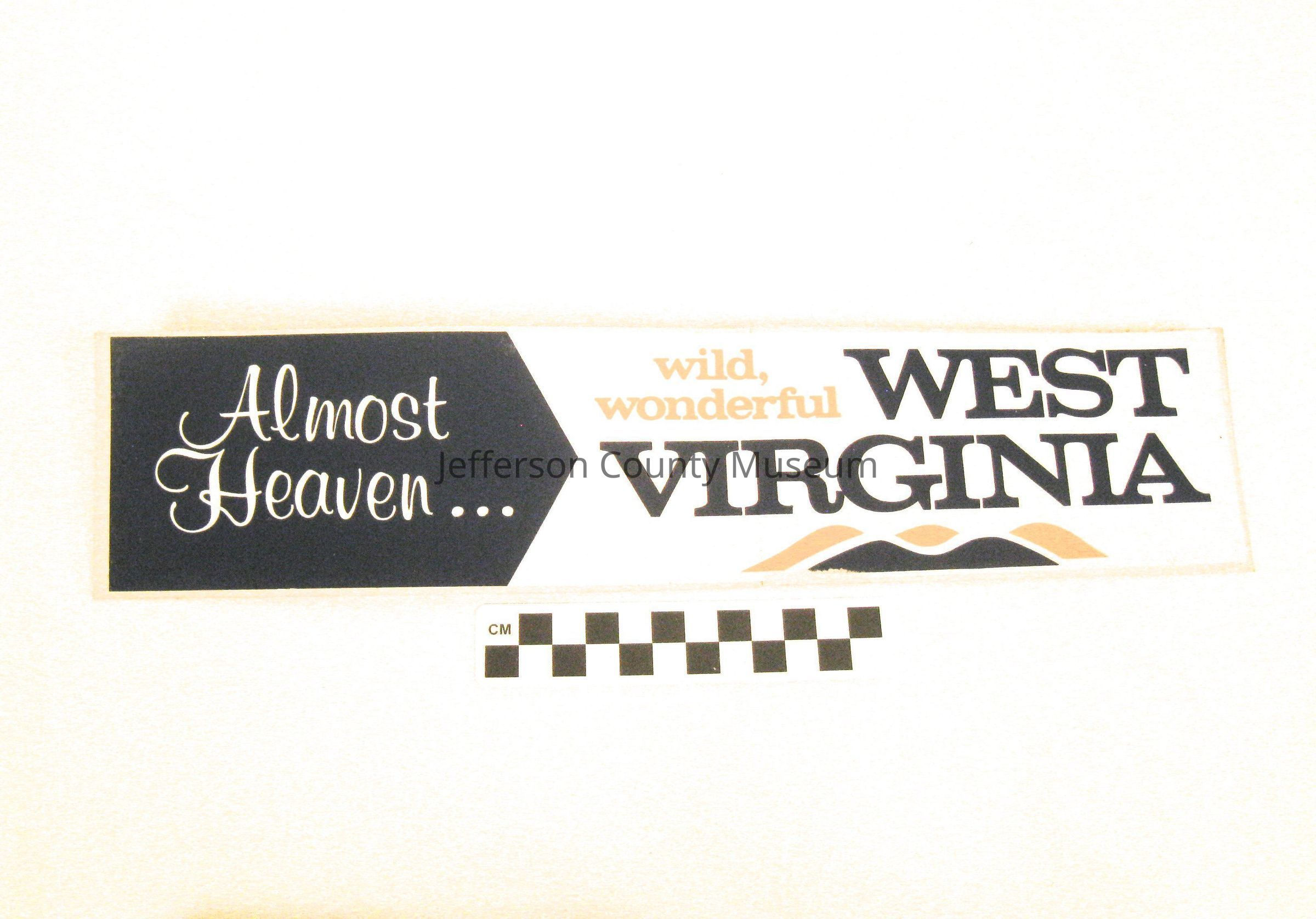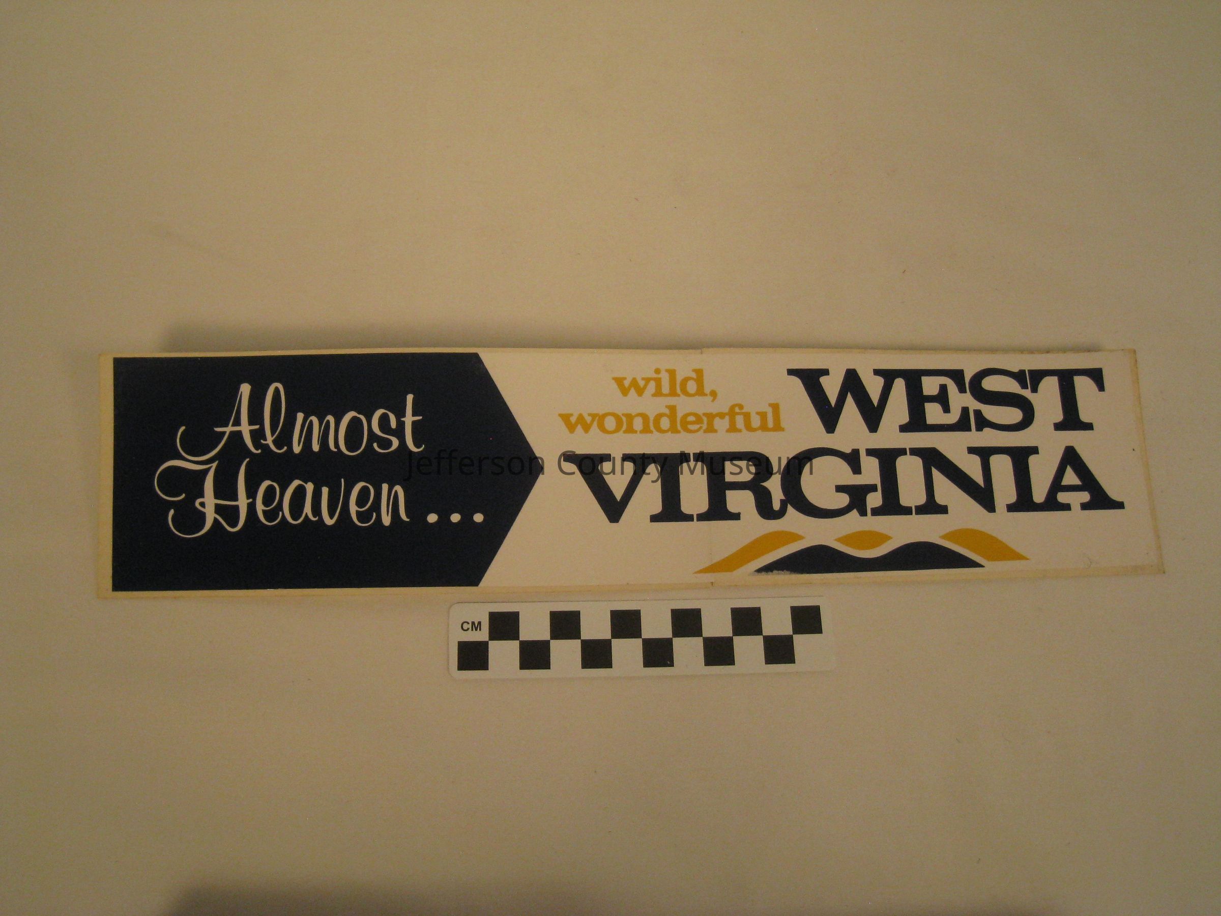 20th Century white, blue and yellow bumper sticker that reads: "Almost Heaven... wild, wonderful West Virginia." Abstract image of mountains below text.Acquisition