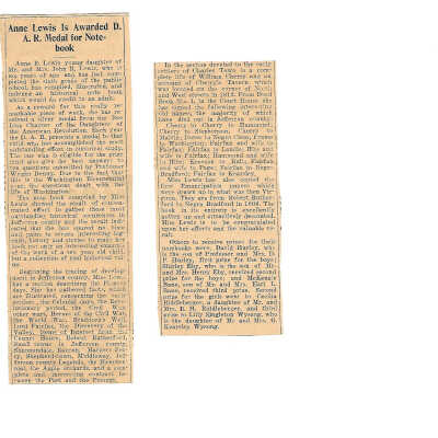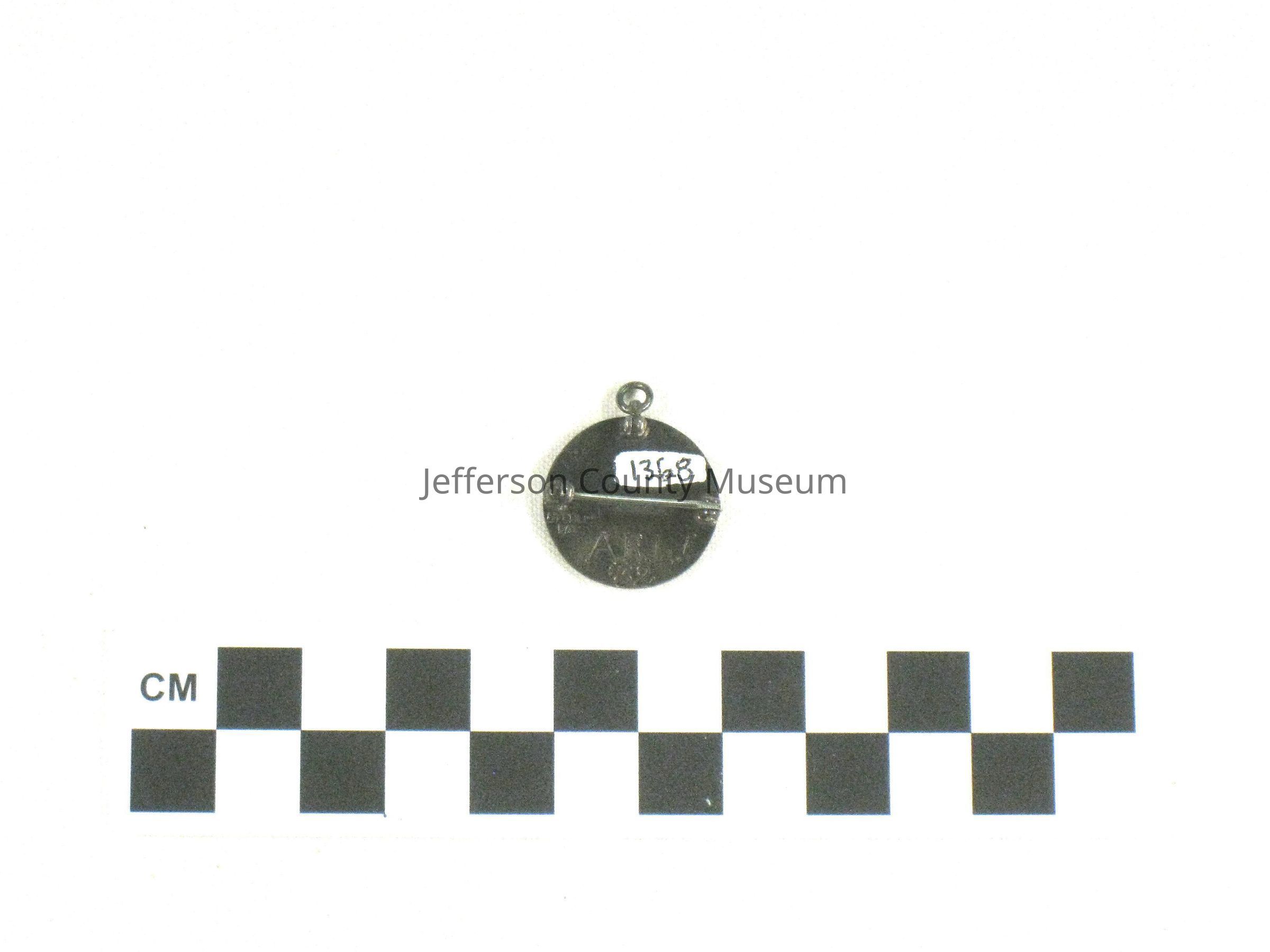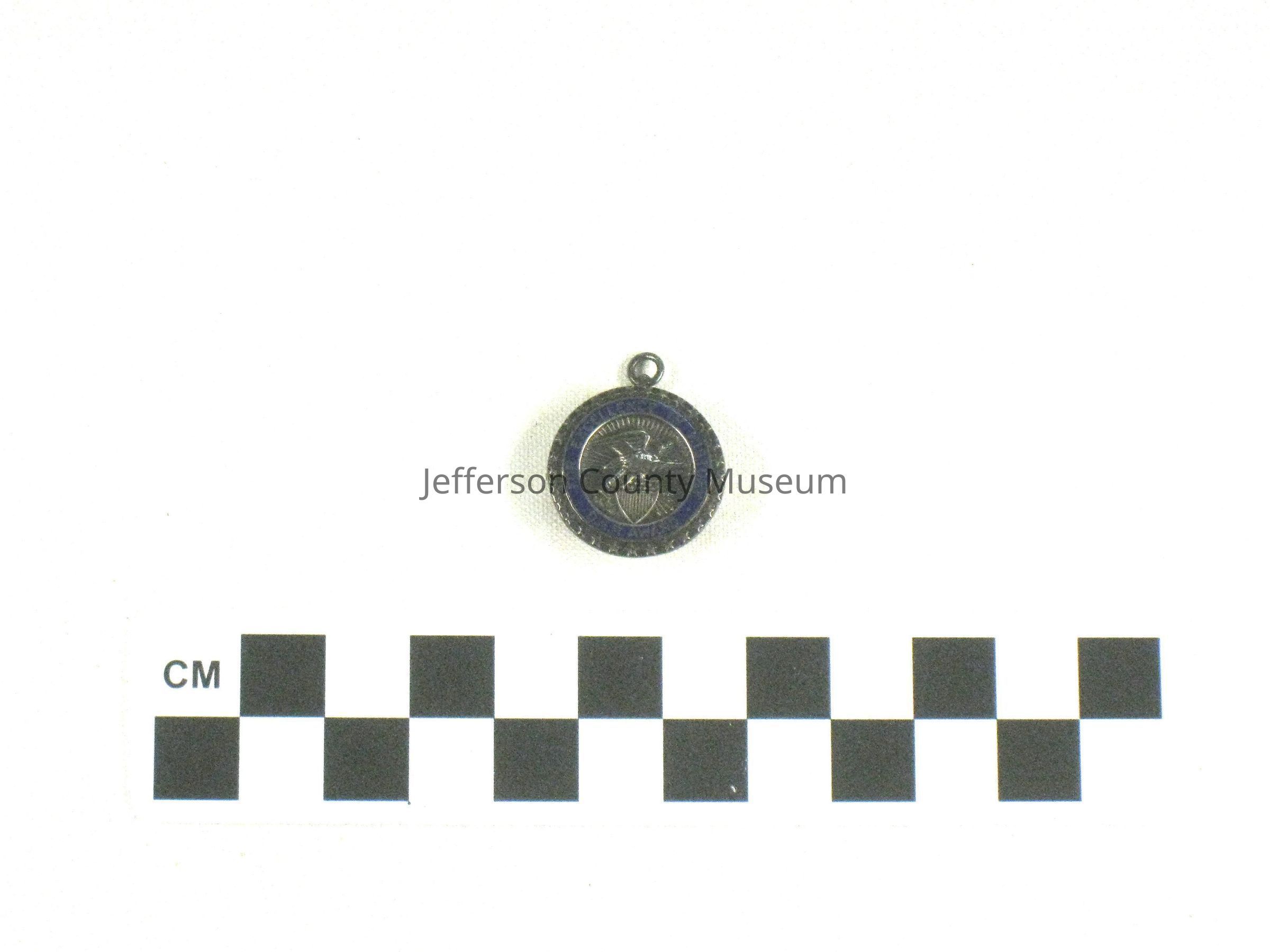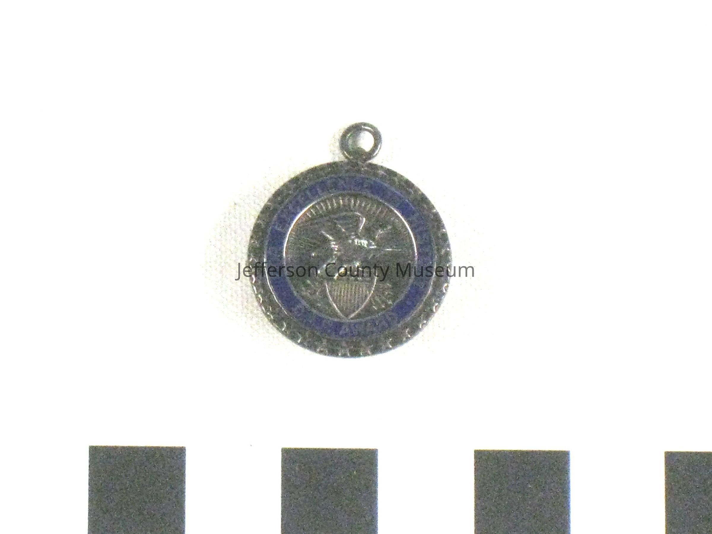 Round, metal pin with top loop for wearing on a chain as a necklace. Front of pin reads: FOR EXCELLENCE IN HISTORY - D.A.R. AWARD. Text is on blue background that encircles an engraved image of an eagle atop a shield. A ring of stars is around the blue band with text.