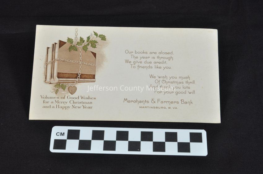 Single-sided advertising card with Christmas and New Years greeting from Merchants and Farmers Bank in Martinsburg, West Virginia. A color drawing of two ledger books wrapped in a locked chain and vines appears to the left of the text.Acquisition