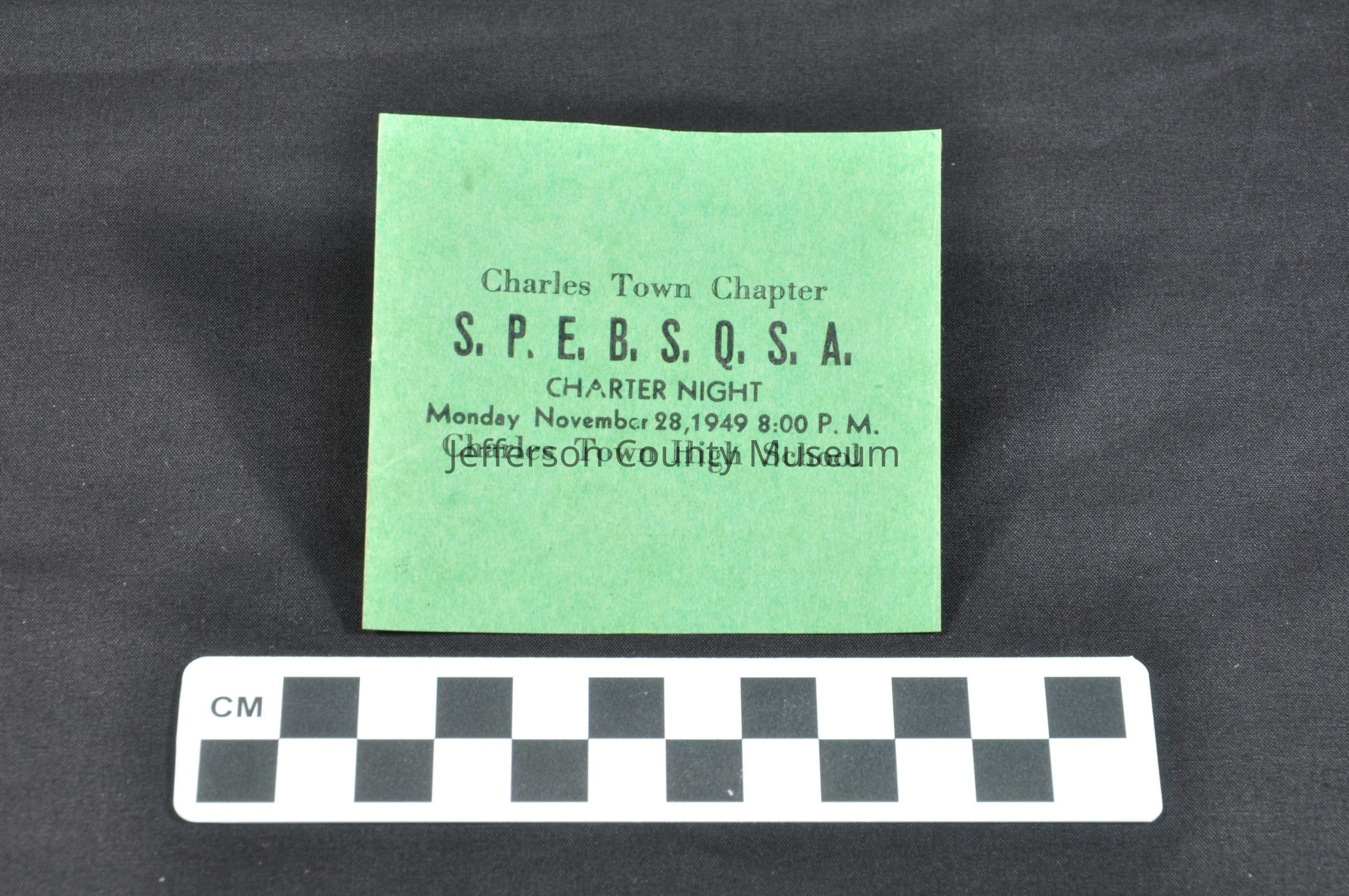 Ticket or invitation. Green square of paper that reads: Charles Town Chapter S.P.E.B.S.Q.S.A. CHARTER NIGHT Monday November 28, 1949 8:00 PM Charles Town High School.