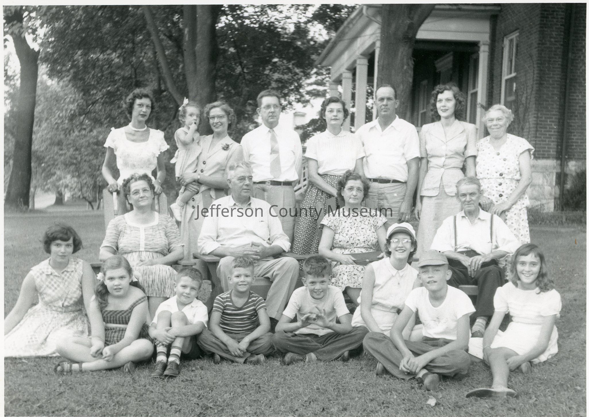 Back row, left to right: Doris Marshall (later married Don Kline), Teresa Kline?, Louise Marshall Pine, Edward Lee Pine, Hilda Marshall Kable, Donald Kable, Jean Marshall O'Bannon, Rose Marshall Baker
