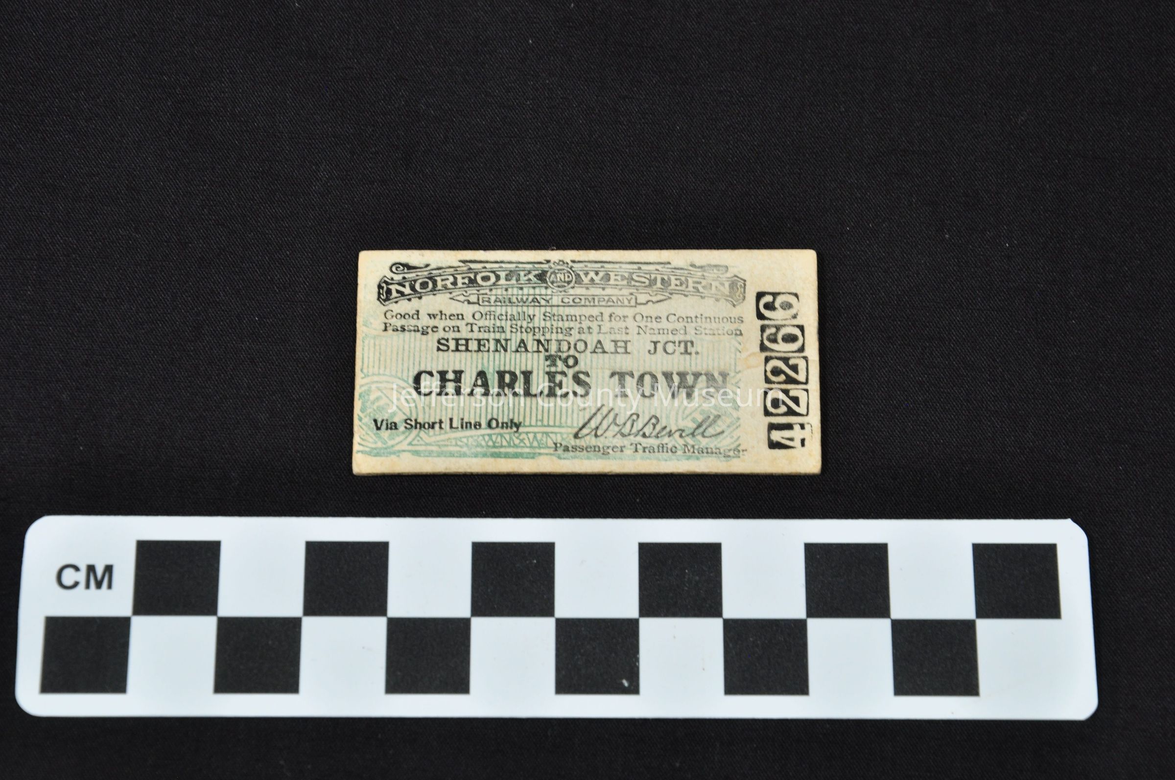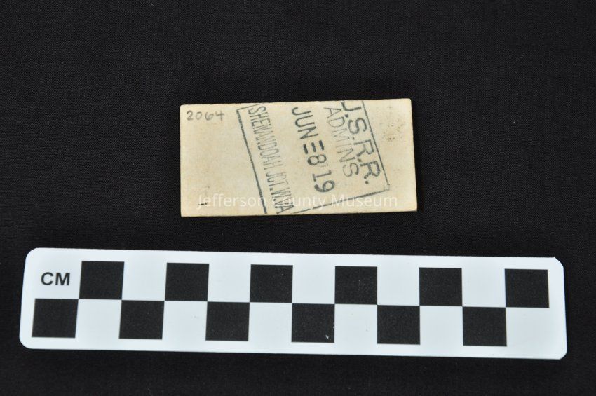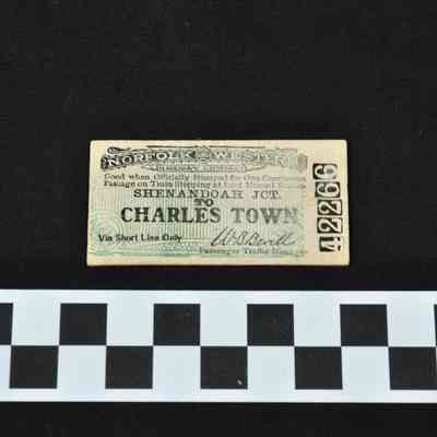 Train ticket for the Norfolk and Western Railway Company, from Shenandoah Junction to Charles Town. Back of ticket is stamped: J.S.R.R. ADMINS JUN 8 19 SHENANDOAH JCT. W.VA.Acquisition