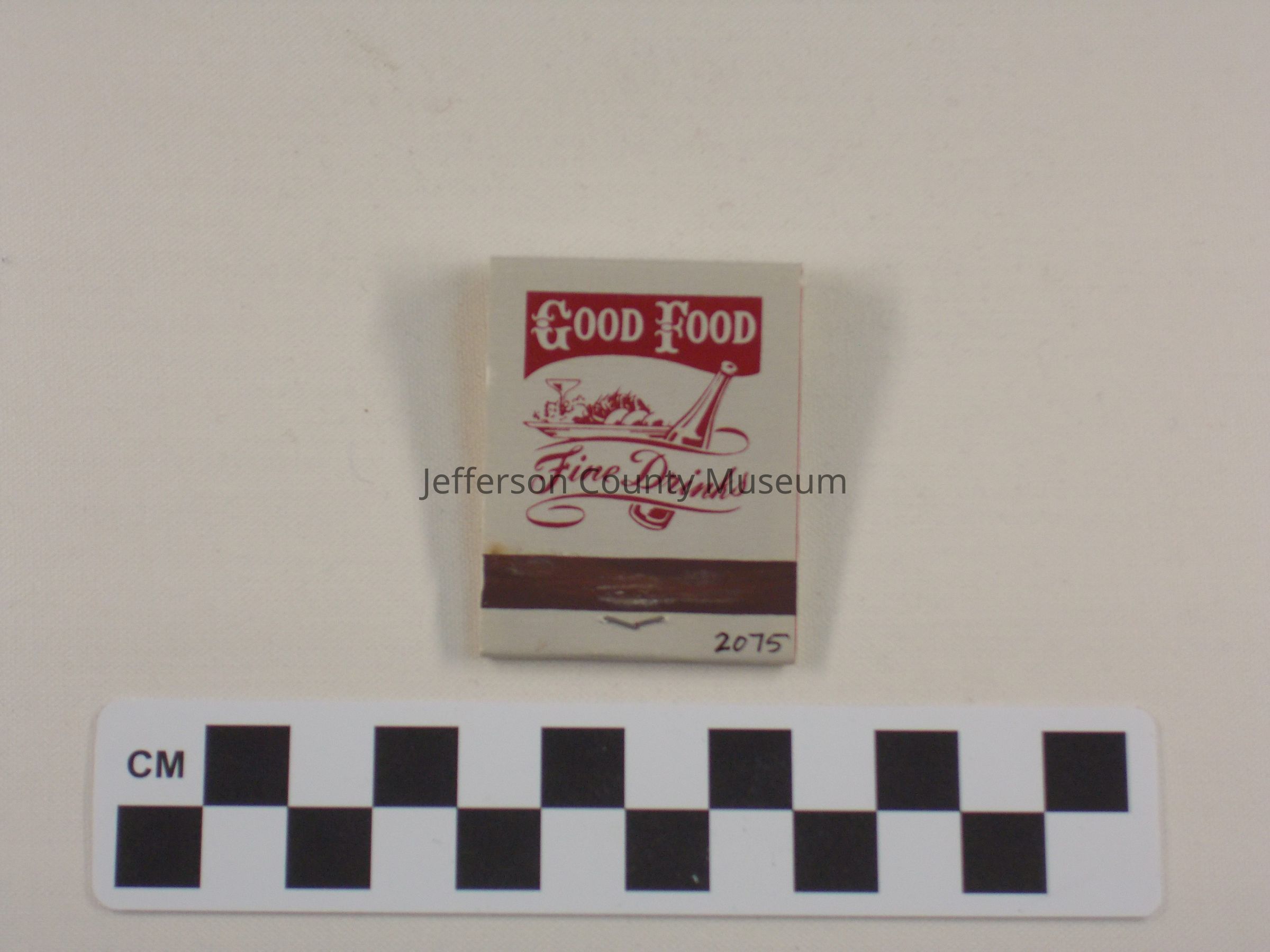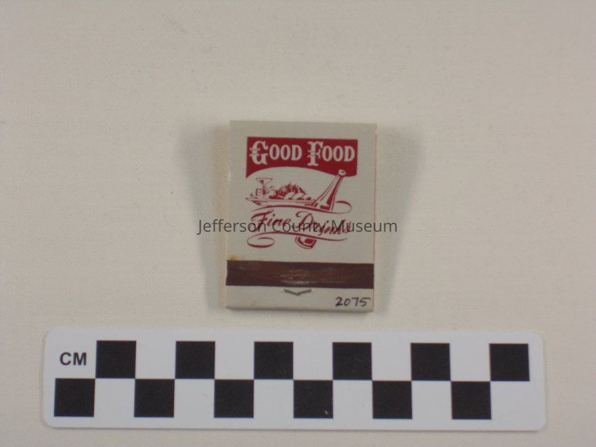 Grey and red matchbook advertising the Charles Washington Inn, a former business in Charles Town, West Virginia. Front reads: CHARLES WASHINGTON INN CIRCA 1788 ENJOY FINE DINING IN A RELAXED ATMOSPHERE. Includes the business' address as 210 West Liberty Street. Reverse of matchbook has a small image of a bottle and platter of food, with text" Good Food Fine Drinks.Acquisition