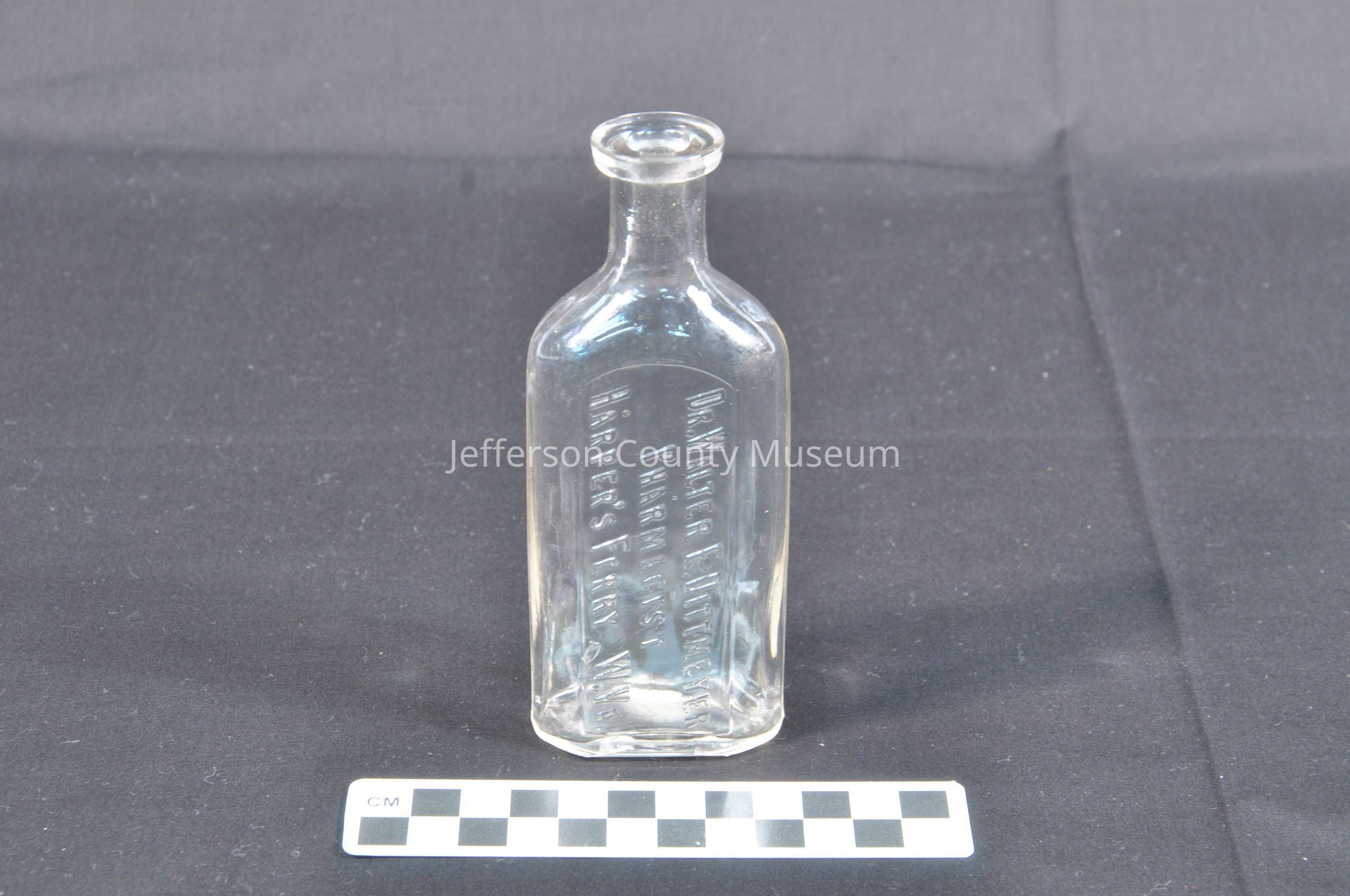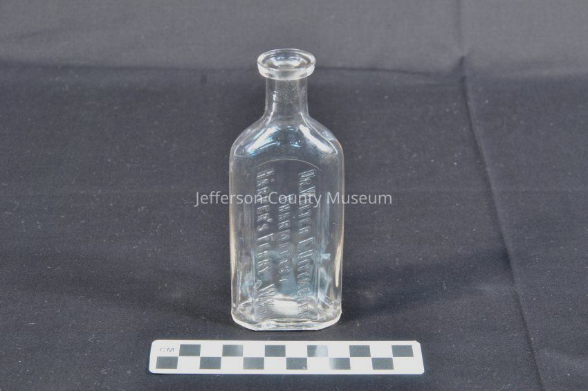 Clear, glass pharmacy bottle, embossed with text: DR. WALTER E. DITTMEYER PHARMACIST HARPER'S FERRY, W.VA.Acquisition