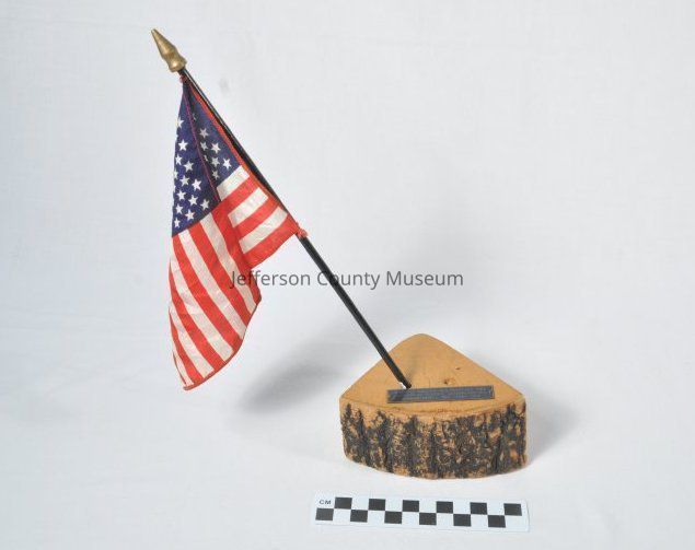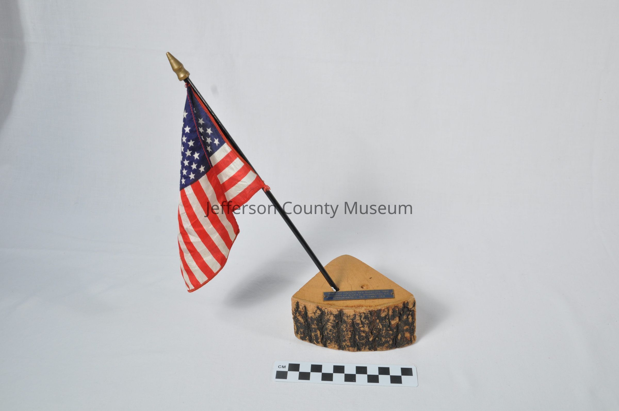 Silk, desktop-sized American flag displayed at the meetings of the Bee Line Chapter, National Society for the Daughters of the American Revolution. Flag is displayed on a base created from a slice of a tree trunk; wood block base is triangular, with the tree's bark still intact on one side. There are two holes in the surface of the top of the wood block, for the American flag, and a second flag to be displayed. Metal plate on base reads: WOOD OF HISTORIC OLD BOXELDER TREE, GROUNDS OF N.S.D.A.R.. WASHINGTON. D.C., APPROXIMATELY 150 YEARS OLD.