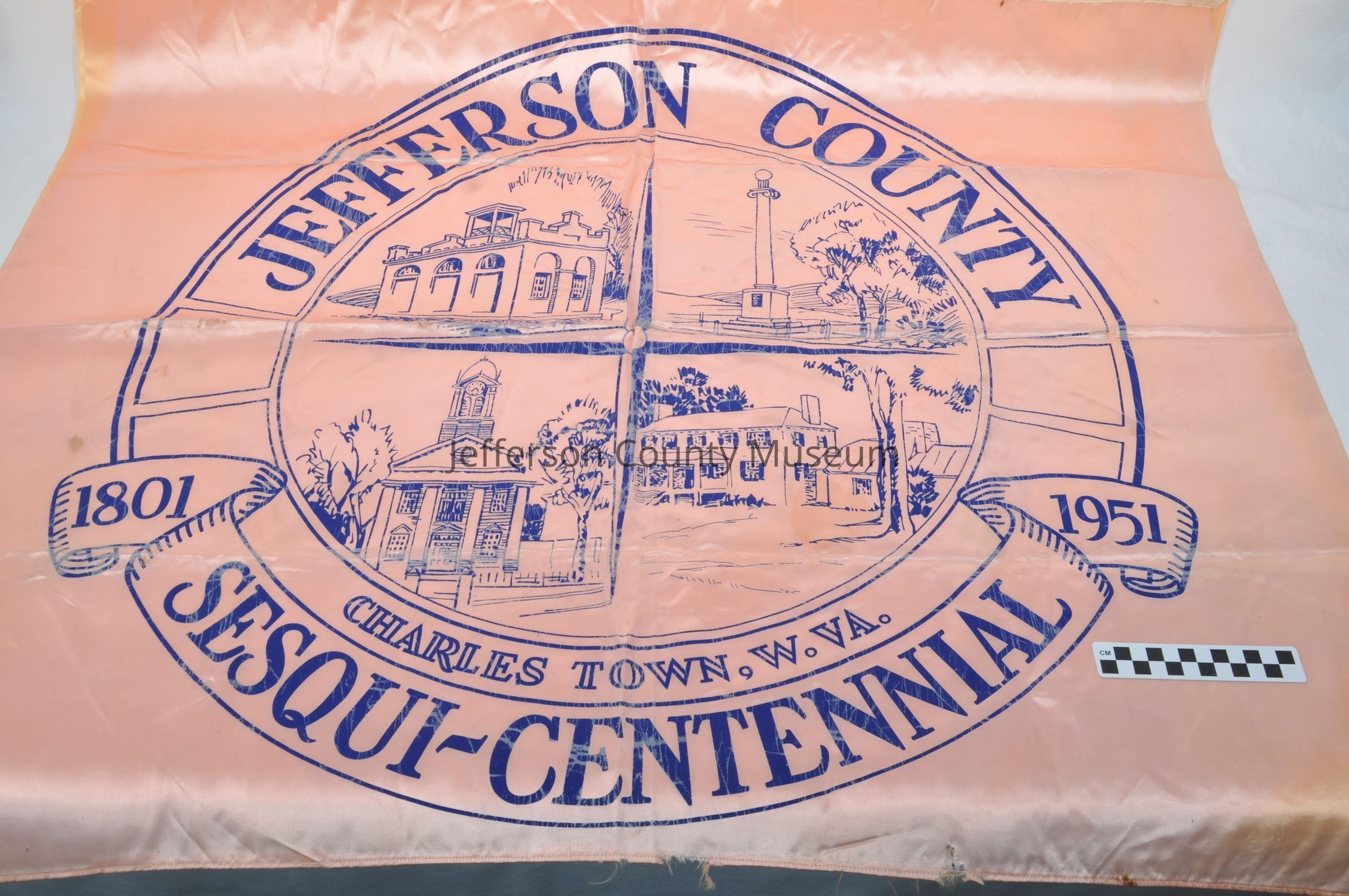 Salmon colored satin flag or banner with blue logo in a circular design. In circle are points of the compass and "JEFFERSON COUNTY SESQUI-CENTENNIAL 1801 1951 CHARLES TOWN, W.VA." Scenes depicted in circle are the firehouse at Harpers Ferry ("John Brown's Fort"), the Rumsey Monument at Shepherdstown, the Jefferson County court house, and a house with an outbuilding attached.Acquisition