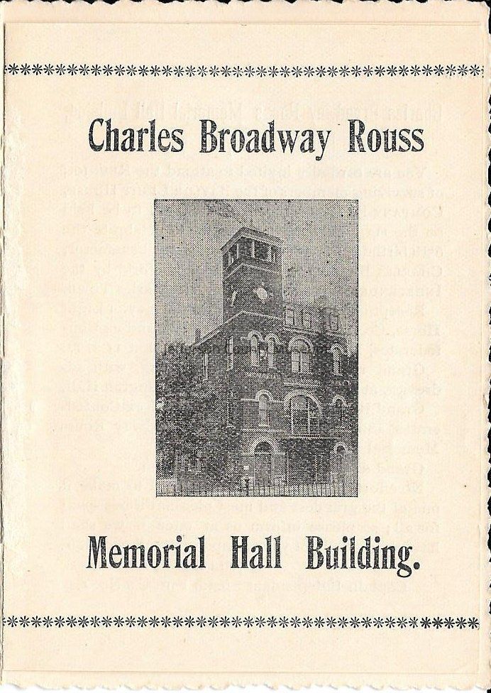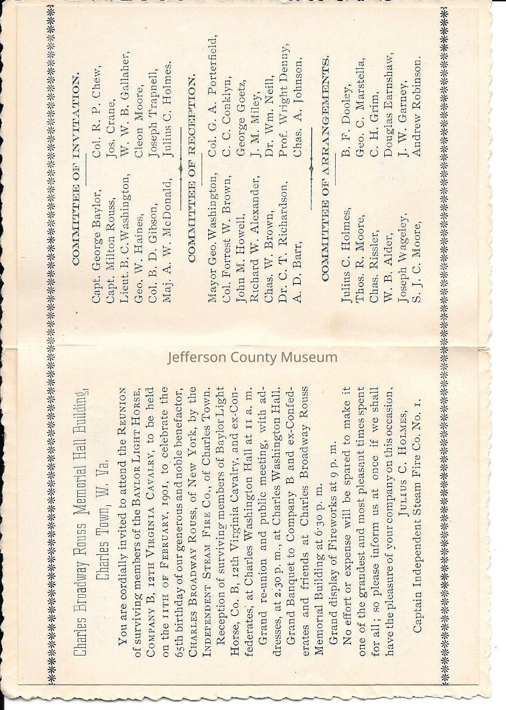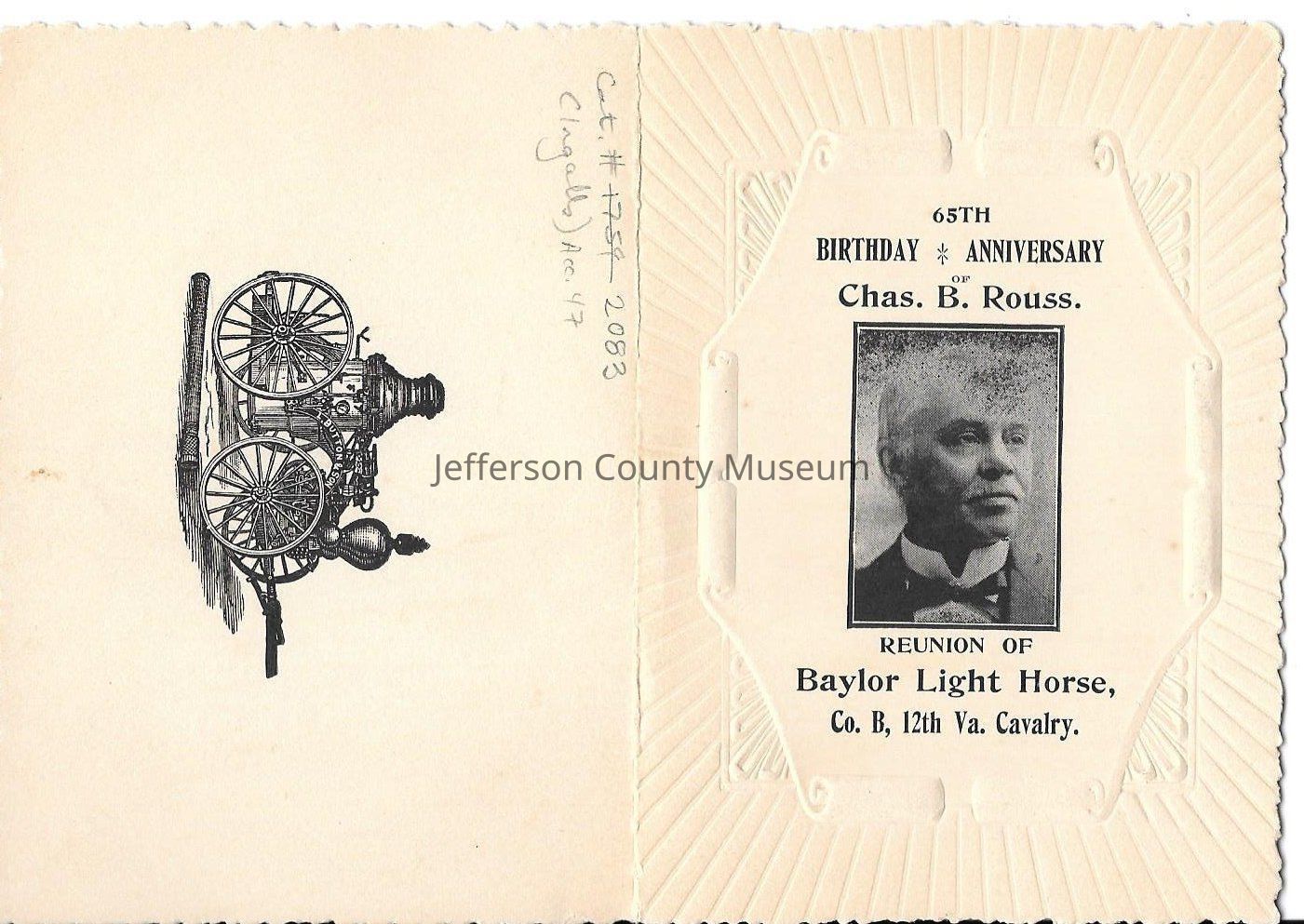 Invitation card for the reunion of the surviving members of the Baylor Light Horse Company B, 12th Virginia Cavalry in celebration of the 65th birthday of the organization's benefactor, Charles Broadway Rouss of New York. Invitation card is heavy cream colored stock with a portrait of Rouss, surrounded by text that reads: 65TH BIRTHDAY ANNIVERSARY OF Chas. B. Rouss. REUNION OF Baylor Light Horse, Co. B, 12th Va. Cavalry. Inside pages include: a title page with image of the Charles Broadway Rouss Memorial Hall Building; invitation text with program schedule by Julius C. Holmes, Captain of the Independent Steam Fire Company No. 1; and a list of the event's committee members. Back pages include black and white sketches of steam fire engines.Acquisition